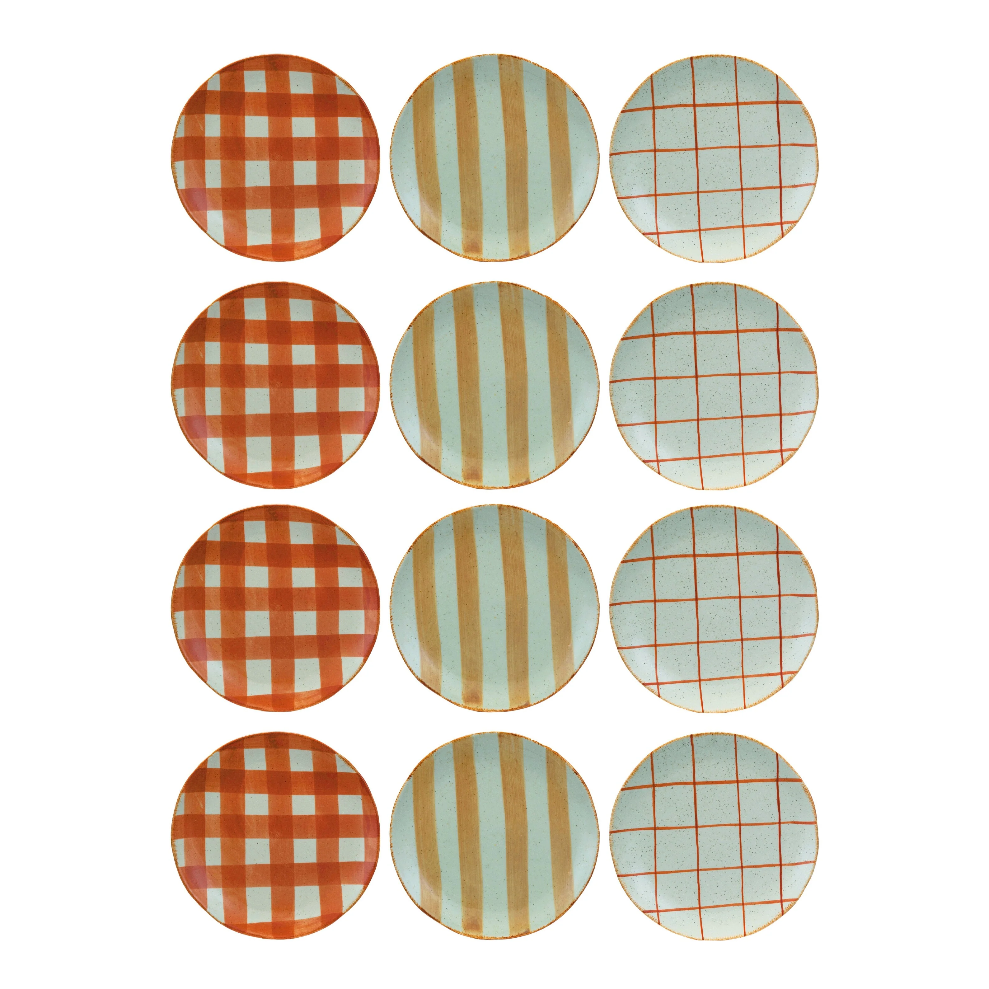 This set of 12 stoneware plates is a celebration of color and pattern, hand-painted with care to bring a unique artistic flair to the table. The lively blue and orange designs available in plaid, checkered, and square styles make each meal an occasion. With an 8-inch diameter, these plates are perfectly sized for main courses, appetizers, or desserts. Whether used for everyday dining or special gatherings, these plates are sure to impress with their craftsmanship and style.