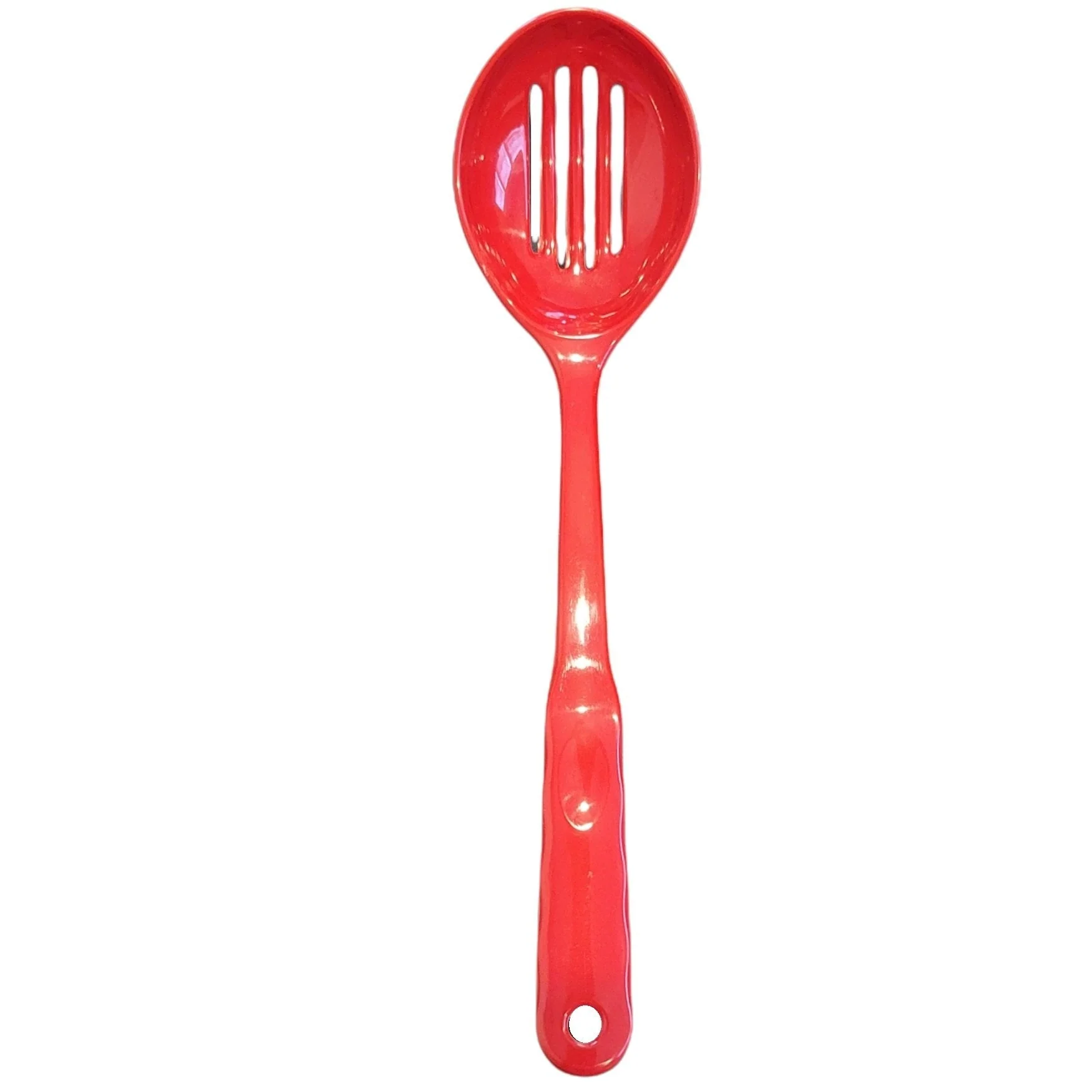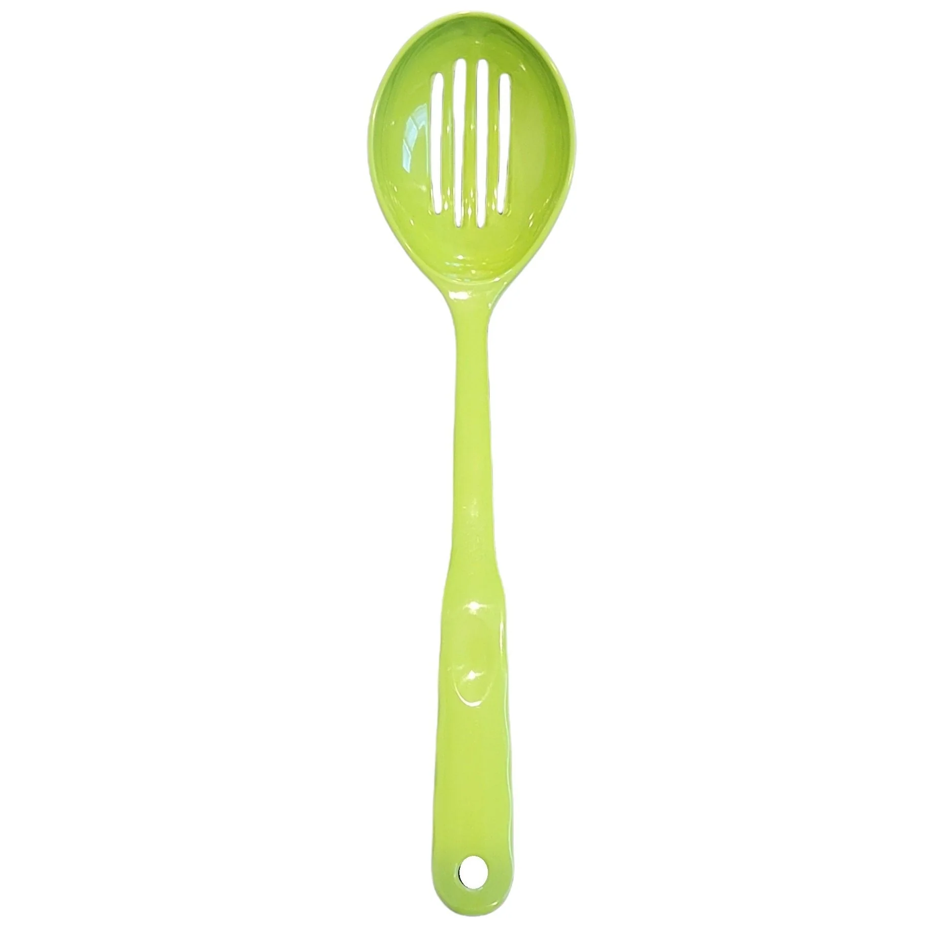 Take your kitchen from boring to fabulous with this colorful melamine slotted serving spoon. Perfect for any kitchen from home to starter apartment. A must-have for every kitchen. Use to serve up your favorite macaroni salad, dessert, and more.Measures 12.5" long overall. Made of durable melamine. Dishwasher safe.
