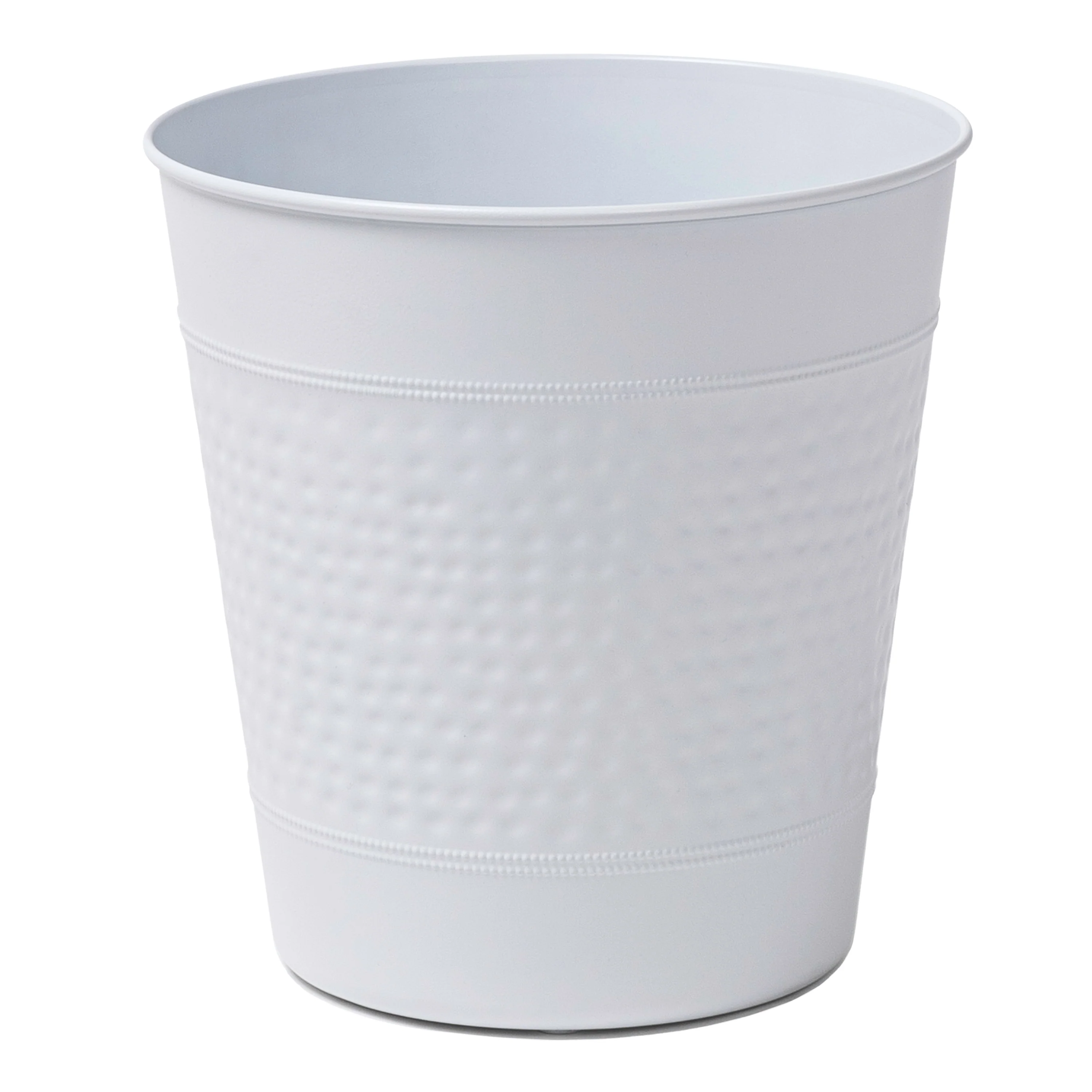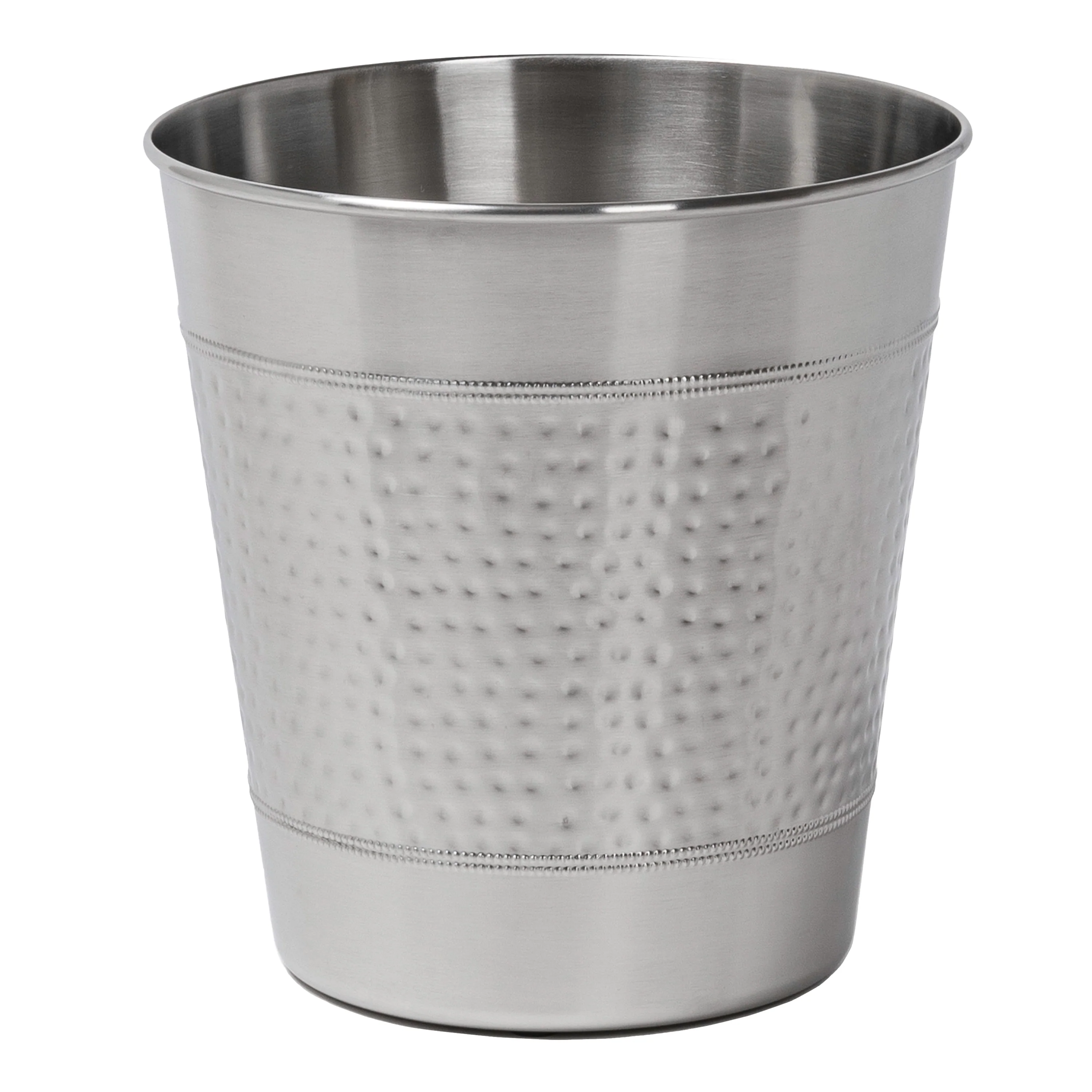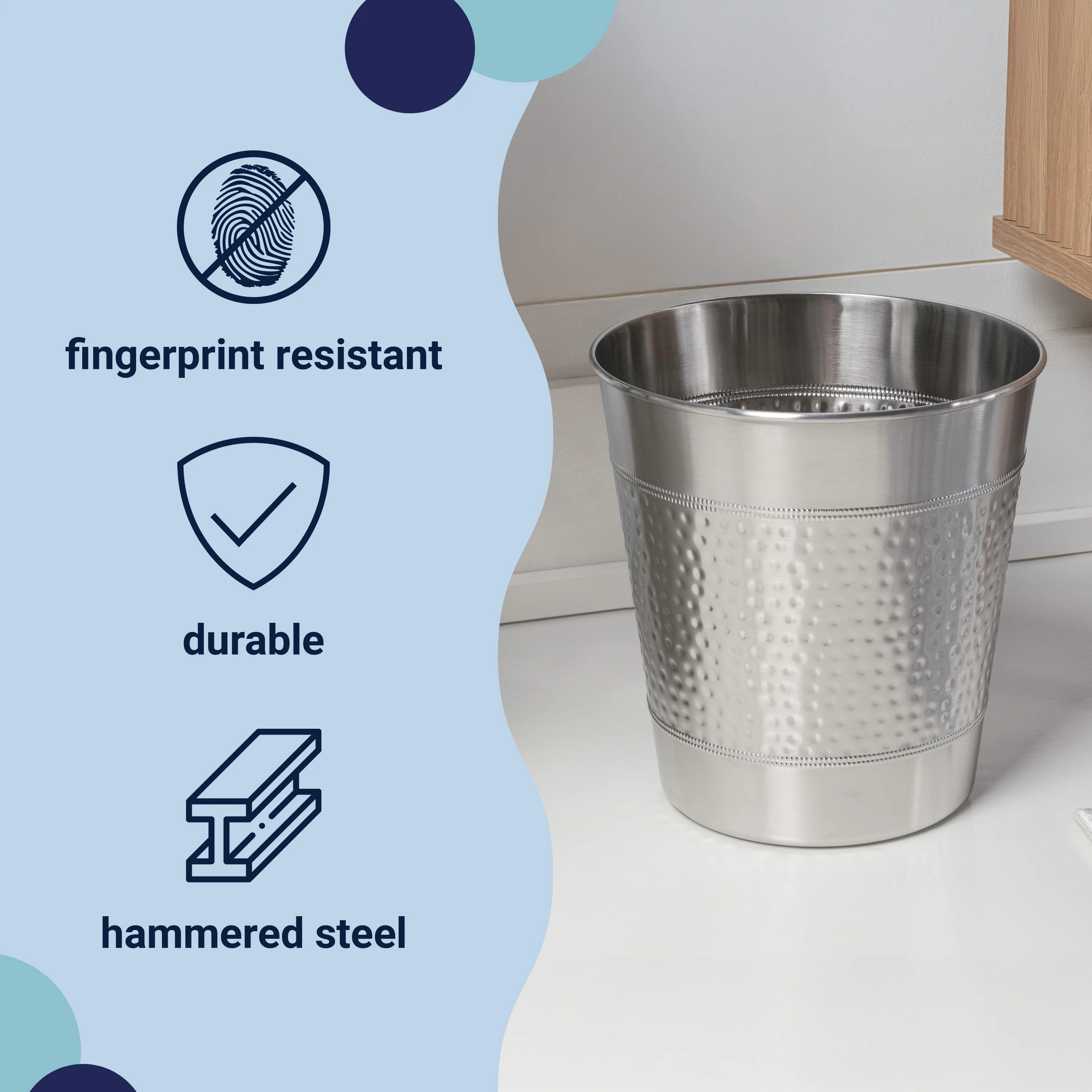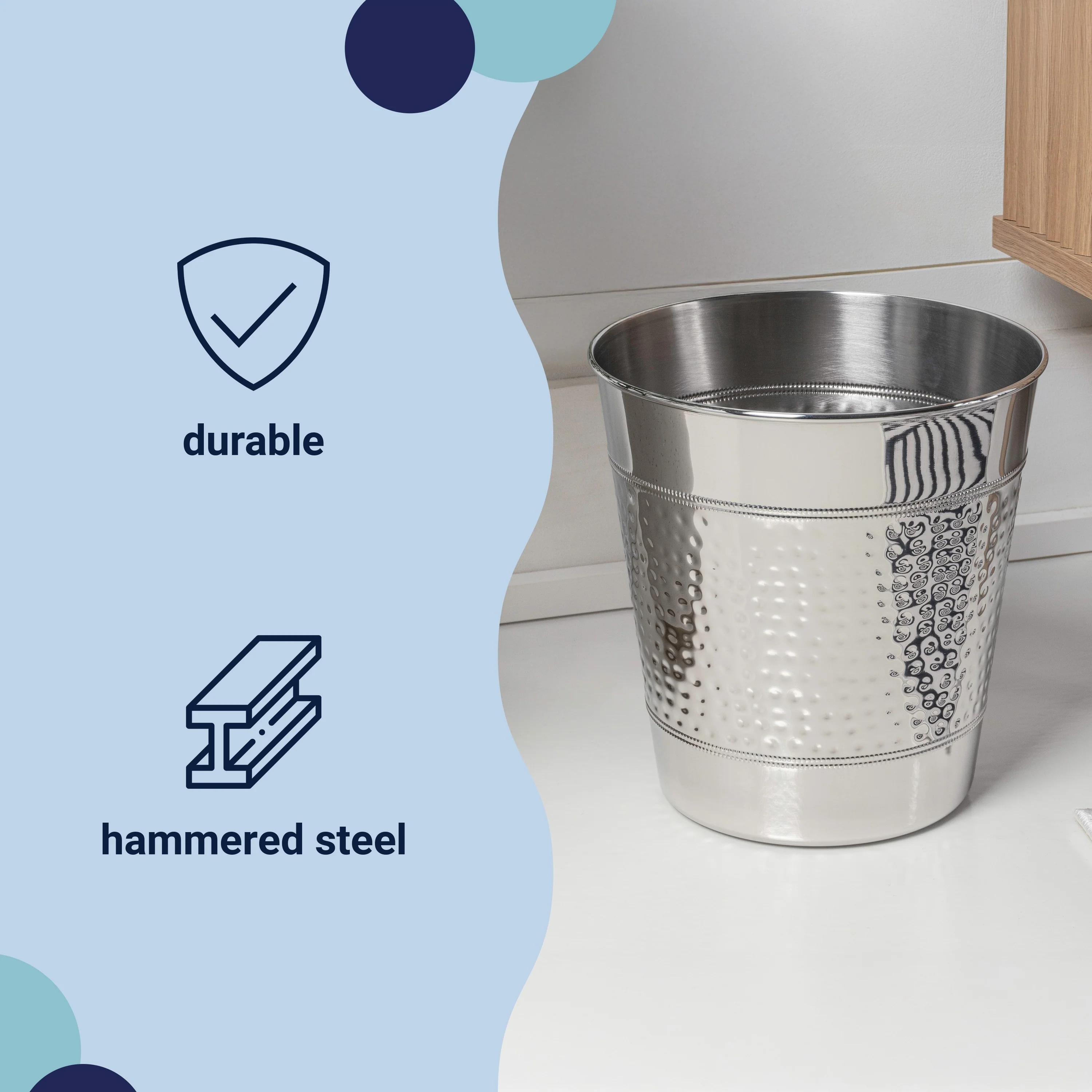 The small size of this classic trash can is ideal for the bathroom, bedroom or office. Made from durable steel, it has an accent band of hammered texture. Add a modern touch to any space with this stylish trash receptacle.