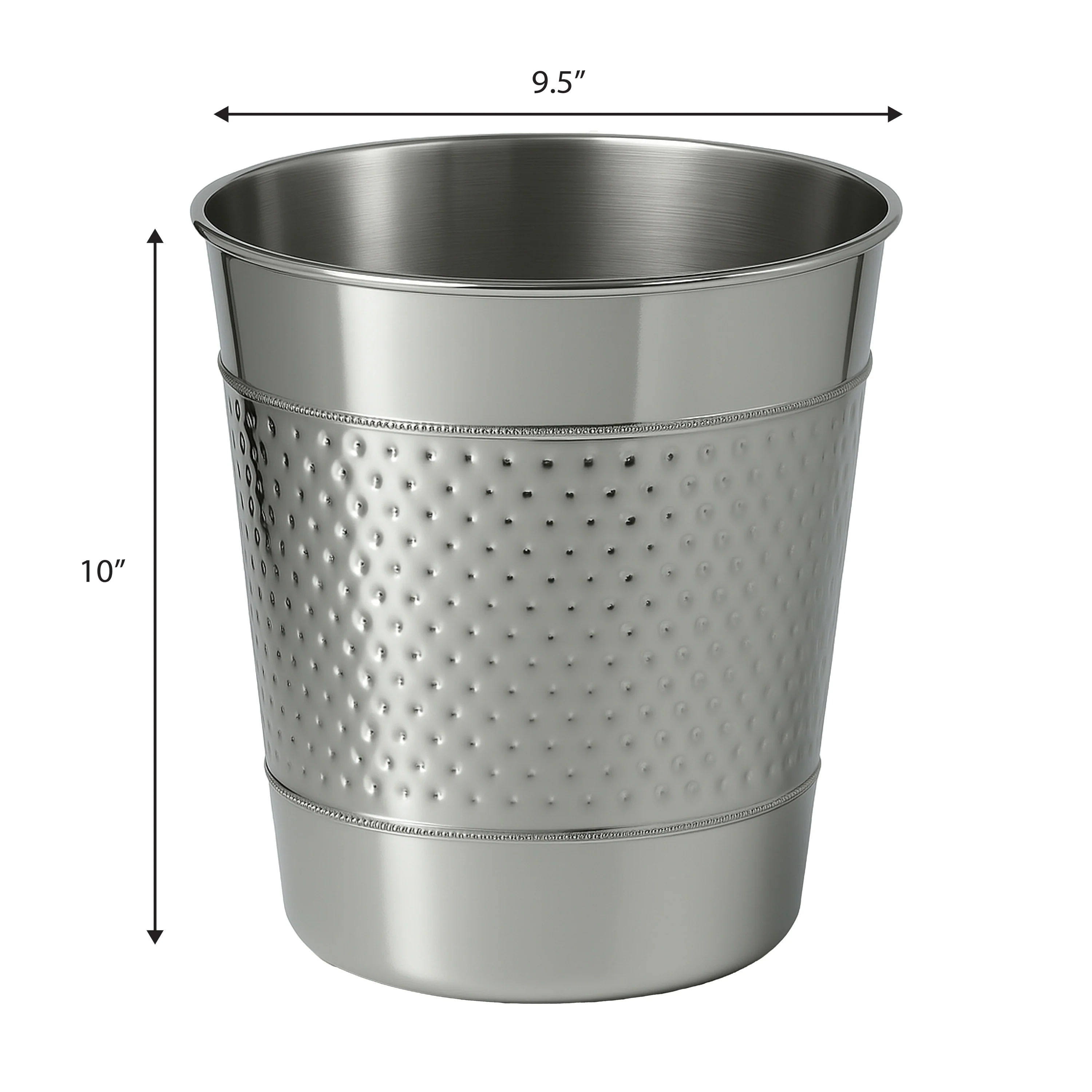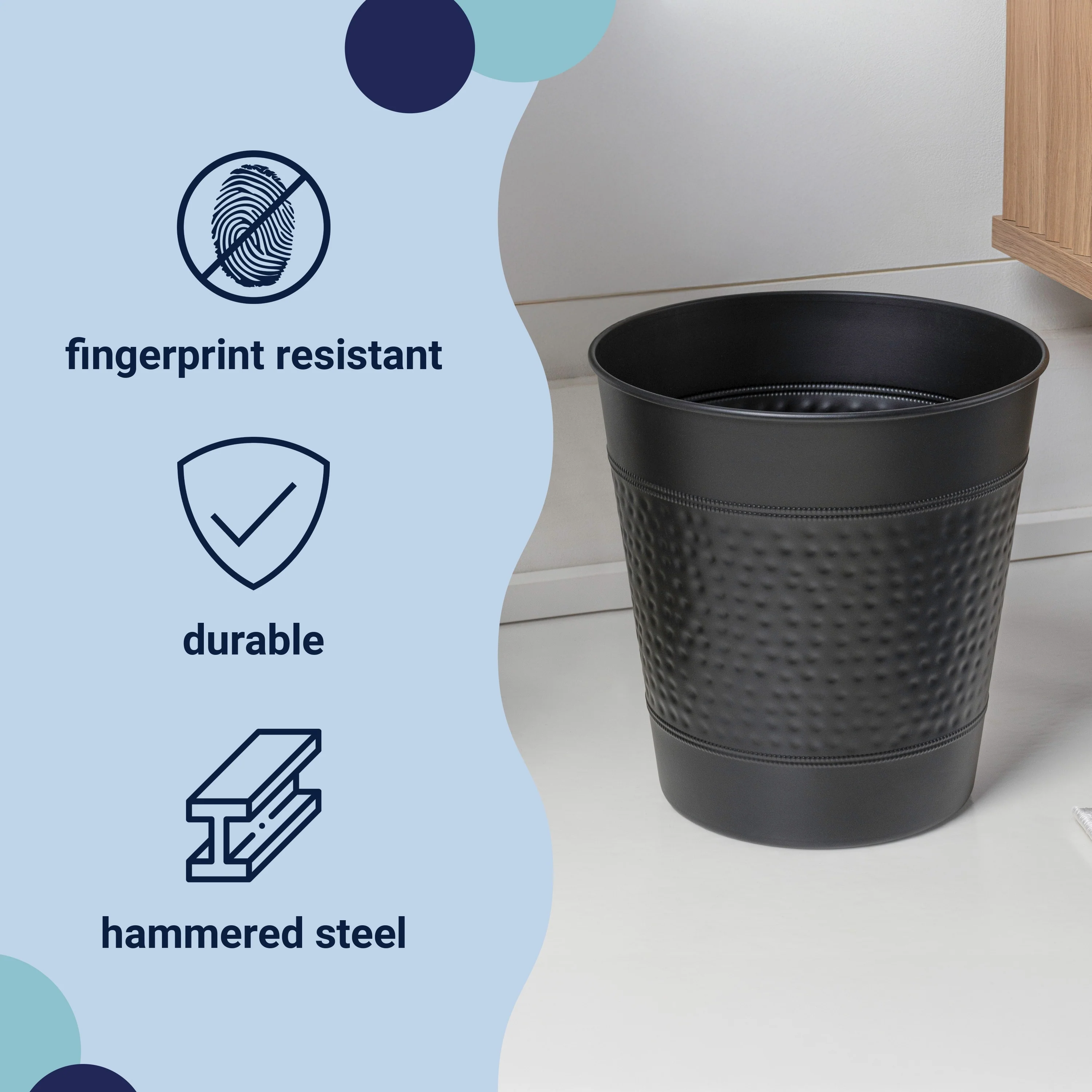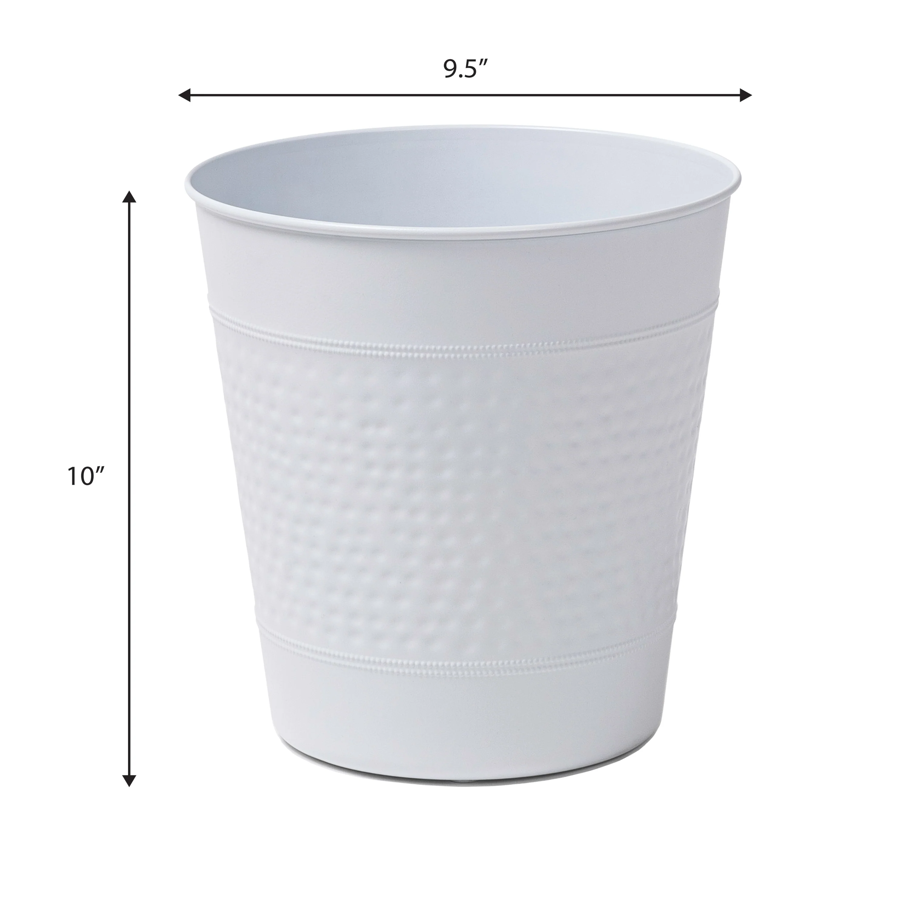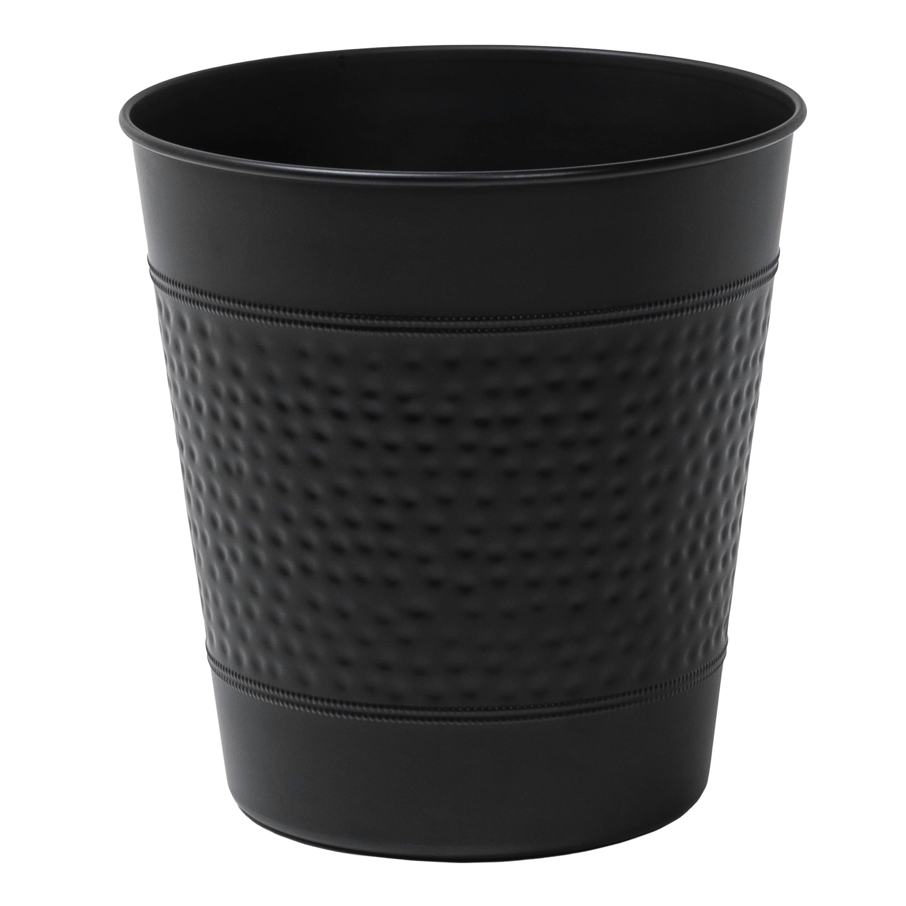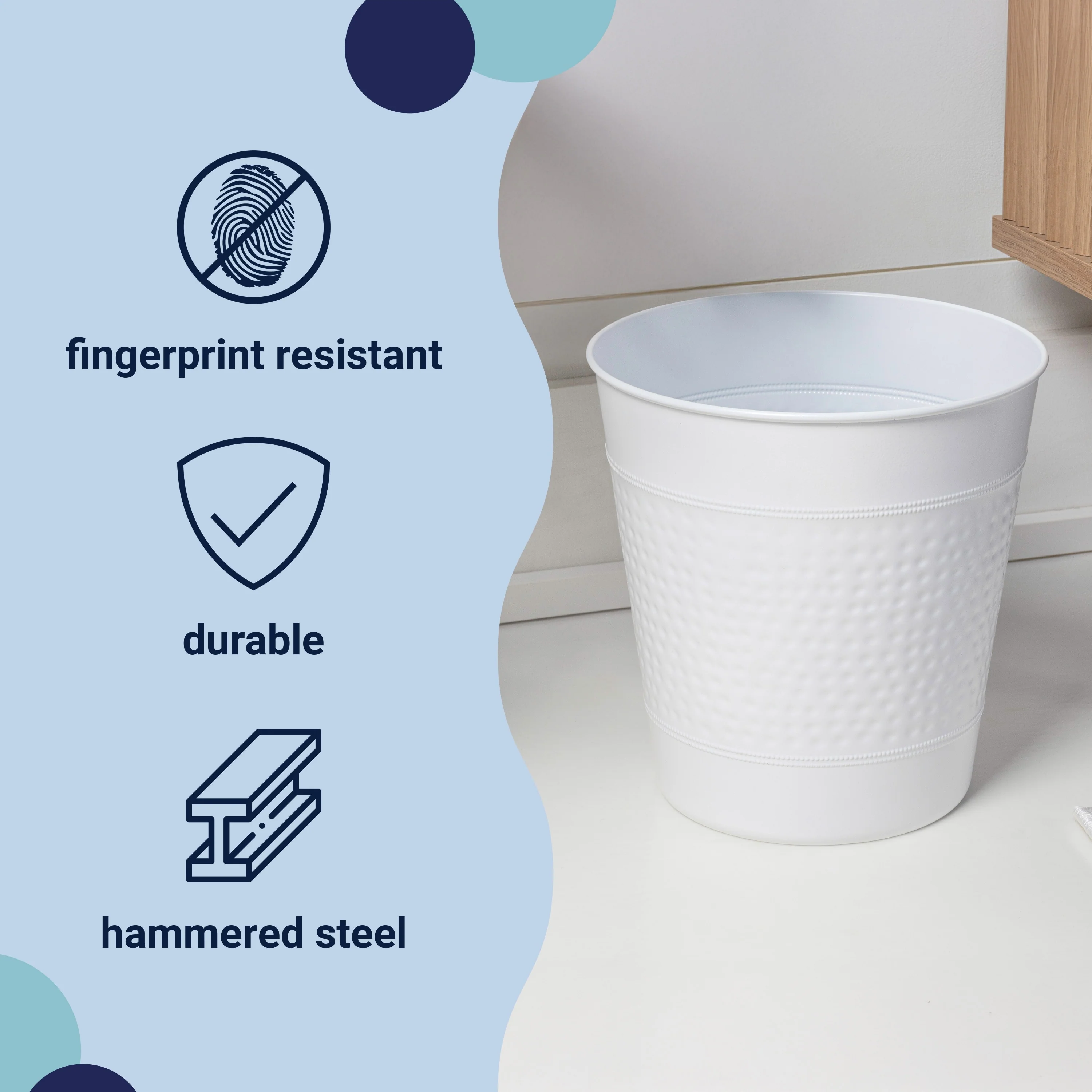 The small size of this classic trash can is ideal for the bathroom, bedroom or office. Made from durable steel, it has an accent band of hammered texture. Add a modern touch to any space with this stylish trash receptacle.