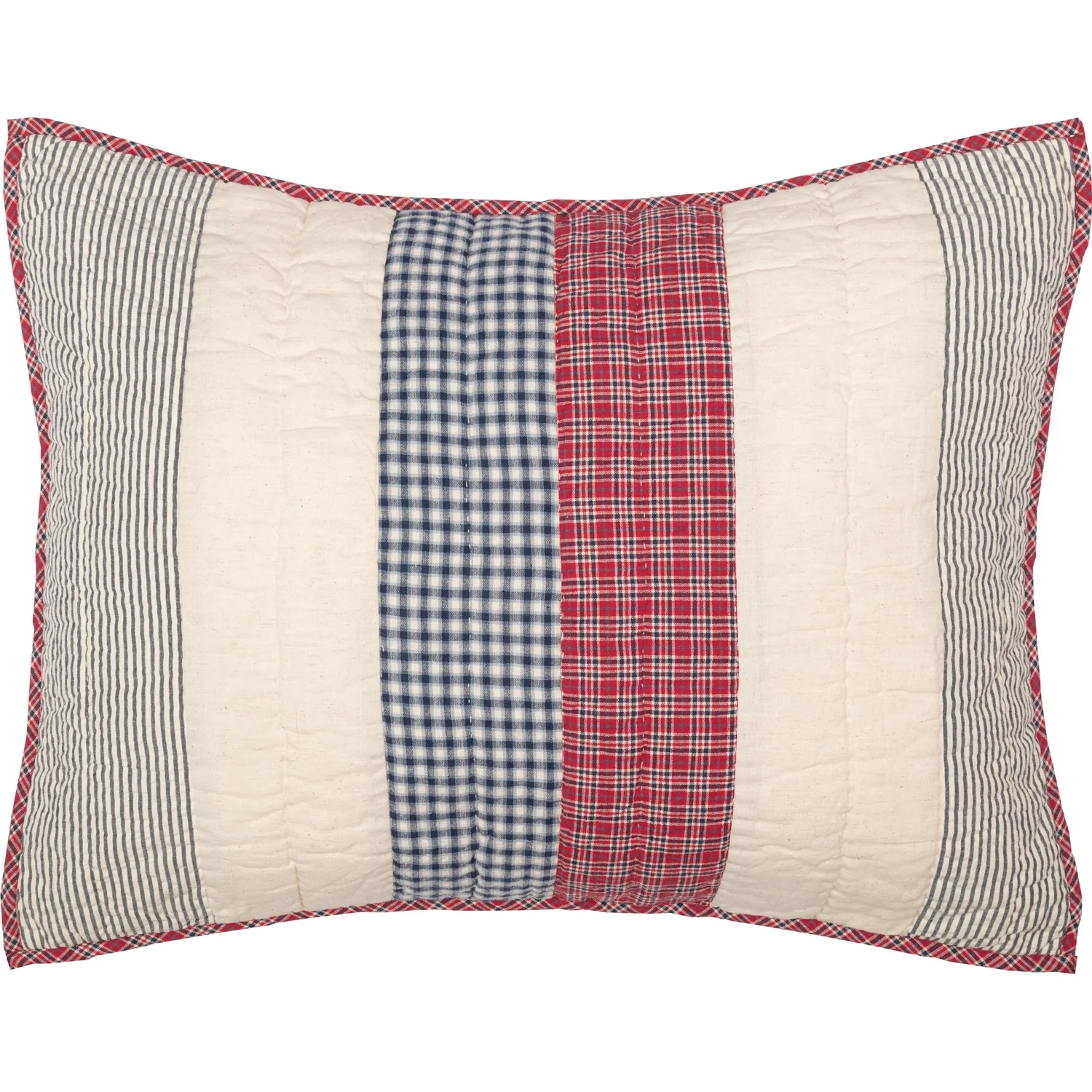 Add a delightful Americana look to your bed with the Hatteras Patch King Sham 21×37. Featuring eye-catching plaid, check, and popular ticking stripe patchwork in red, white, and blue. This patriotic quilt creates a lovely focal point for all your country, colonial decor with premium quality for years of enjoyment.