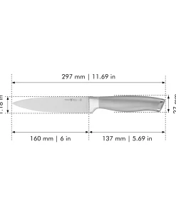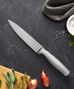 Form meets function in the striking Modernist series. The fully forged bolster construction seamlessly transitions from blade to handle for durability and balance. Fabricated from high-quality German stainless steel, the satin-finished blade produces precision cuts and is honed for long-lasting sharpness. Equally ergonomic and stylish, the hollow stainless steel handle is wonderfully lightweight. Its fingerprint-proof sandblasted texture is easy to grip and is beautifully finished with a polished, logo-embossed end. Enjoy effortless cutting and cleanup with these dishwasher safe knives.