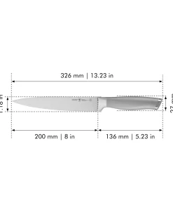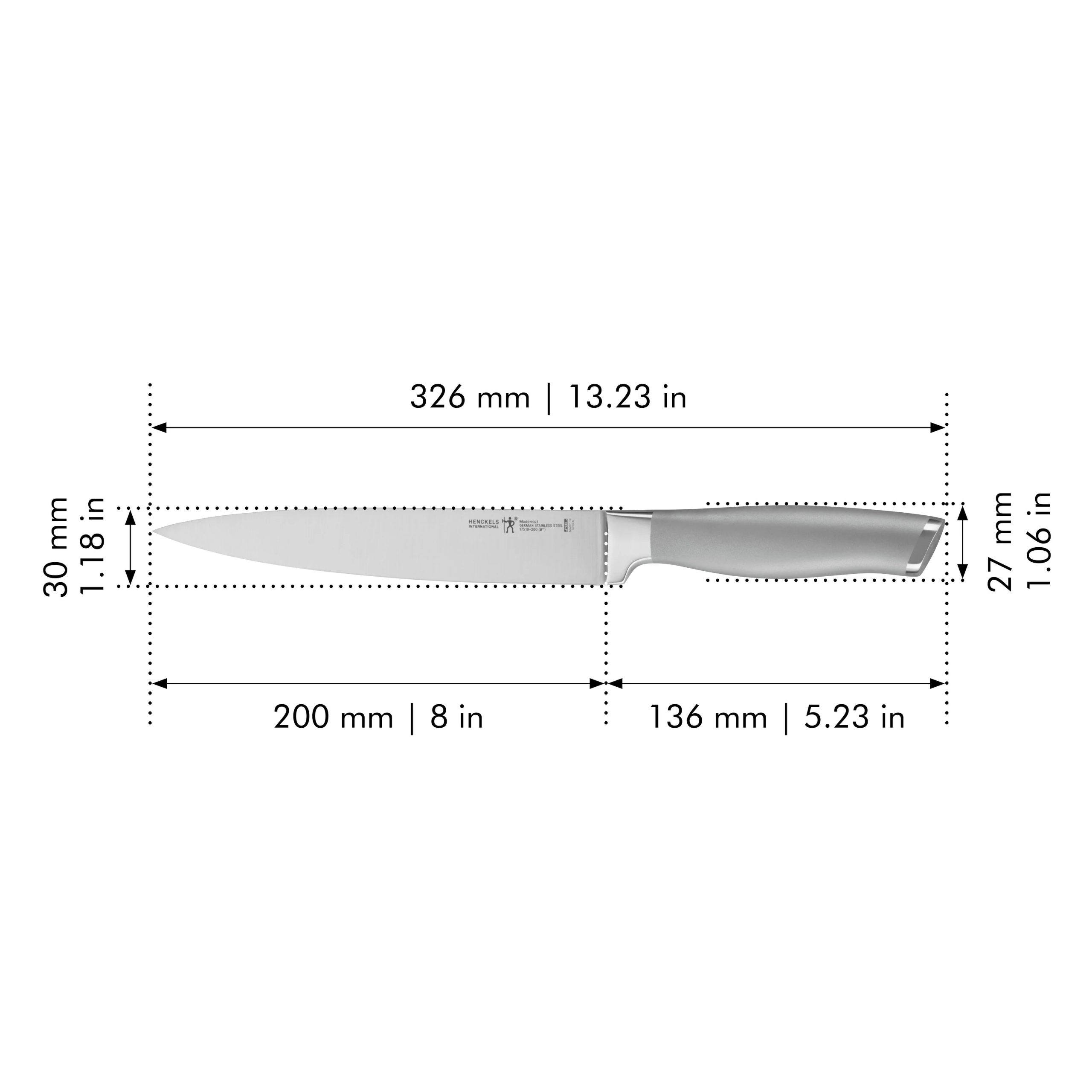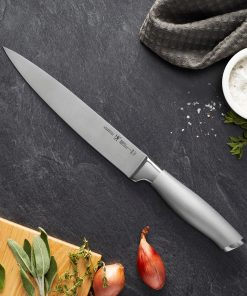 Form meets function in the striking Modernist series. The fully forged bolster construction seamlessly transitions from blade to handle for durability and balance. Fabricated from high-quality German stainless steel, the satin-finished blade produces precision cuts and is honed for long-lasting sharpness. Equally ergonomic and stylish, the hollow stainless steel handle is wonderfully lightweight. Its fingerprint-proof sandblasted texture is easy to grip and is beautifully finished with a polished, logo-embossed end. Enjoy effortless cutting and cleanup with these dishwasher safe knives.