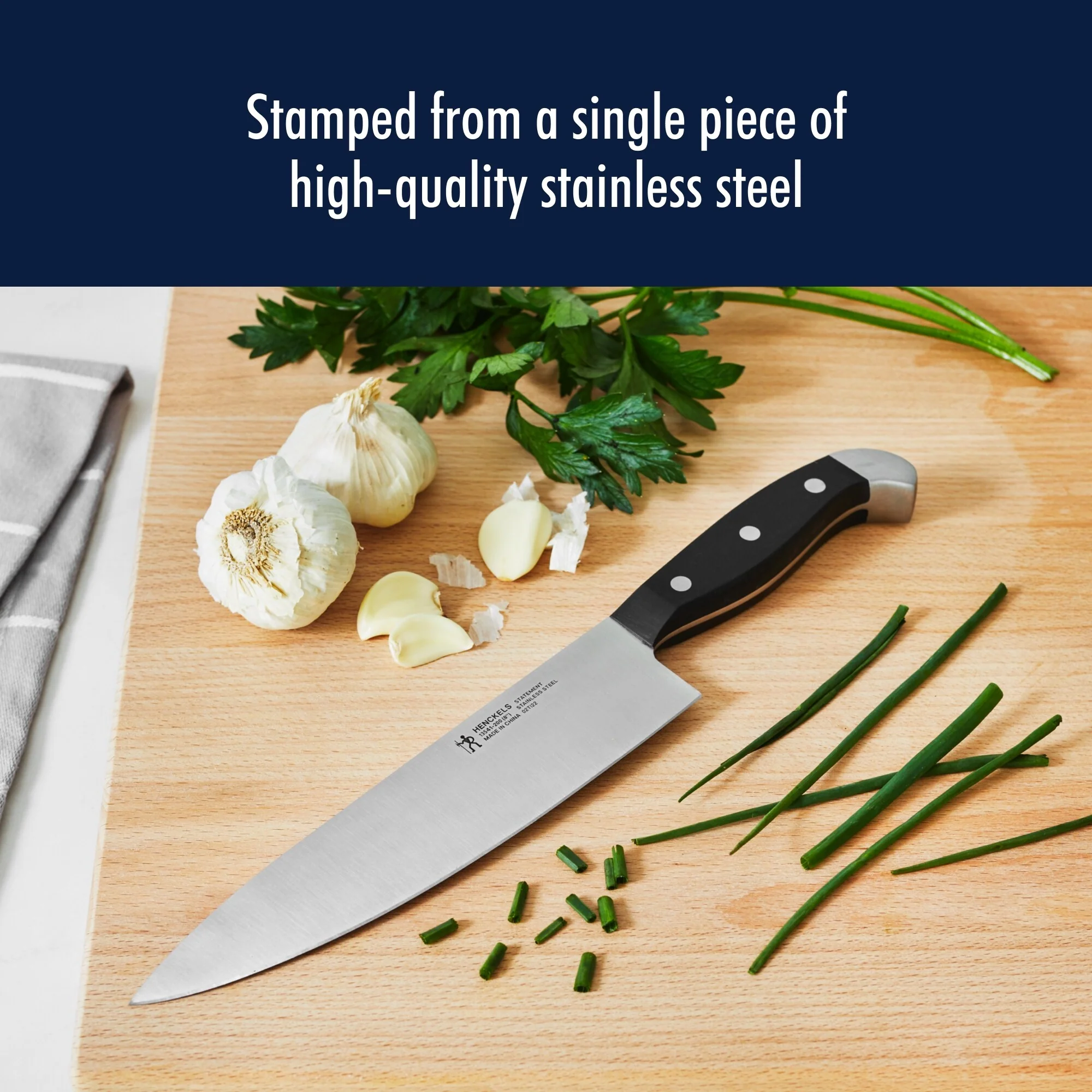 The Henckels International Statement 8" Chef’s Knife handily tackles kitchen tasks with ease. Honed for long-lasting sharpness, the fine-edge blade boasts precision cutting. No job is too big or too small for this versatile workhorse: mince shallots, dice apples, slice pork tenderloin, and chop potatoes confidently and effortlessly.