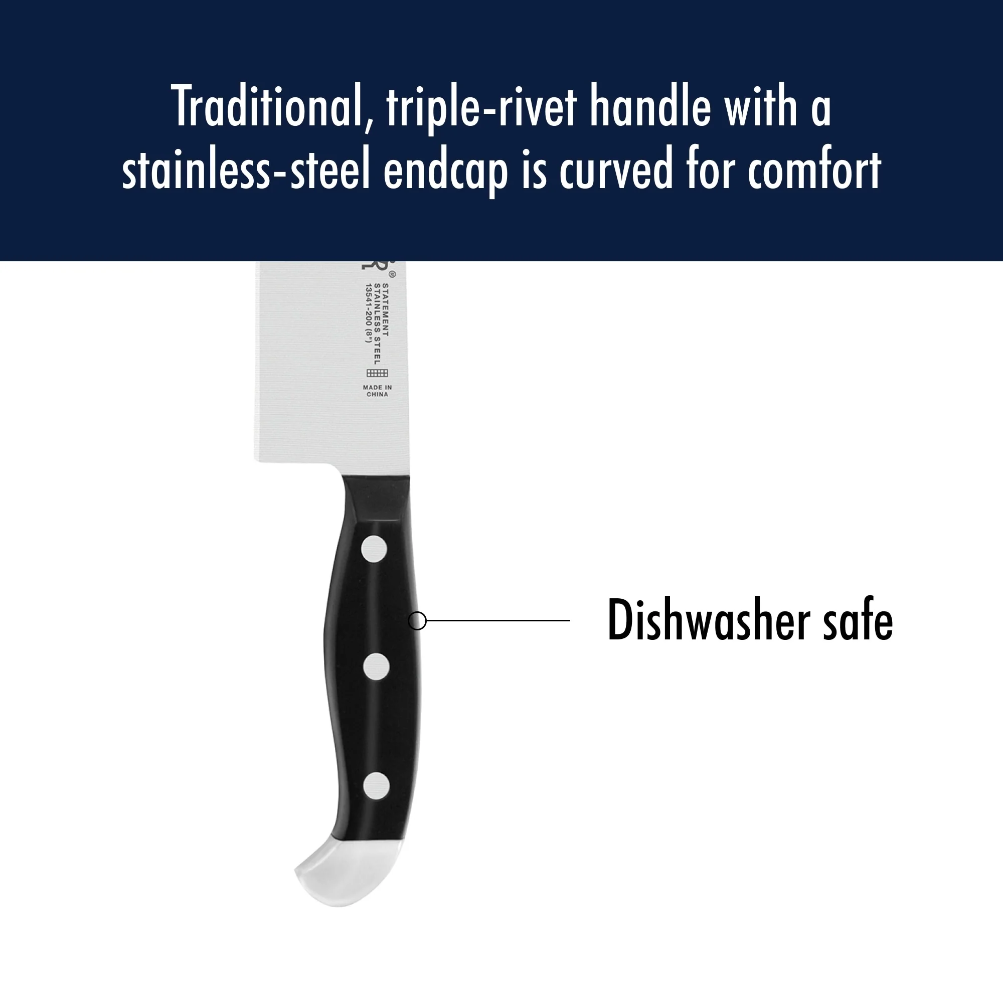 - Traditional triple-rivet handle with stainless steel endcap offers balance