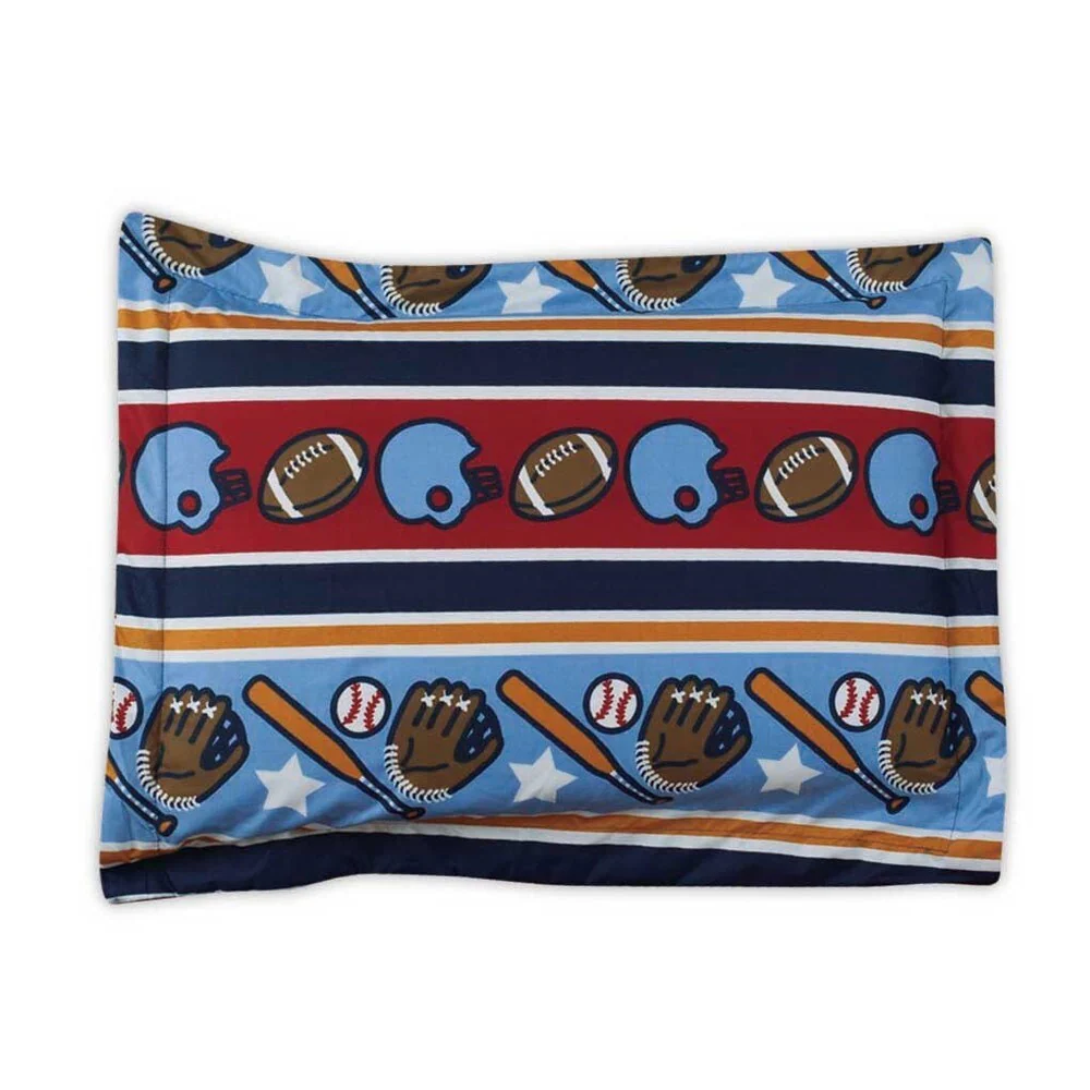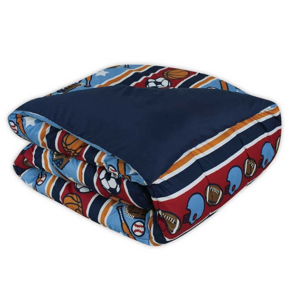 Style your child’s bedroom with a sports comforter set to makehis room stand out among the rest with a fun touch of a decorativefootball pillow. This set is constructed of quality microfiberpolyester. The comforter and sham are machine washable.