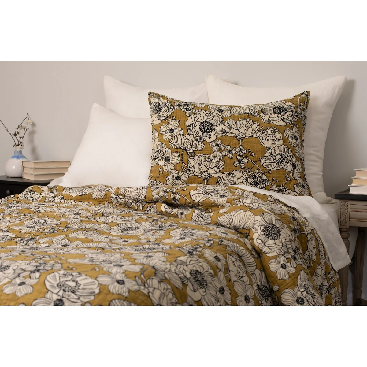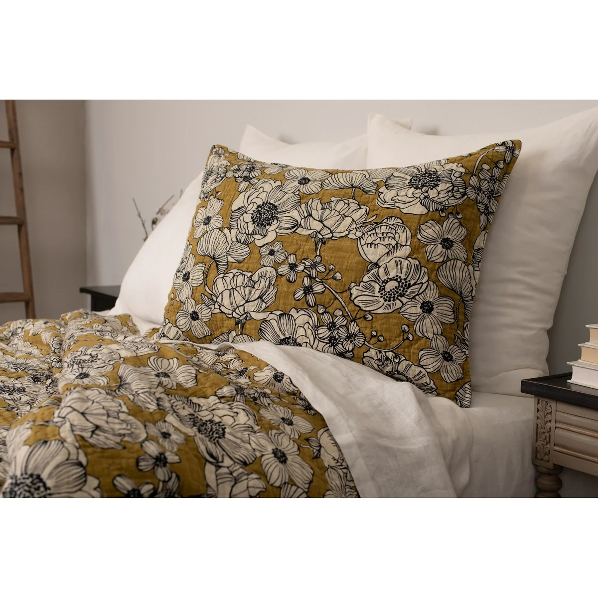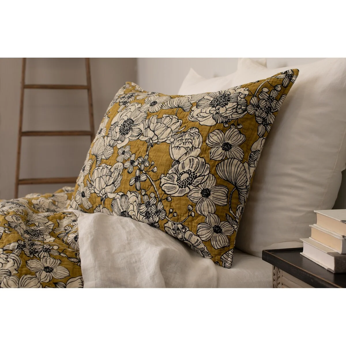 A lovely juxtaposition, the Tinsley showcases the natural cotton ground as the floral pattern with a striking black outline and set against a boldly colored background. Printed on 100% cotton with a soft hand, then hand quilted, this collection has both drama and a casual ease that could handle the spotlight or act as accent. Hand quilted with cotton fill. Shams are finished with a tie closure centered on the back. Available in: Laurel, Limestone, and Ochre.