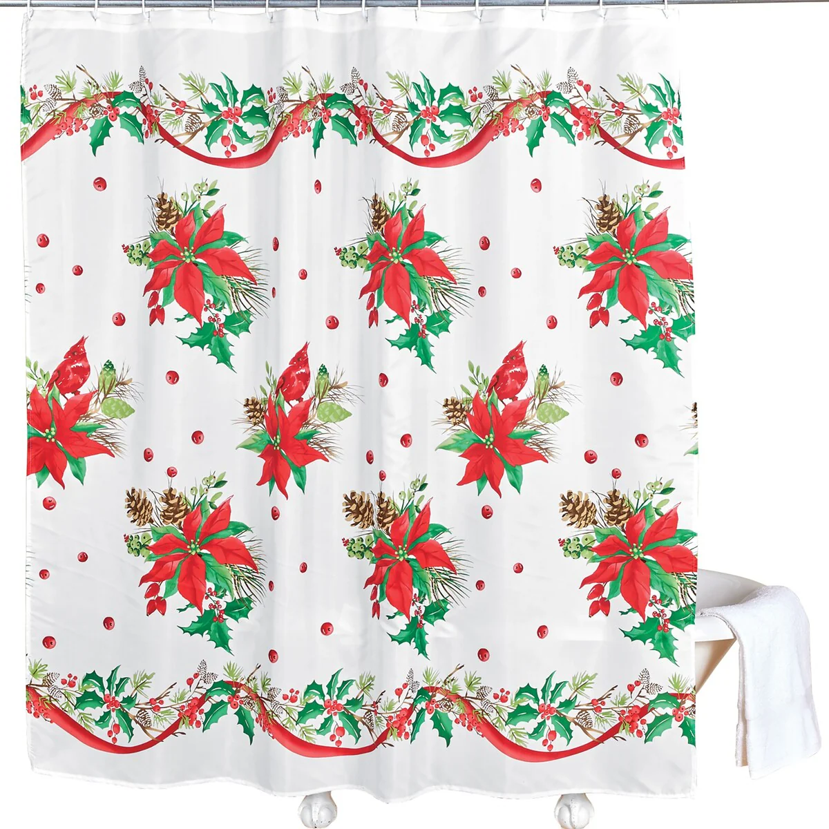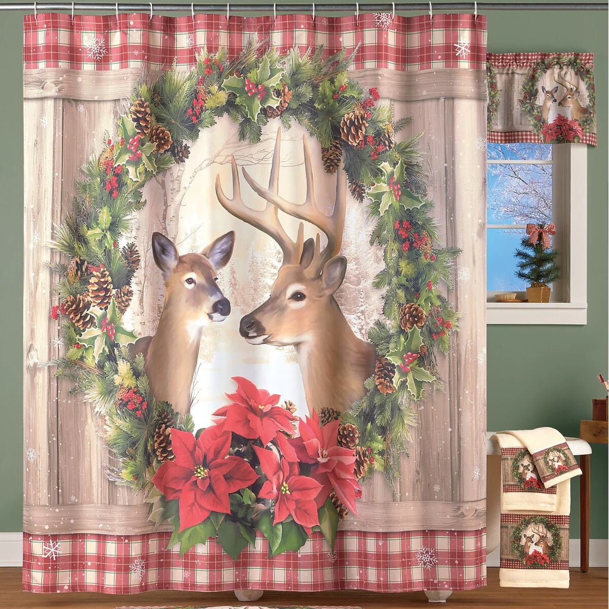 Update your bath for the season with this lovely shower curtain. It features a pair of beautiful deer in a snowy forest surrounded by festive greenery and poinsettias. A barnwood background and a red checkered border finish the look. Machine wash. Polyester; imported. Measures 72"L x 70"W.