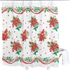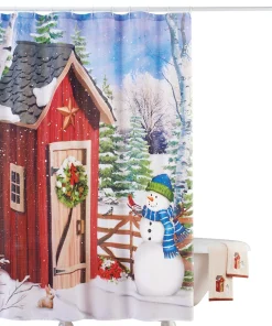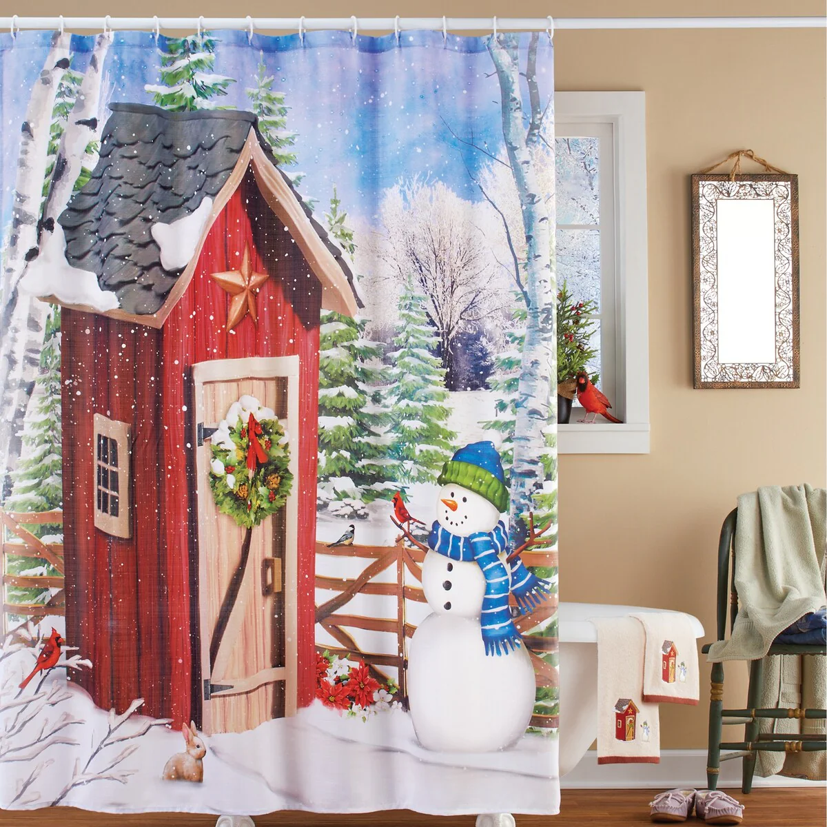 This festive shower curtain features a snow-covered, rustic red outhouse. Surrounded by a jolly snowman, red cardinals and an adorable bunny, the outhouse is finished with a holiday wreath on the door. Hooks not included. Machine wash. Polyester; imported. 72"L x 70"W.