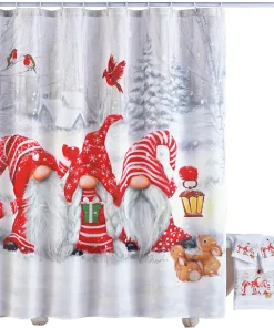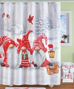 This colorful shower curtain features a trio of adorable gnomes in a snowy clearing. With soft brush strokes and vibrant colors that are representative of artist, Makiko, the shower curtain has a charming scene of falling snow, cute birds and a pair of bunnies on a soft grey background. Hooks not included. Machine wash. Polyester; imported. 72"L x 70"W.