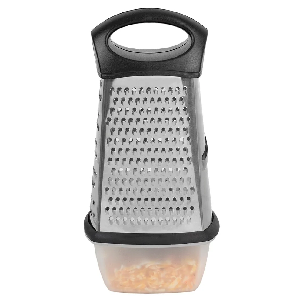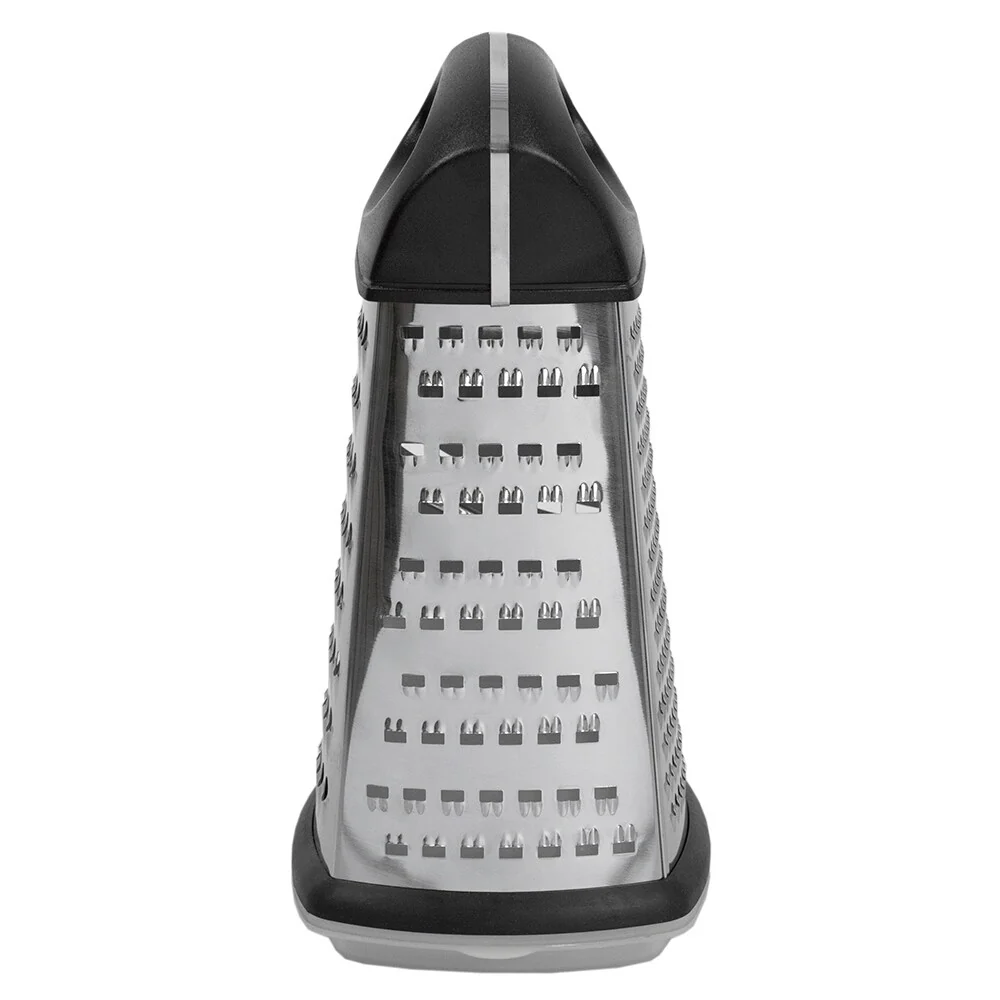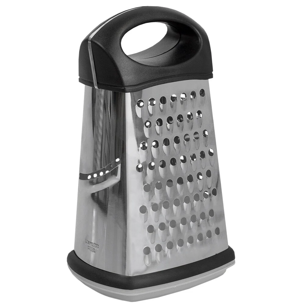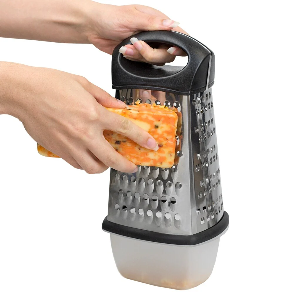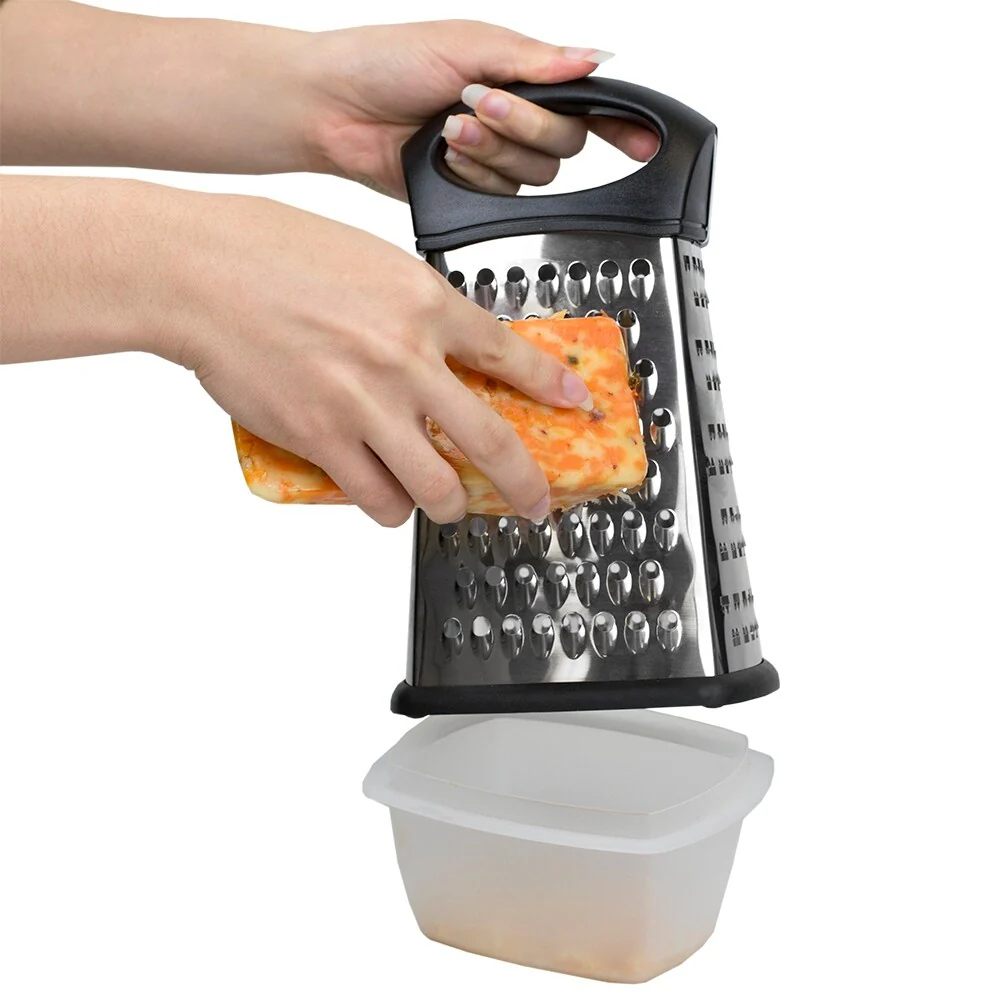 - 4 blades for a variety of textures with large handle for comfortable use: Stainless Steel box grater features 4 razor sharp stainless steel blades and a non-slip comfort handle to prevent fatigue while grating