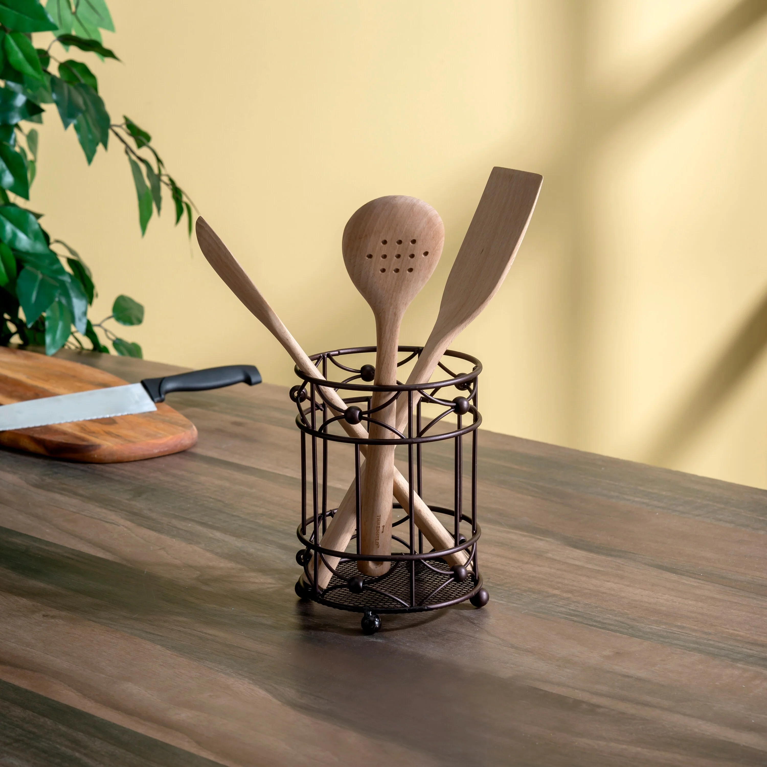 - Large capacity- Roomy container with open scroll work holds whisks, spoons, and other frequently used kitchen tools close at hand. Takes minimal space and helps to free your drawers from clutter