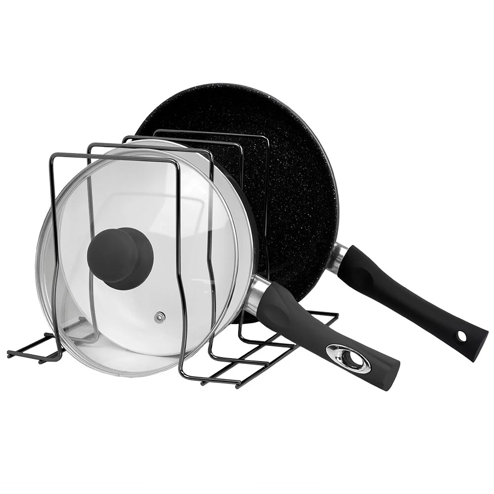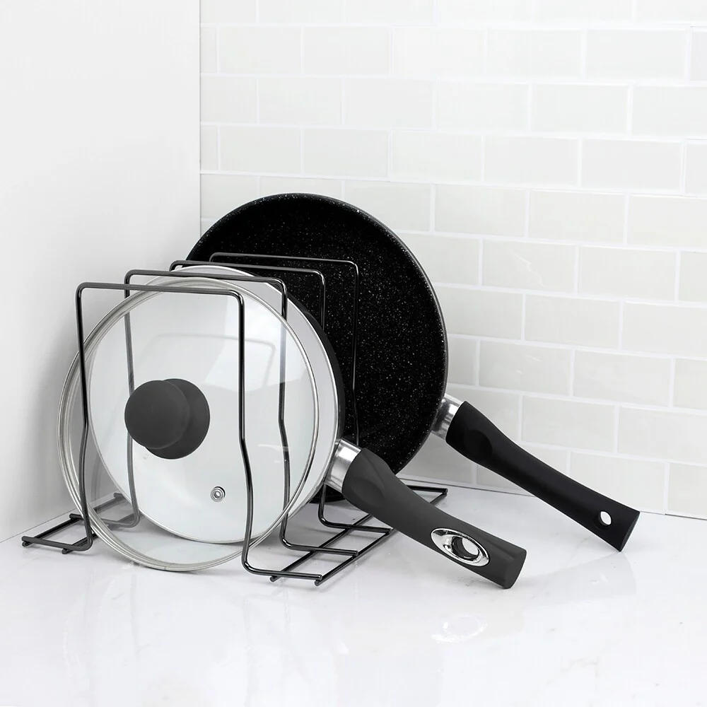 Instead of scouring through your cluttered cabinet, to find the matching lids for your cookware, stack it on this steel lid rack to have them readily available for you next culinary quest. Designed with small spaces in mind, this rack fits neatly in the corner of the countertop without taking up too much space, so you’ll have easy access to your cookware anytime. The rack holds up to four lids vertically upright so they are easy to grab and spot when needed. Get your collection of cookware organized with this four slot lid rack.
