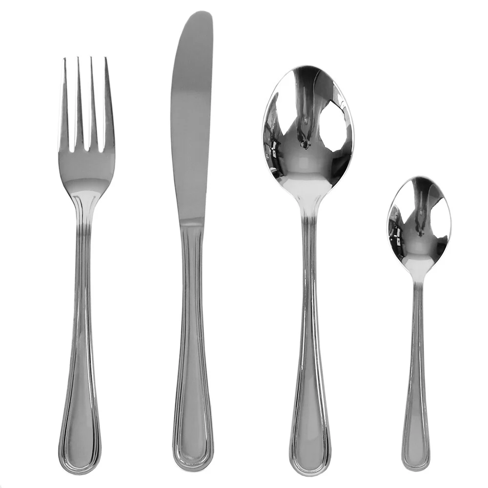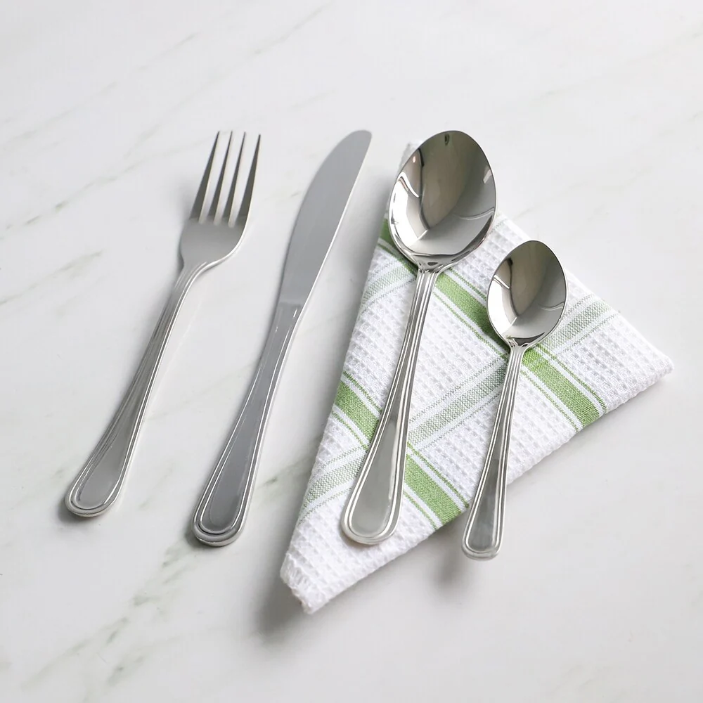 - Set includes: Four (4) dinner forks, four (4) dinner knives, four (4) tablespoons and four (4) teaspoons