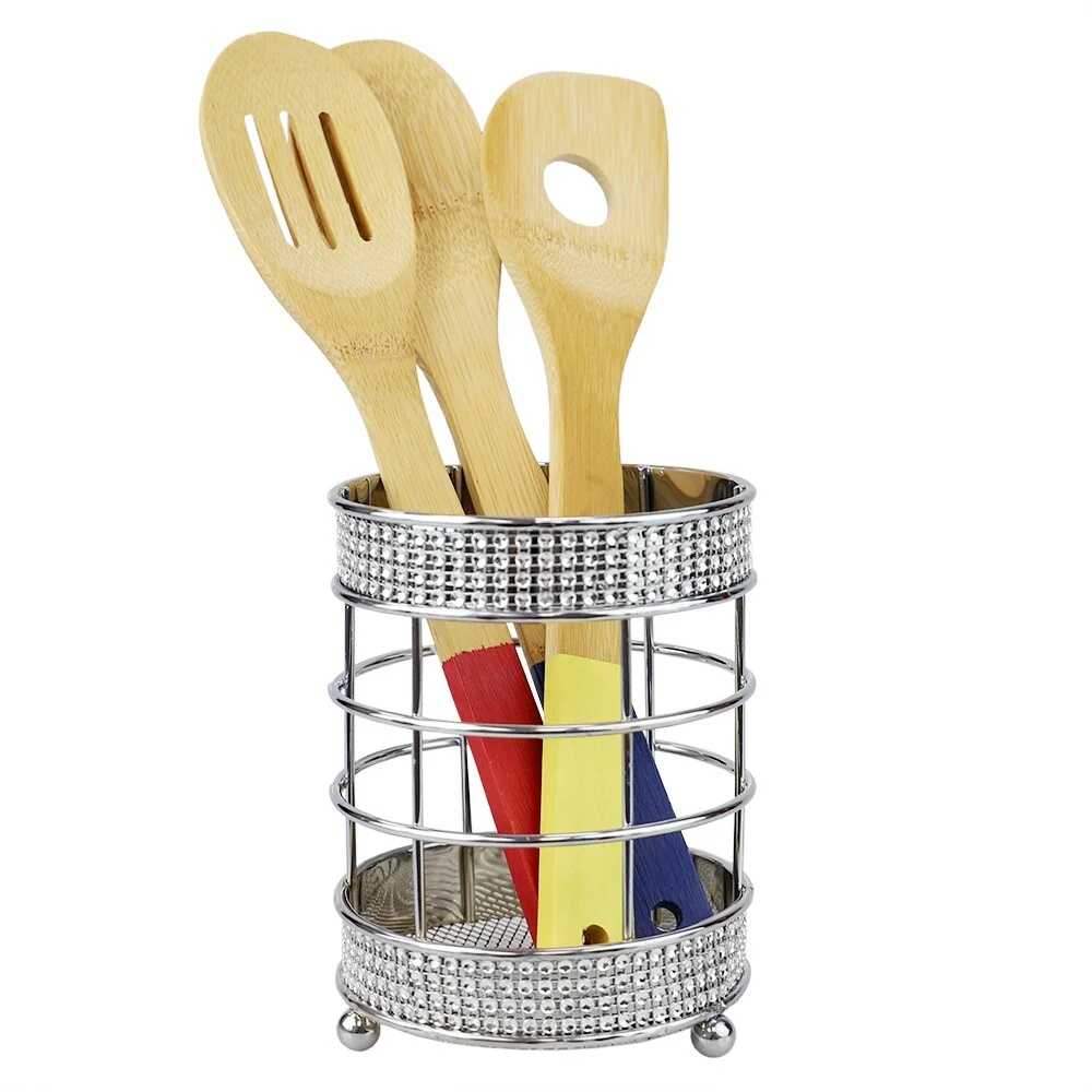 Have your most frequently used cooking tools at the ready with the pave cutlery holder. Designed to contain multiple utensils, it’s great for containing whisks, serving spoons. The durable steel design supports the weight of a set of flatware, utensils and cutlery. The wide mouth makes it easy to grab the utensil you need when you need. With non-skid metal feet, it sits evenly on countertops, picnic tables, and buffet tables. With its ornate beaded detailing along the top and bottom of the holder it doubles as both a stylish kitchen accessory. The ventilated mesh bottom also makes it great for draining damp silverware after washing. Be sure to dry the unit thoroughly and wash with warm water and mild soap.