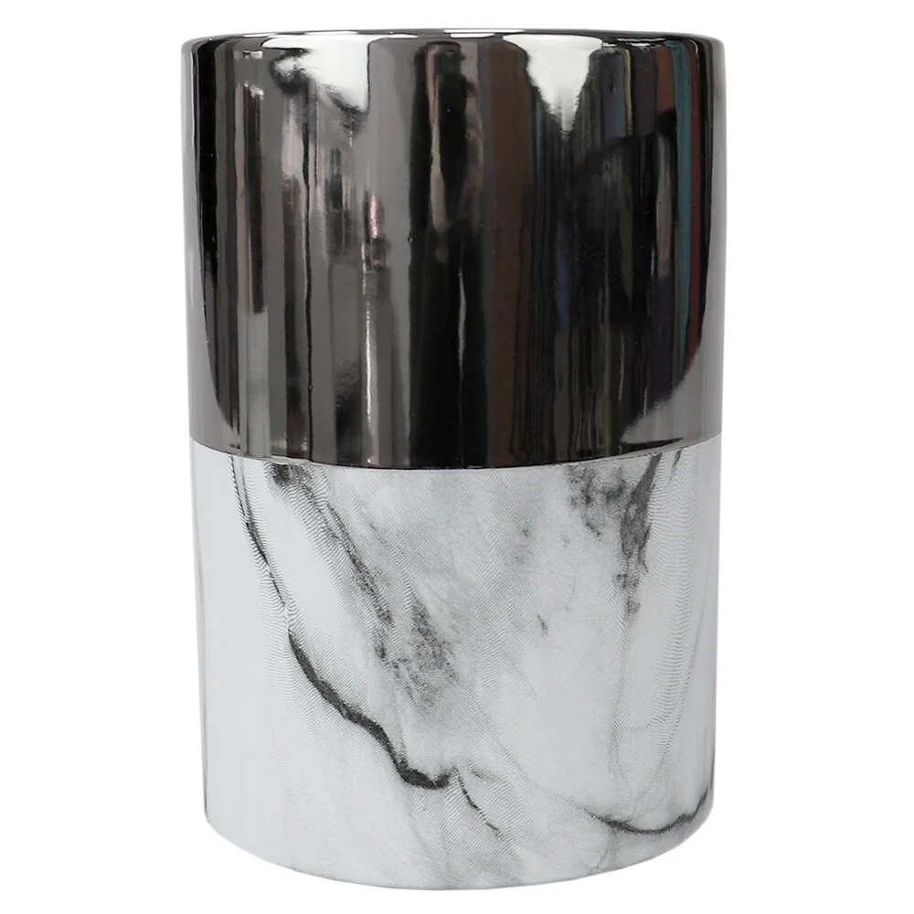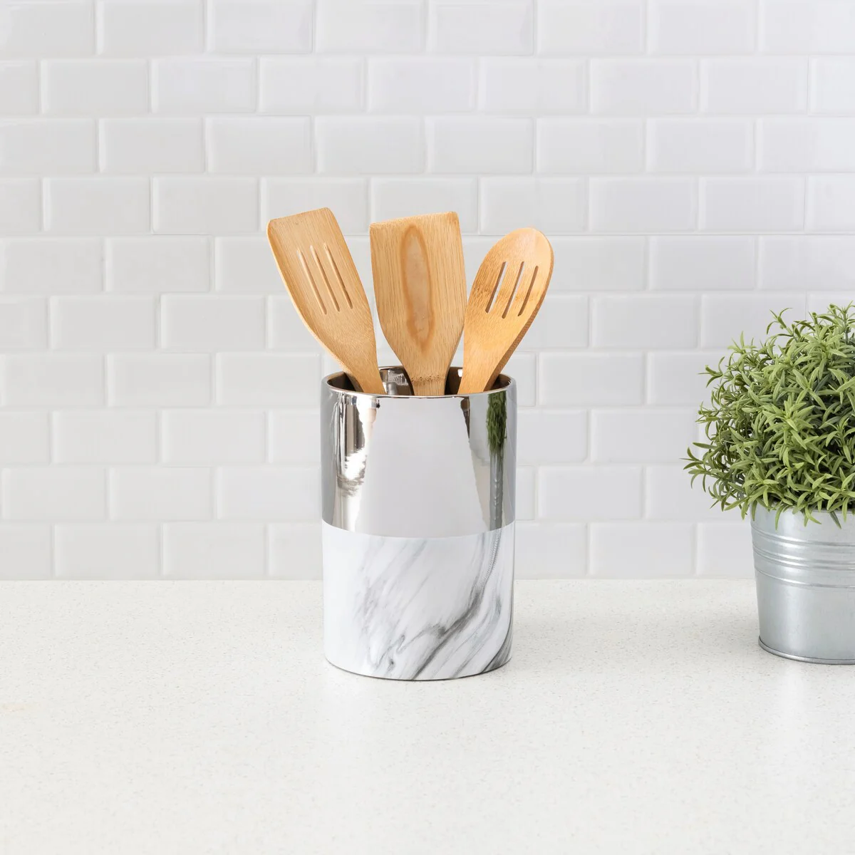Keep your frequently used kitchen tools at hand with this standing marble utensil crock. The wide and stable bottom helps keep utensils upright, while the beautiful weighted marble base prevents the holder from shifting out of place. Perfectly sized to hold all your favorite gadgets and tools from spoons, ladles, tongs, silverware and more. Beyond the kitchen, this versatile piece does double duty as beautiful vase to hold flowers.