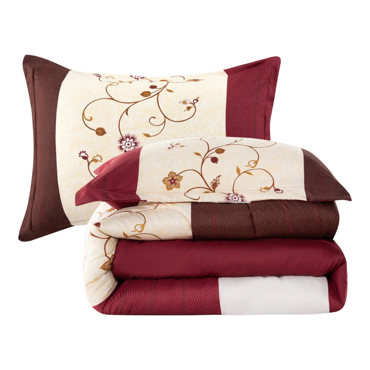 Design and Feature: This Modern Design have Burgundy White Brown Base with Cosmos Floral Decorated on It. Printed Matching Design on the Pillowcase. Marina Decoration Goose Down Alternative Home Textile Bedding Rich Printed Comforter Set. The Comforter is Oversized and Overfilled. Box-Stitching Design to Avoid any Shifting in the ComforterDimension: Twin Single Size Included 1 Comforter 66 x 86 Inch and 1 Printed Pillow Sham 20 x 26 2 Inch; Queen Full Size Included 1 Comforter 90 x 90 Inch and 2 Printed Pillow Shams 20 x 26 2 Inch; King Size Included 1 Comforter 104 x 90 Inch and 2 Printed Pillow Shams 20 x 36 2 InchMaterial: 100% Polyester. The Comforter is Filled by 250 GSM Polyester. The Fabric is Made from 90 GSM Brushed Microfiber. Wrinkle Free, Ultra Soft, Breathable, Hypoallergenic and Deep Pocket. Be Comfortable All Year Round with Marina Decoration Comforter SetThis Comforter Bedding Set is a Perfect Gift Choice for Your Lover, Wife, Husband, Father, Mother, Neighbor, Family and Friends for Birthday, Christmas, Wedding, Anniversary, Housewarming, Valentine’s Gift. You Can Use the Comforter Set at Home, Bedroom, Master Room, Guest Room, Kids Bed Room, Vacation Home, Cottage, Cabin, Lake House, Mountain House, Camping, Home Staging or Lodge DécorCare Instruction: Machine Washable Cold. Launder Whites and Colors Separately. Use no Bleach on Colors. Tumble Dry Low