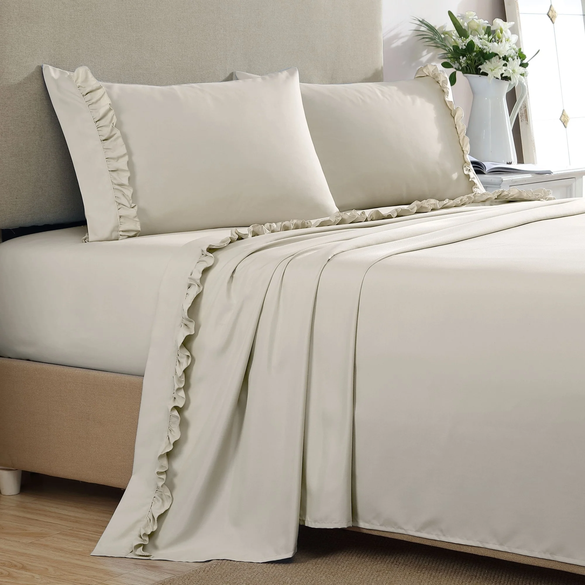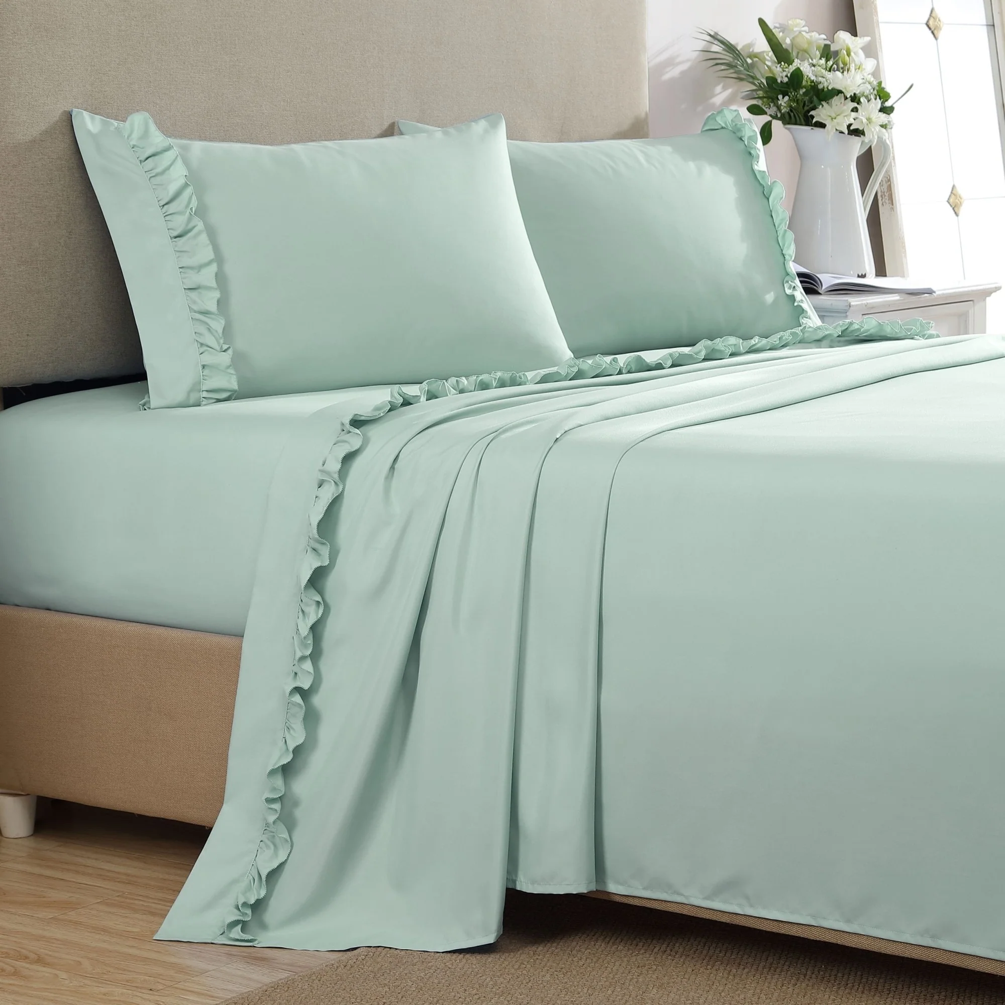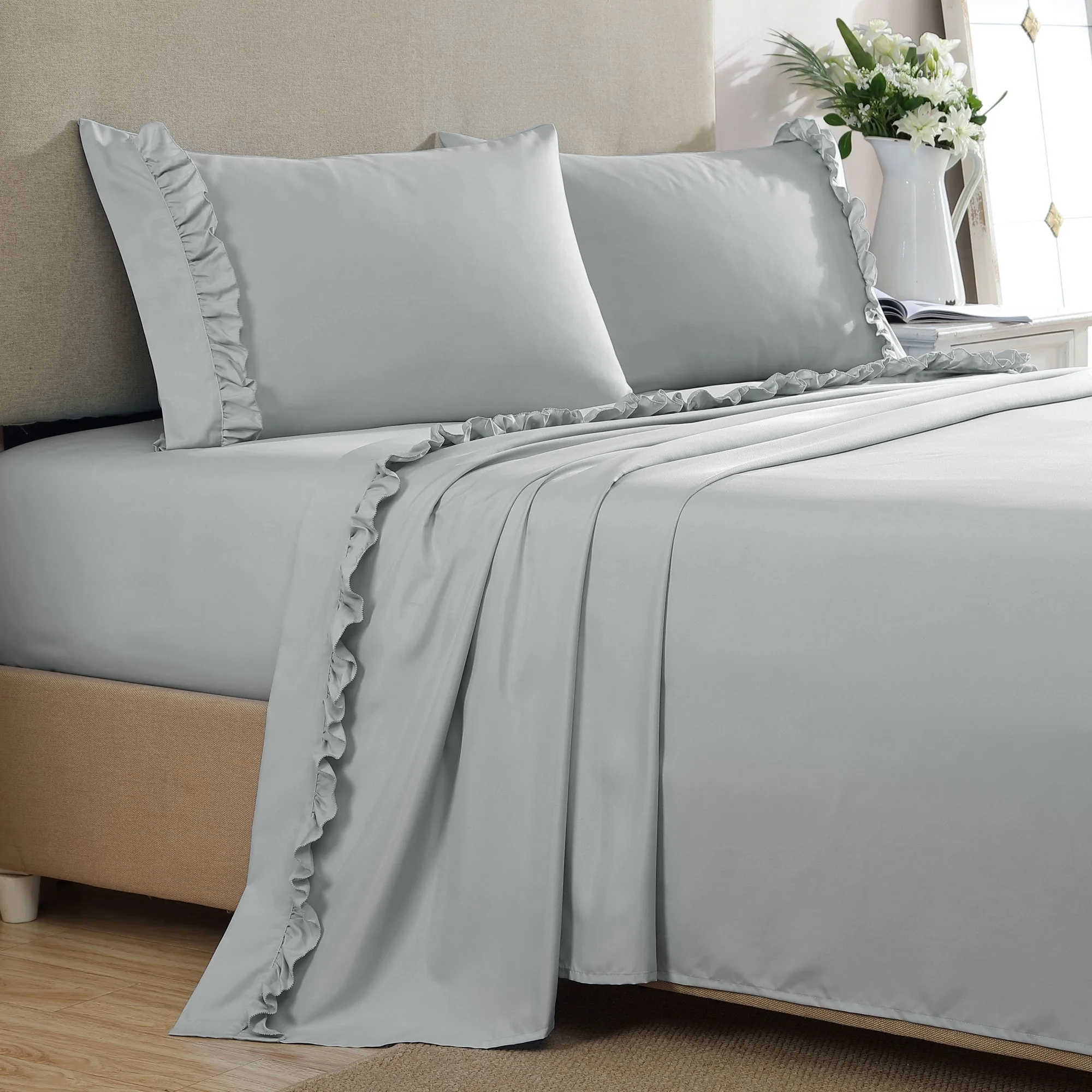 Add a touch of femininity and farmhouse style with our Ruffle Hem Sheet Set. Made from the same hypoallergenic and soft fabric as our Microfiber Sheet Sets, they provide pure comfort but with a decorative flair. With the same incredible durability, fade and wrinkle resistance, these sheets are easy to care for, just as it is to fall in love with them!