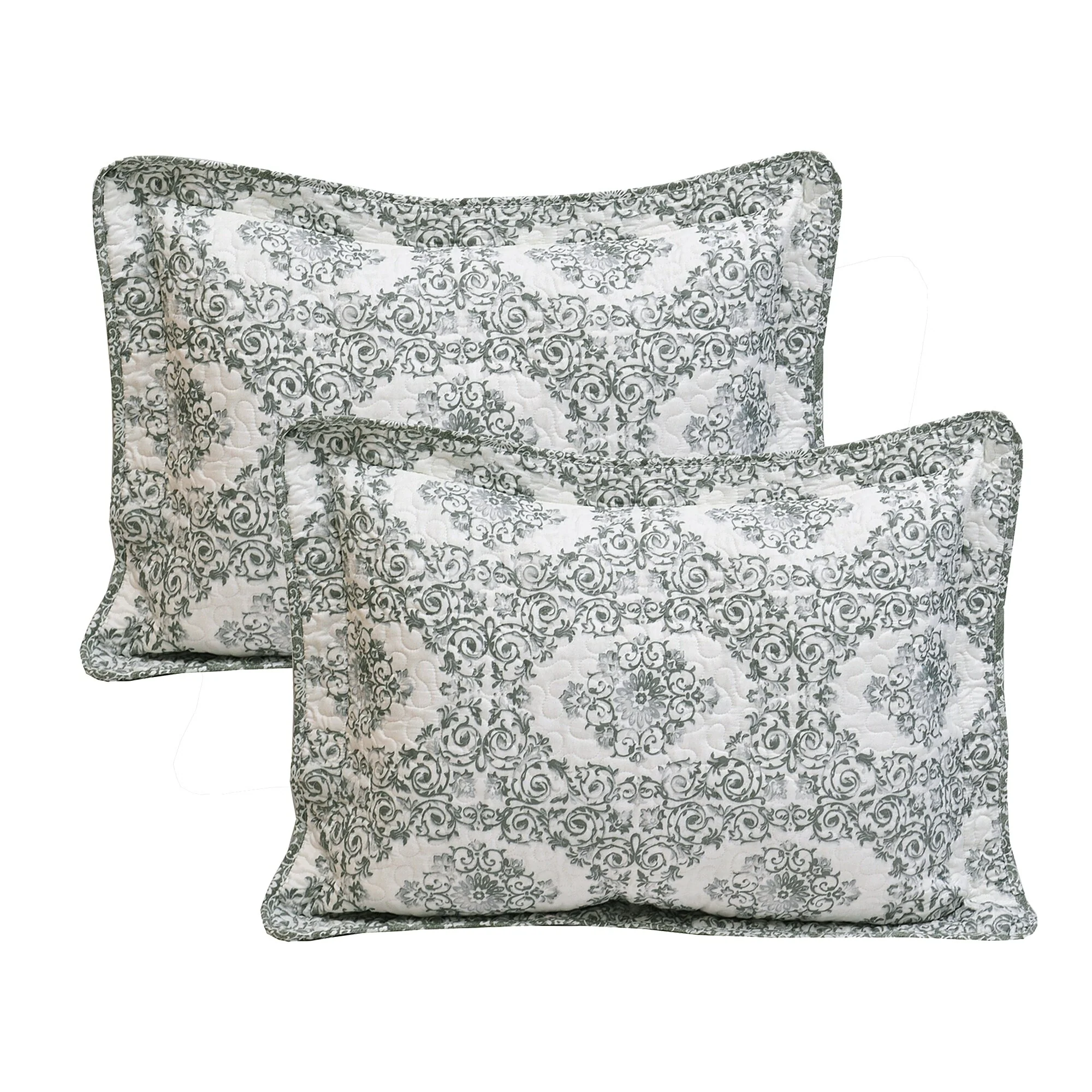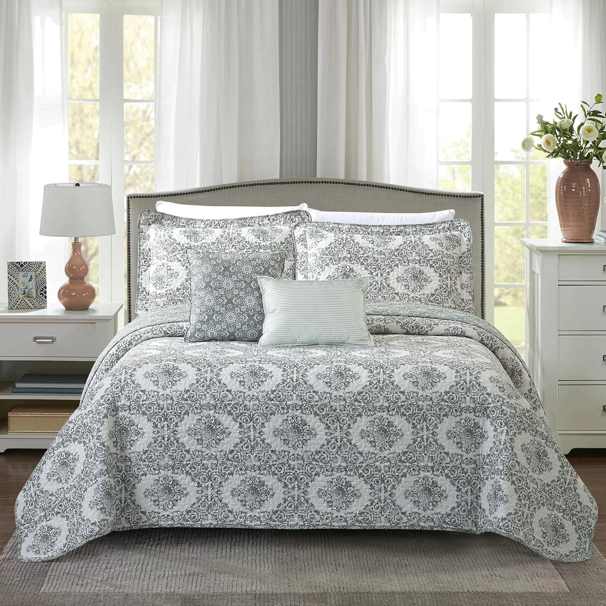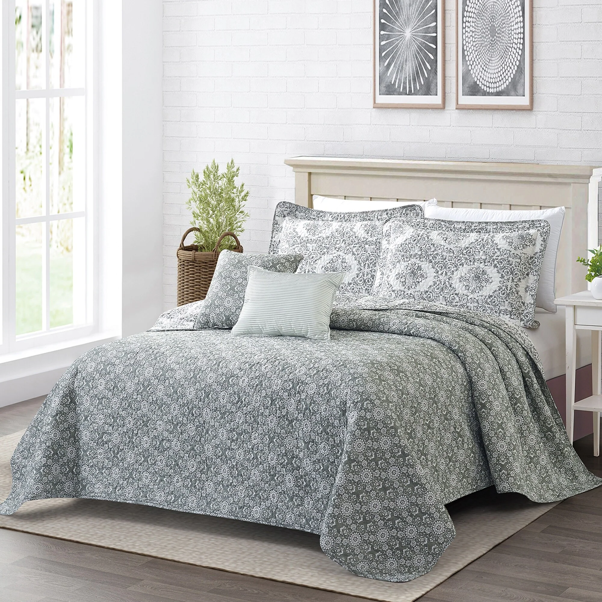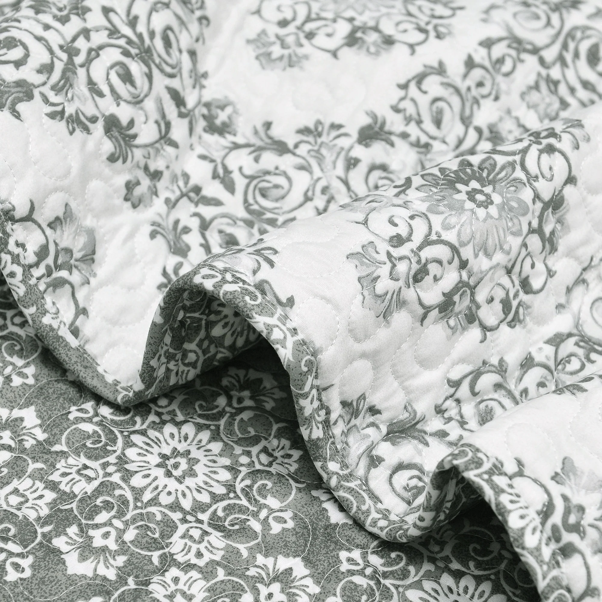 The Home Soft Things 5 Piece Printed Microfiber Legacy Quilts Set is a must-have for any bedroom. This elegant and brilliant quilt features a floral medallion design in shades of gray and white, covering the full area of the bedspread. The quilt is reversible, with a matching gray back with floral prints throughout the back of this coverlet. The set includes (2) matching pillow shams and (3) accent pillows to add extra comfort and style to your bed. The face and backing are made of 100% microfiber ultra-soft polyester with 90% cotton/10% polyester filling, making it durable for all year-round use. The coverlets are finished with a straight-edged, piping hem all the way around. Get ready to transform your bedroom into a retreat where life is pleasing to your senses.