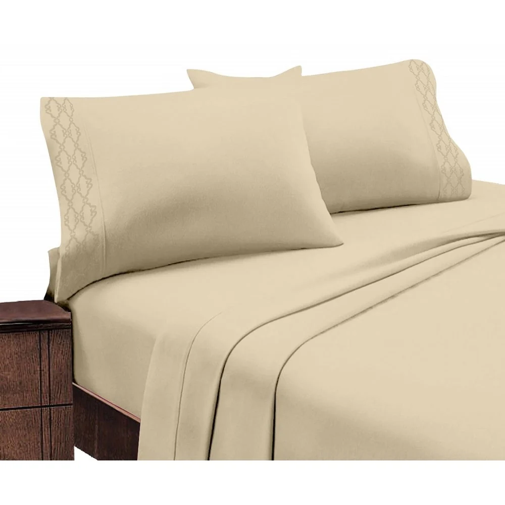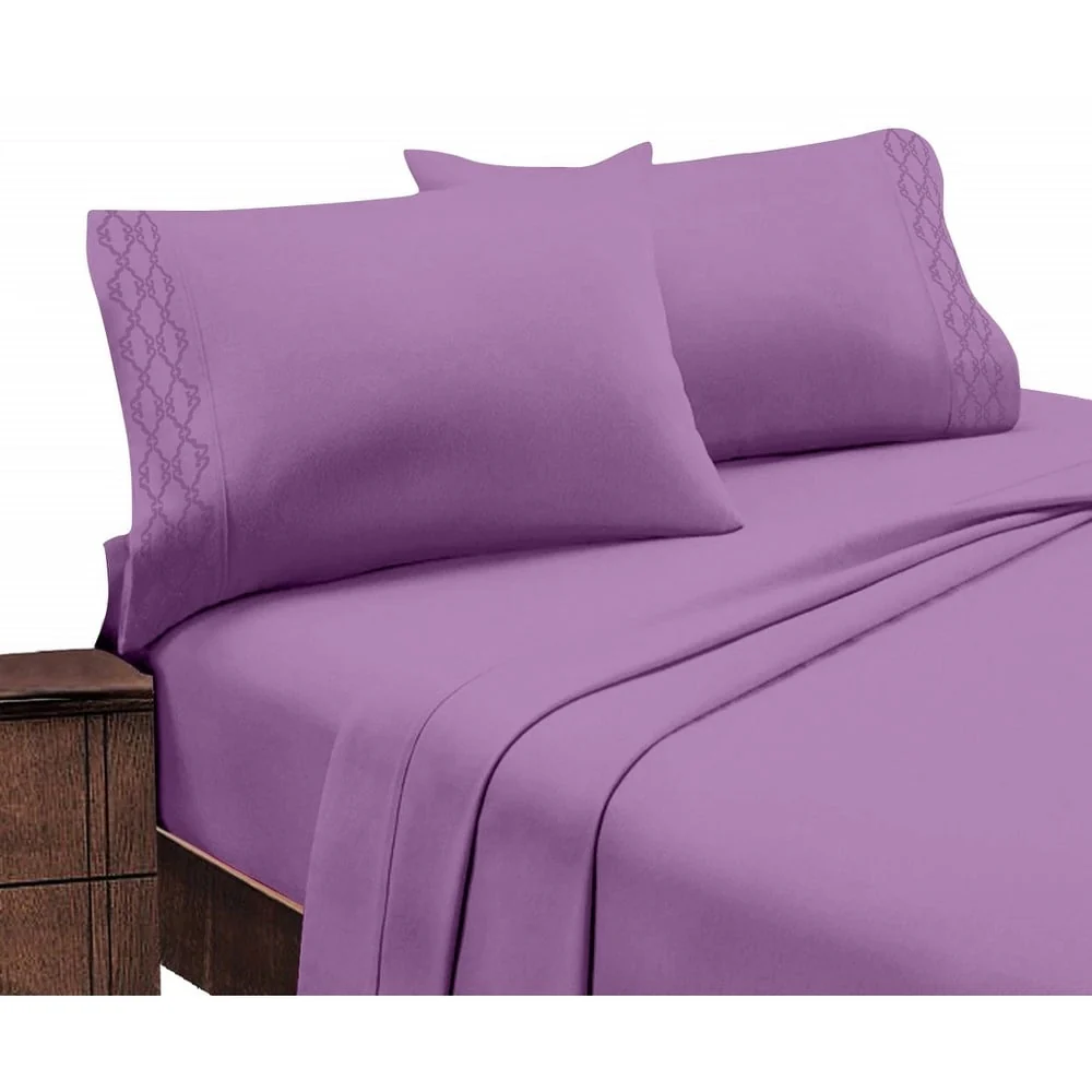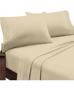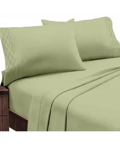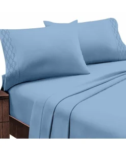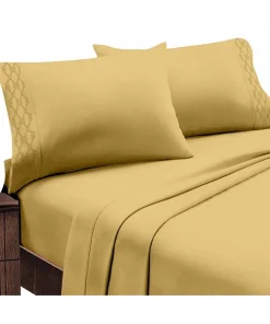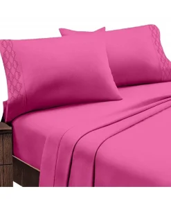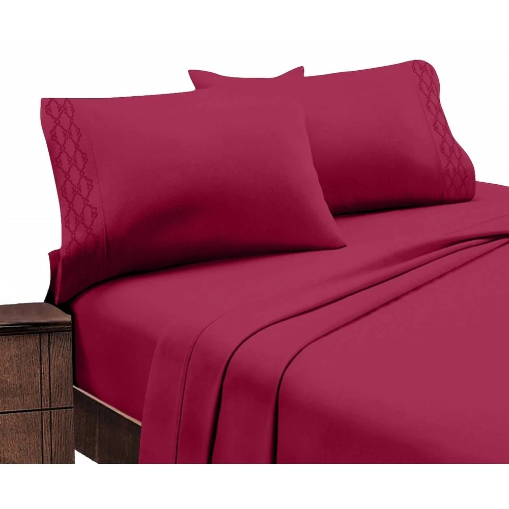 Lend an extra touch of elegance to your bedroom decor with this Hanson sheet set from Porch & Den. The set is crafted from machine washable microfiber for a soft, lightweight feel. The set includes one fitted sheet, one flat sheet, and two pillowcases (only one pillowcase in twin), available in a variety of bright and trendy colors, and embellished with geometric embroidered detailing on the pillowcases for an extra dash of sophistication. Machine washable—wash separately in cold water on a gentle cycle for approximately 15 minutes. Do not wash with other items. Do not bleach. Tumble dry on low. Iron as needed.Features: Made from microfiber Embroidered pattern Deep pocket fits mattress 14" up to 16" Includes 1 fitted sheet,1 flat sheet, and 2 pillowcases (only 1 pillowcase in twin) Machine washableTwin Dimensions: 1 Flat Sheet 66 inches wide x 96 inches long 1 Fitted Sheet 39 inches wide x 75 inches long 1 Pillowcase 20 inches wide x 30 inches longTwin XL Dimensions: 1 Flat Sheet 66 inches wide x 96 inches long 1 Fitted Sheet 39 inches wide x 80 inches long 1 Pillowcase 20 inches wide x 30 inches longFull Dimensions: 1 Flat Sheet 92 inches wide x 96 inches long 1 Fitted Sheet 54 inches wide x 75 inches long 2 Pillowcase 20 inches wide x 30 inches longQueen Dimensions: 1 Flat Sheet 92 inches wide x 102 inches long 1 Fitted Sheet 60 inches wide x 80 inches long 2 Pillowcases 20 inches wide x 30 inches longKing Dimensions: 1 Flat Sheet 102” x 108 inches long 1 Fitted Sheet 78 inches wide x 80 inches long 2 Pillowcases 20 inches wide x 40 inches longCalifornia King Dimensions: 1 Flat Sheet: 102 inches wide x 108 inches long 1 Fitted Sheet: 72 inches wide x 80 inches long 2 Pillowcase: 20 inches wide x 40 inches long