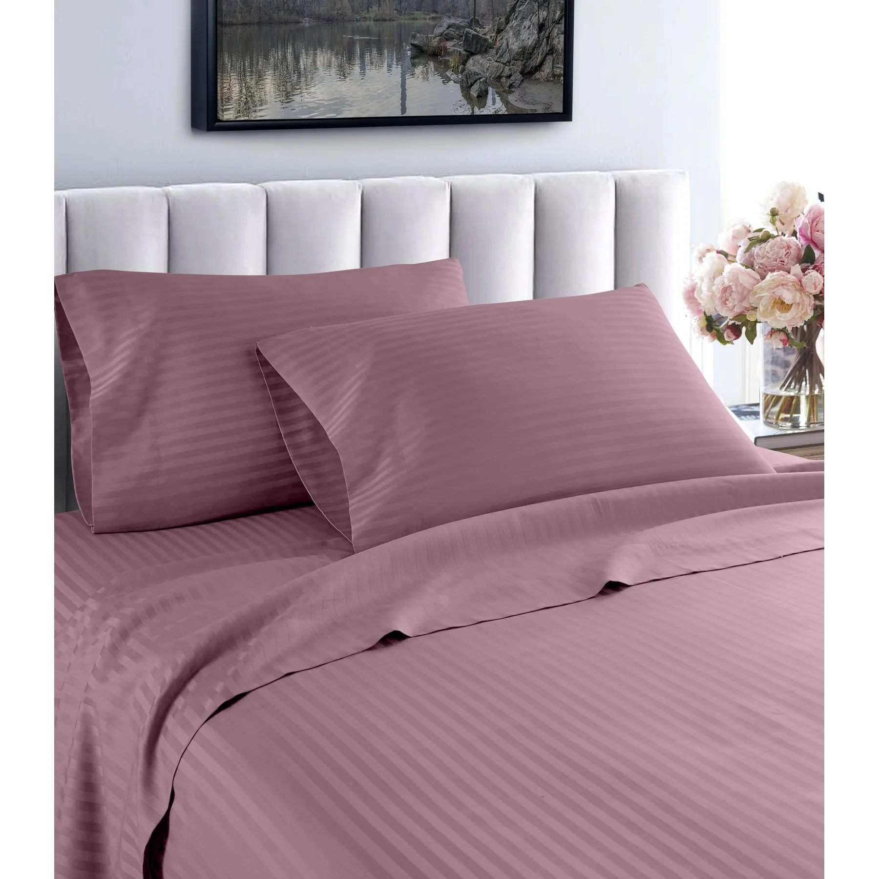 Slip into a luxuriously soft bed each night with these high-quality sheets. Made of Egyptian cotton with a thread count of 600, these sheets feature unmatched quality and comfort. The sheets feature a cool, breathable design and subtle striped pattern for an upscale hotel look. Machine washable—wash separately in cold water on a gentle cycle for approximately 15 minutes. Do not wash with other items. Do not bleach. Tumble dry on low. Iron as needed.Features: Set includes 1 flat sheet, 1 fitted sheet, and 2 pillowcases (1 in Twin/Twin XL set) Crafted of Egyptian cotton Thread count is 600 Cool, breathable feel Tone-on-tone striped pattern Available in various color options Fully elasticized fitted sheet Machine washableTwin Dimensions: Flat Sheet: 66 inches wide x 96 inches long Fitted Sheet: 39 inches wide x 75 inches long Pillowcase: 20 inches wide x 30 inches longTwin XL Dimensions: Flat Sheet: 66 inches wide x 96 inches long Fitted Sheet: 39 inches wide x 80 inches long Pillowcase: 20 inches wide x 30 inches longFull Dimensions: Flat Sheet: 81 inches wide x 96 inches long Fitted Sheet: 54 inches wide x 75 inches long Pillowcases: 20 inches wide x 30 inches longQueen Dimensions: Flat Sheet: 92 inches wide x 102 inches long Fitted Sheet: 60 inches wide x 80 inches long Pillowcases: 20 inches wide x 30 inches longKing Dimensions: Flat Sheet: 102 inches wide x 108 inches long Fitted Sheet: 76 inches wide x 80 inches long Pillowcases: 20 inches wide x 36 inches longCalifornia King Dimensions: Flat Sheet: 102 inches wide x 108 inches long Fitted Sheet: 72 inches wide x 84 inches long Pillowcases: 20 inches wide x 40 inches long