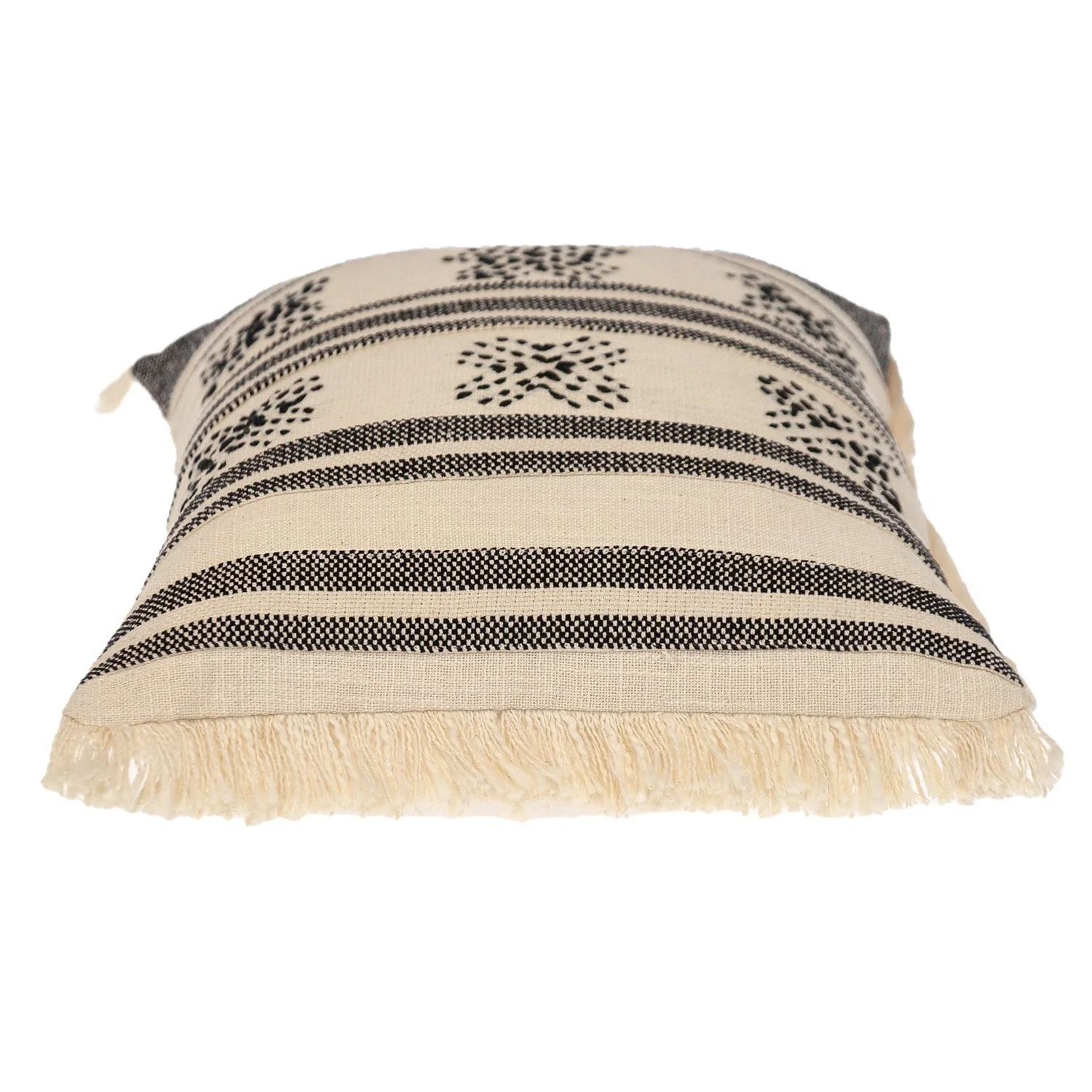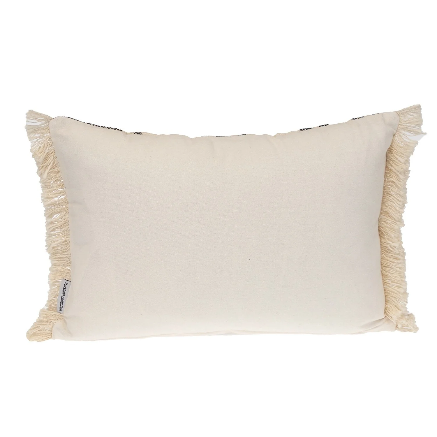 Add an air of fashion to your room and rejuvenate the space with this cute and fashionable 14-inch x 20-inch beige and black southwestern cotton throw pillow with fringe. This beige and black hued piece represents quality construction, expertly made from durable cotton that is not only long lasting but soft to the touch as well. Fun and decorative fringe add some high end and hand-crafted textural designer touches. This soft polyfill filled pillow not only is decorative but made to be comfy and cozy all day long. Decorative throw pillows not only add color and dimension to your space but can be comfy and supportive when you are lounging and cuddling as well. Decorative pillows are a great way to change up the look and feel of your space easily and quickly. 14-inch H x 20-inch W x 7-inch D