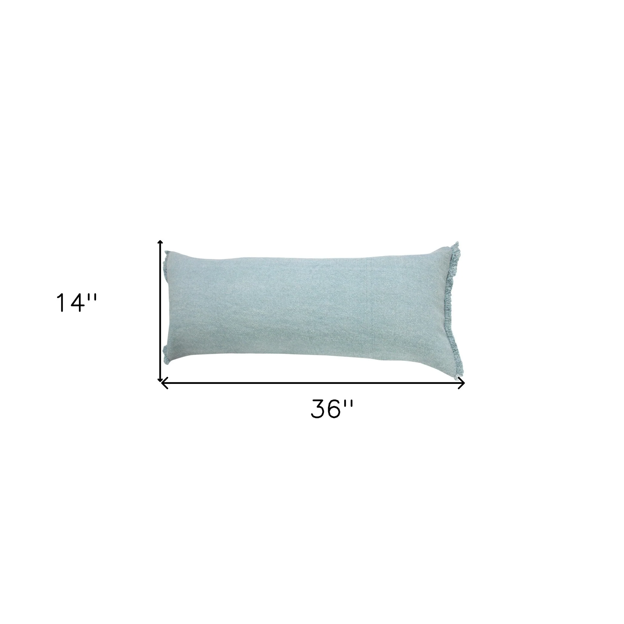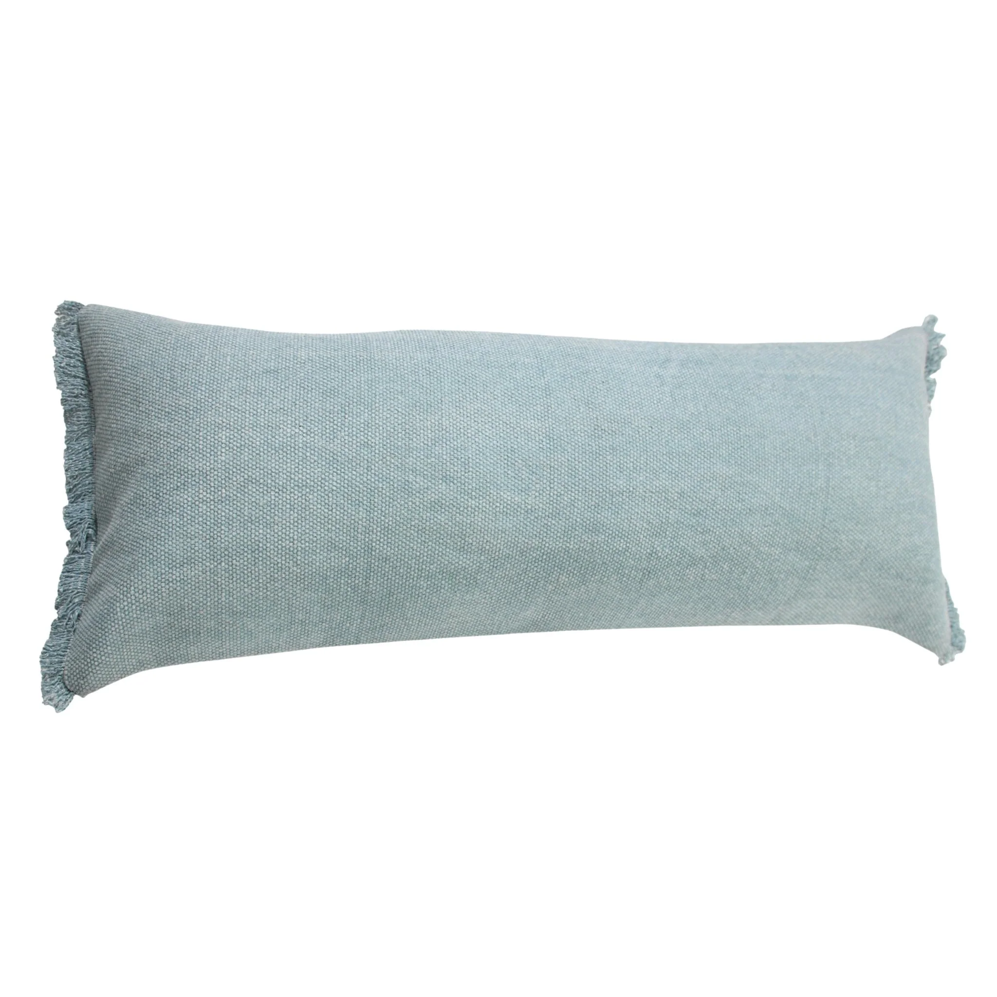 Add an air of fashion to your room and rejuvenate the space with this cute and fashionable 14-inch x 36-inch light blue cotton lumbar throw pillow with fringe. This light blue colored decorative pillow is made from high grade cotton that is durable and long lasting. Super soft and built to hold its shape, this polyfill pillow is a great option. Great to use on its own or mix with other decorations for the perfect look. Decorative pillows are a great way to change up the look and feel of your space easily and quickly. 14-inch H x 36-inch W x 7.5-inch D