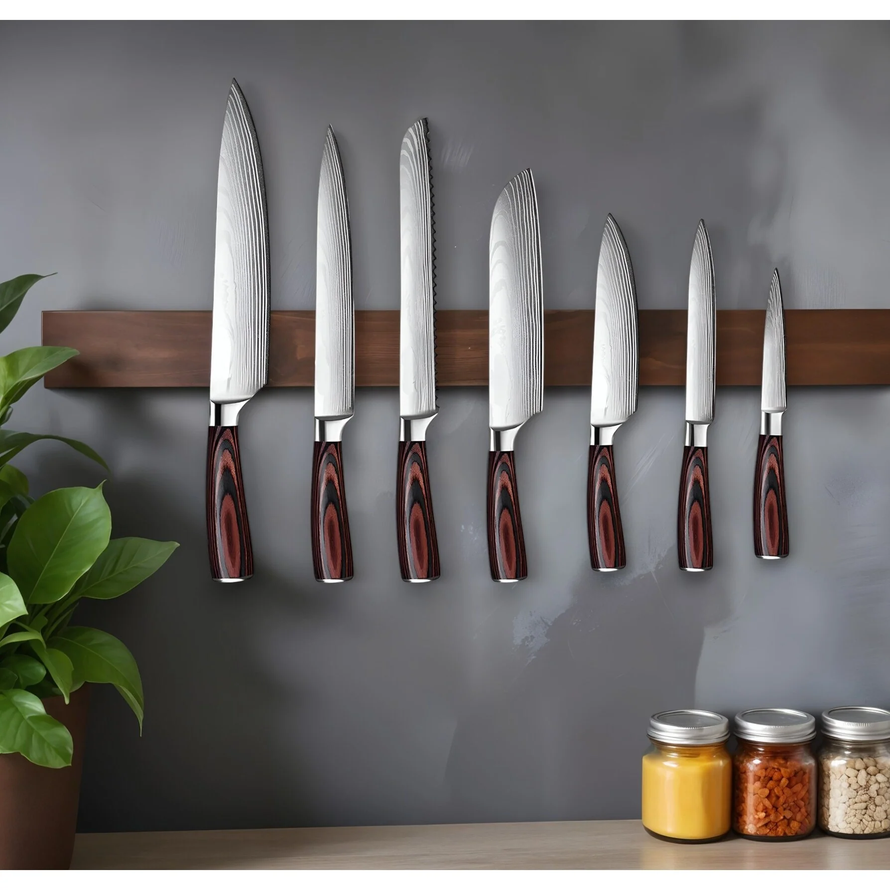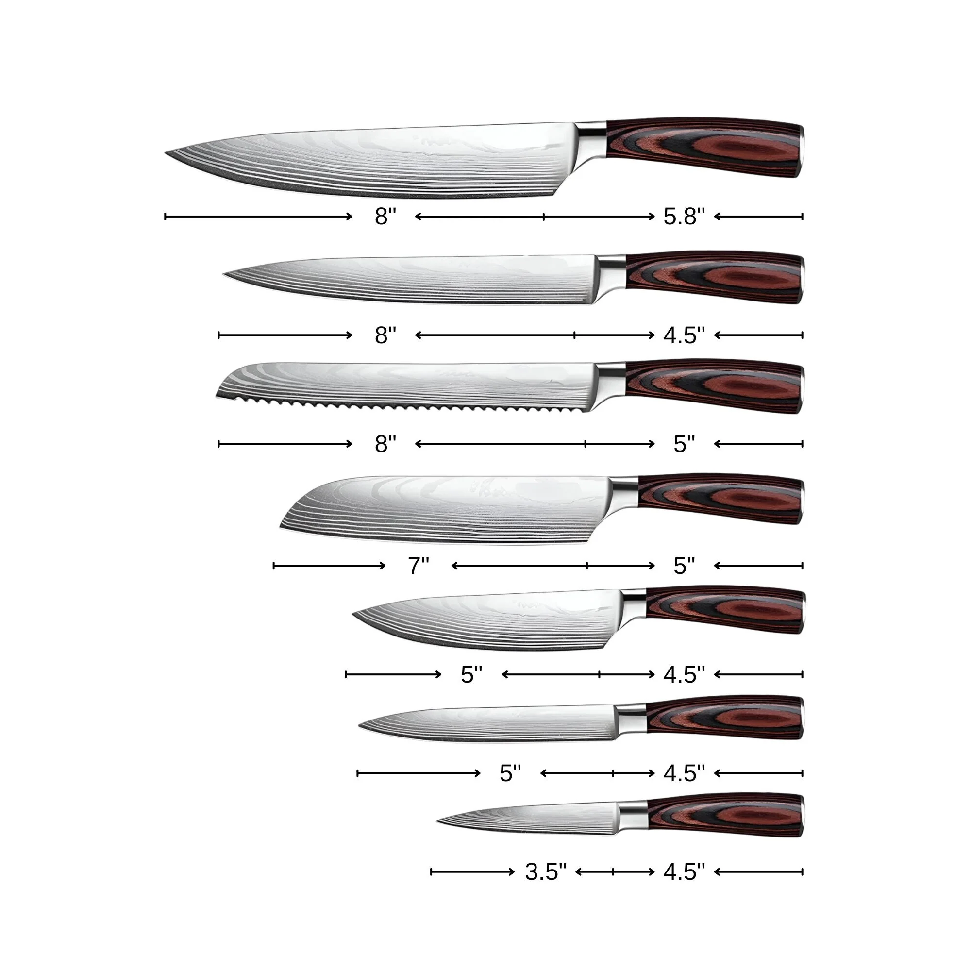The black and brown wood seven piece cutlery set offers a comprehensive solution for your dining needs. Designed to serve seven, this knife cutlery set is perfect for gatherings and everyday meals. Crafted with a stunning damascus handle pattern, it exudes elegance and sophistication. Each piece is machine-made from high-quality stainless steel, ensuring durability and longevity. The transitional style combines classic and modern elements, making it a versatile addition to your table setting. The rich brown and silver color palette enhances its aesthetic appeal, making it suitable for any decor theme. Elevate your dining experience with this exquisite cutlery set that blends functionality and style seamlessly. 15-inch h x 5-inch w x 3-inch d.