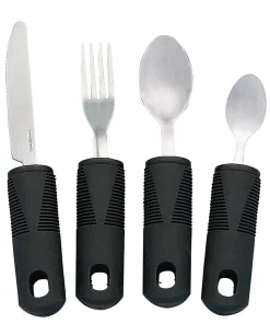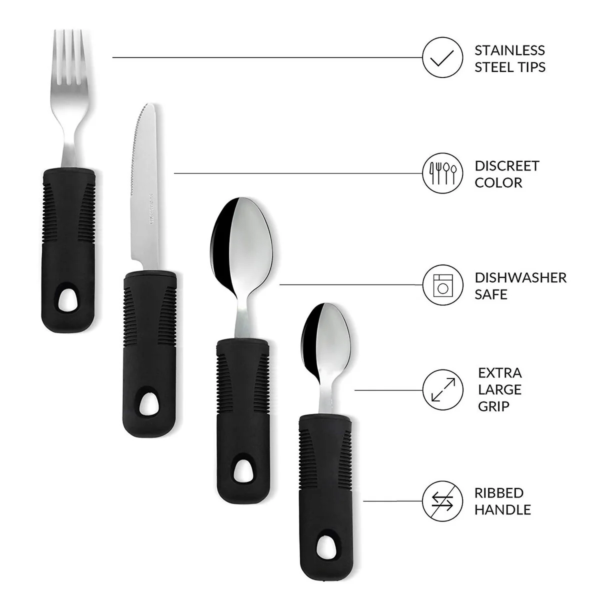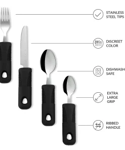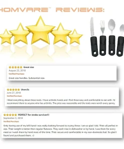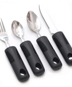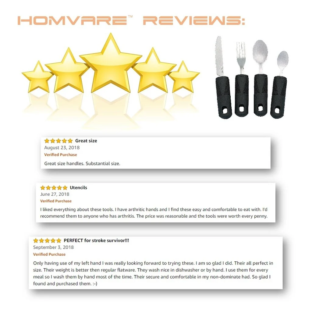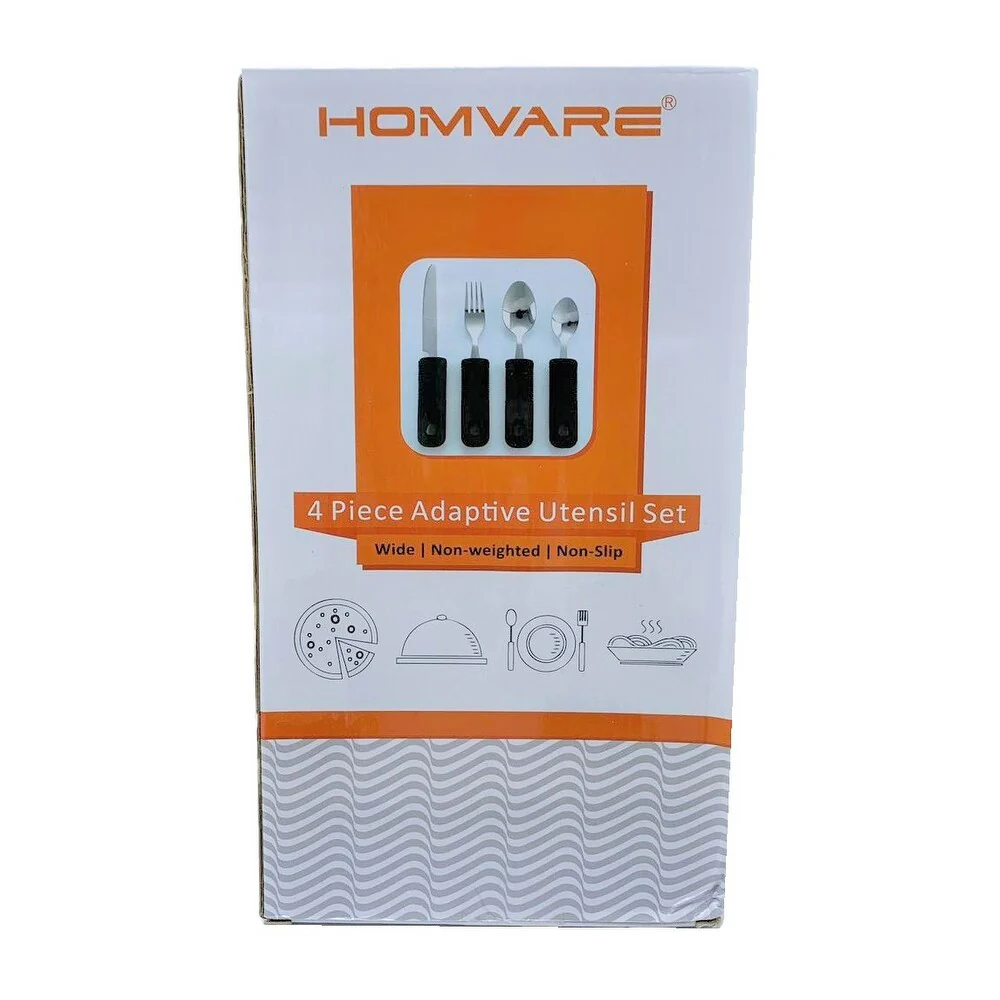 Homvare® Adaptive utensils are designed to provide help to those who need a little comfort and support when it’s time for a great meal. When you suffer from tremors, arthritis, low grip strength or even Parkinson’s Disease, it can be a challenge to even enjoy a simple meal. That’s why we created a smarter, more effective solution for helping those with adaptive needs—Homvare ® Adaptive Utensils Set. Wide, Textured Grip Design Easier to use than your standard metal, ceramic or smooth-designed utensils, these forks, spoons, and knives feature an ultra-wide handle with silicone ridges that makes it easier for someone to grasp and hold onto. Great for seniors, youth and anyone who needs a bit more support at the table, give back much-needed confidence with utensils that are made specifically for adaptive needs. Product Details: Adaptive Utensils (4-Piece Set) Wide, Textured, Non-Slip Handles Stainless Steel Construction Dishwasher Safe Available Colors: Black or Gray
