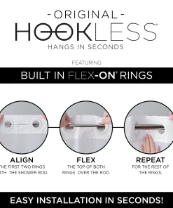 - Experience effortless installation with our FLEX-ON built-in rings, designed to slide smoothly onto your shower rod without the need for separate hooks   Â