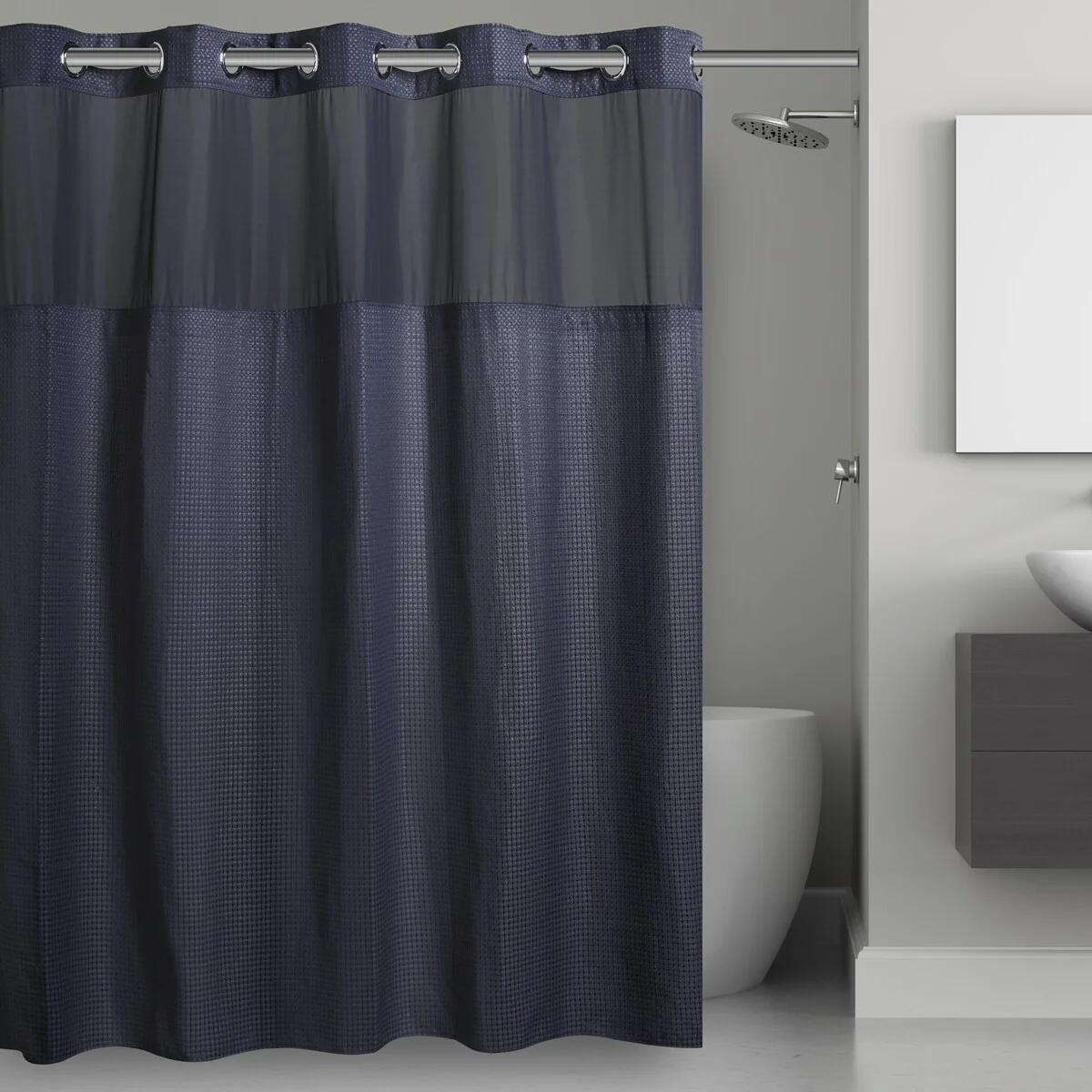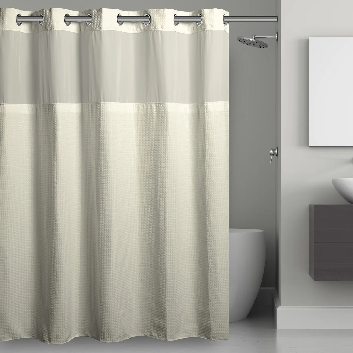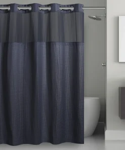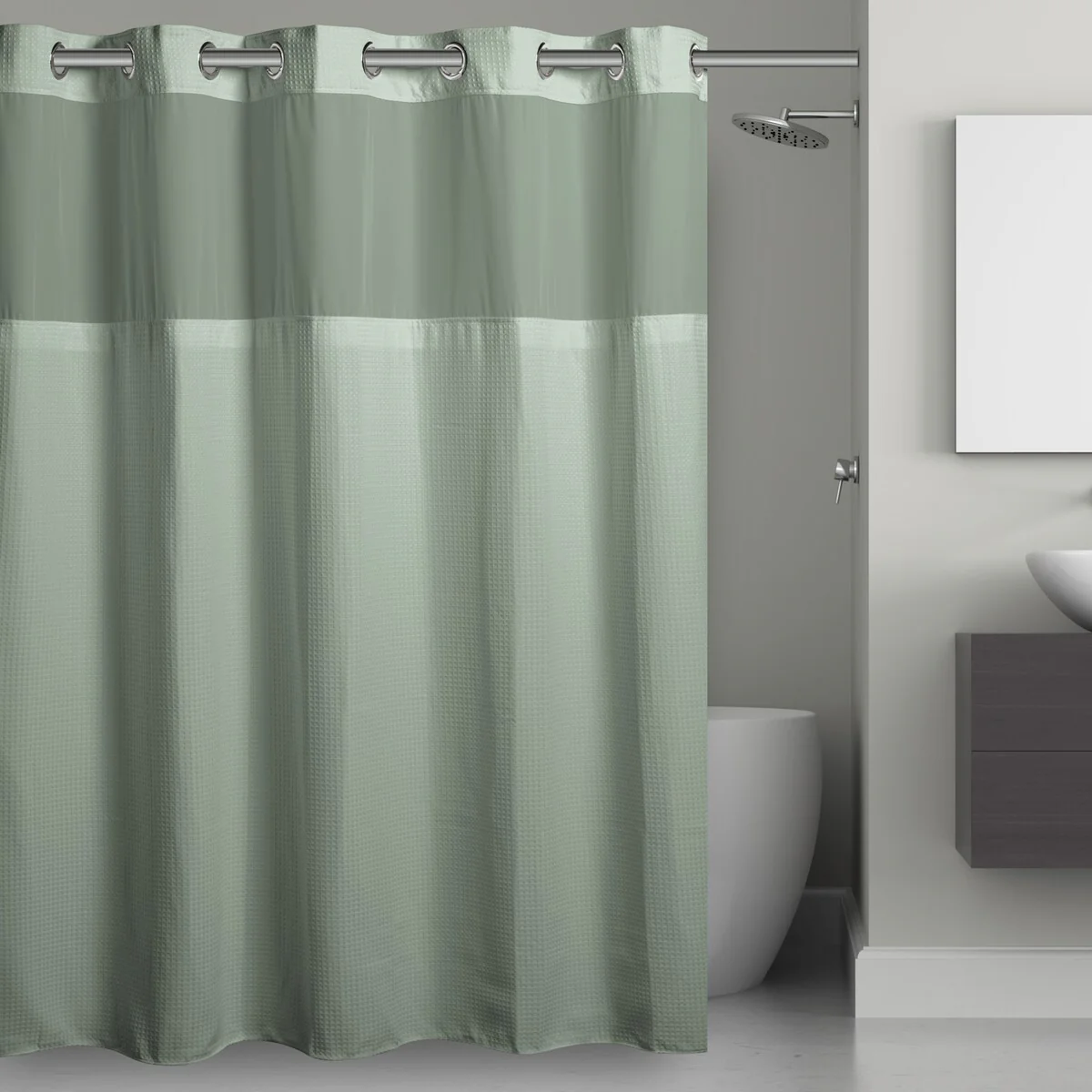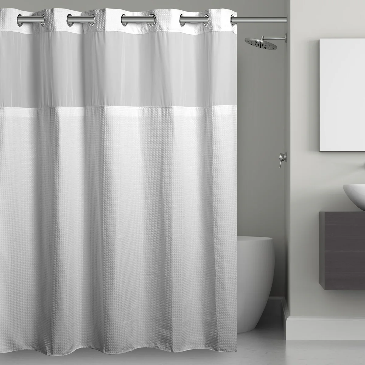 The innovative Hookless Waffle Shower Curtain is designed to enhance your space effortlessly. The bathroom curtain set includes the fabric shower curtain, built-in rings, fabric liner, and a sheer window, providing a complete solution for your bathroom. This shower curtain set offers a 3-in-1 value, transforming your bathroom decor in seconds without the hassle of hooks. With no need to remove the rod, the shower curtain slides right on with its FLEX-ON built-in rings that won’t rust. The It’s A Snap! shower liner, is made of polyester fabric, and snaps on and off easily for quick replacements and water repellence. Our shower curtain features a sheer window for natural light, maintaining privacy while reducing humidity and moisture. Our OEKO-TEX certified Hookless shower curtains, are crafted with safety in mind. Maintenance of these bath curtains is also a breeze; simply shake off excess water after each use and hang the curtain to air dry. For cleaning, machine   wash the curtain and liner on a gentle cycle or replace the liner as needed. After each use shake off the water let the curtain hang freely outside the tub and allow it to air dry.    Â