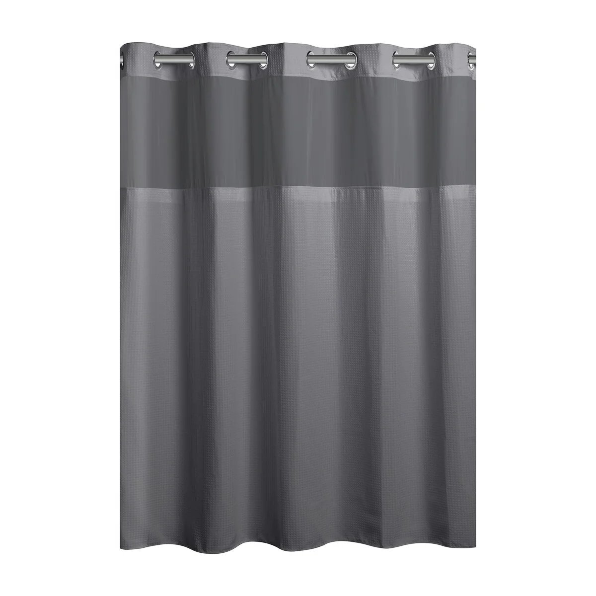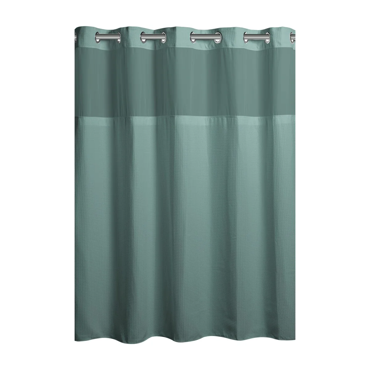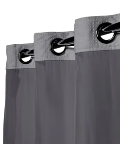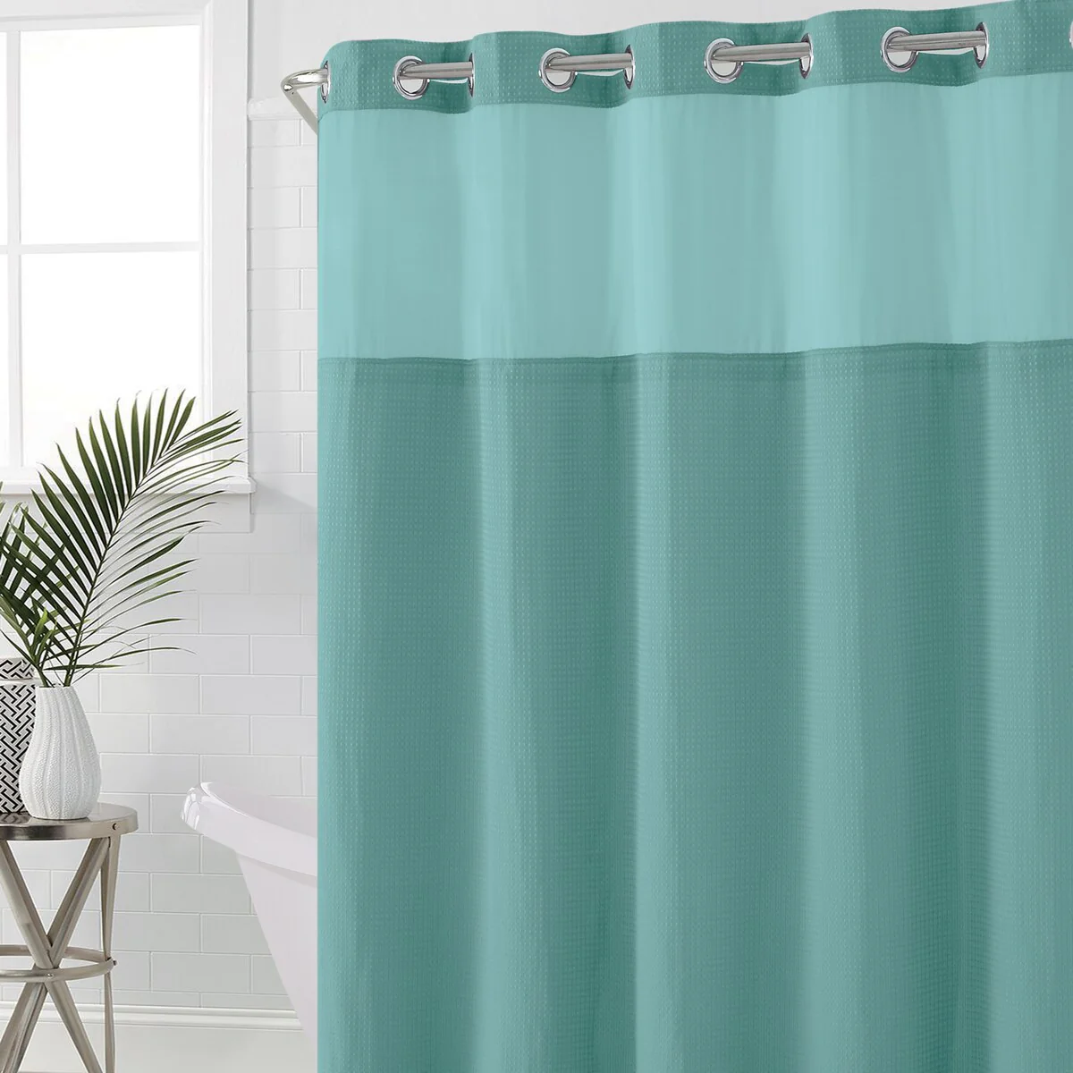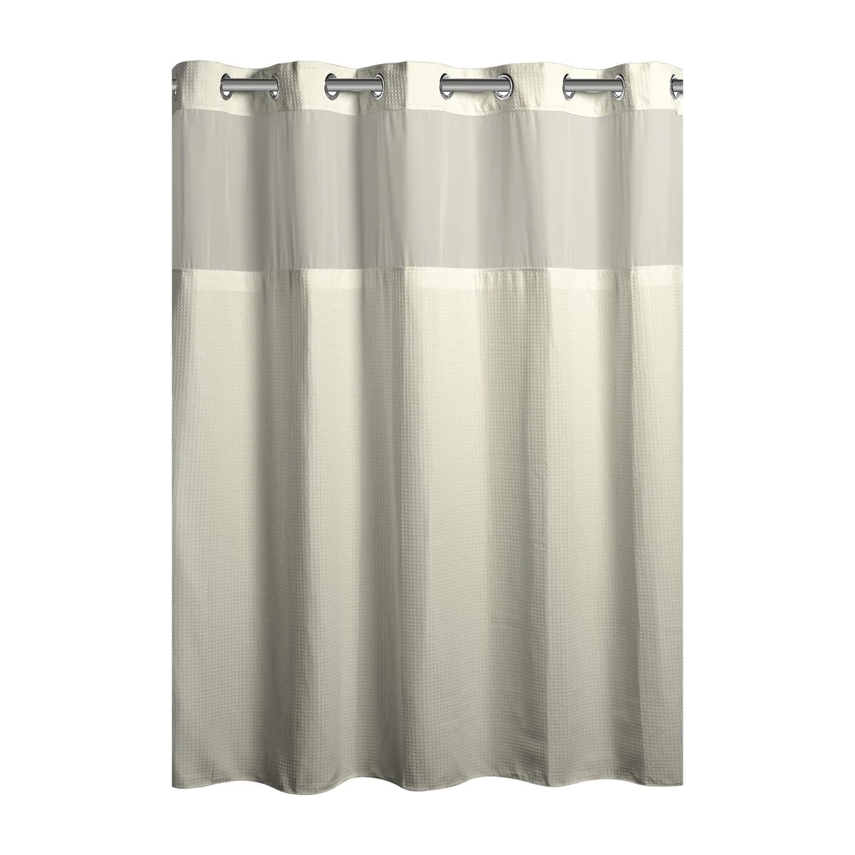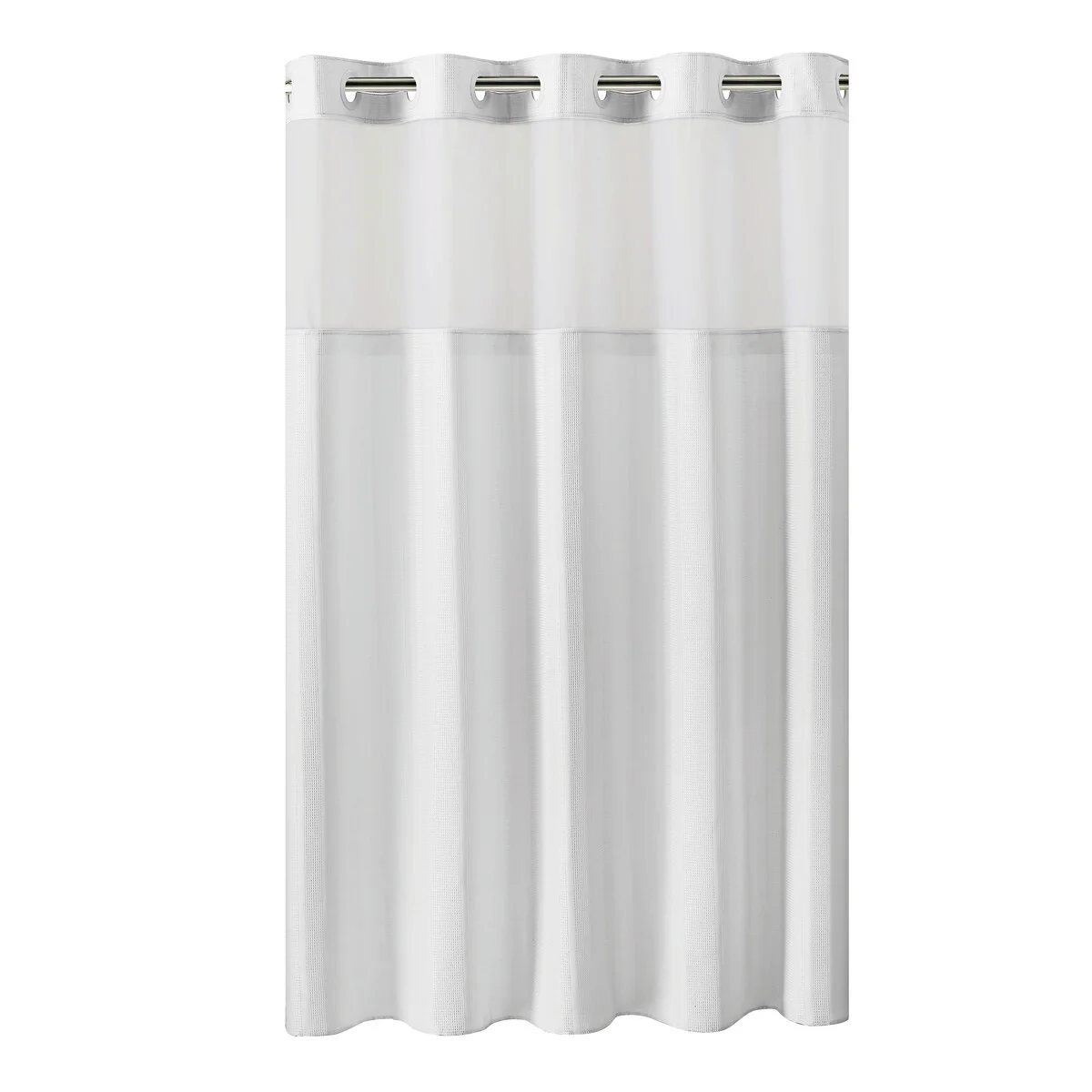 The innovative Hookless Waffle Shower Curtain is designed to enhance your space effortlessly. The bathroom curtain set includes the fabric shower curtain, built-in rings, fabric liner, and a sheer window, providing a complete solution for your bathroom. This shower curtain set offers a 3-in-1 value, transforming your bathroom decor in seconds without the hassle of hooks. With no need to remove the rod, the shower curtain slides right on with its FLEX-ON built-in rings that won’t rust. The It’s A Snap! shower liner, is made of polyester fabric, and snaps on and off easily for quick replacements and water repellence. Our shower curtain features a sheer window for natural light, maintaining privacy while reducing humidity and moisture. Our OEKO-TEX certified Hookless shower curtains, are crafted with safety in mind. Maintenance of these bath curtains is also a breeze; simply shake off excess water after each use and hang the curtain to air dry. For cleaning, machine   wash the curtain and liner on a gentle cycle or replace the liner as needed. After each use shake off the water let the curtain hang freely outside the tub and allow it to air dry.    Â