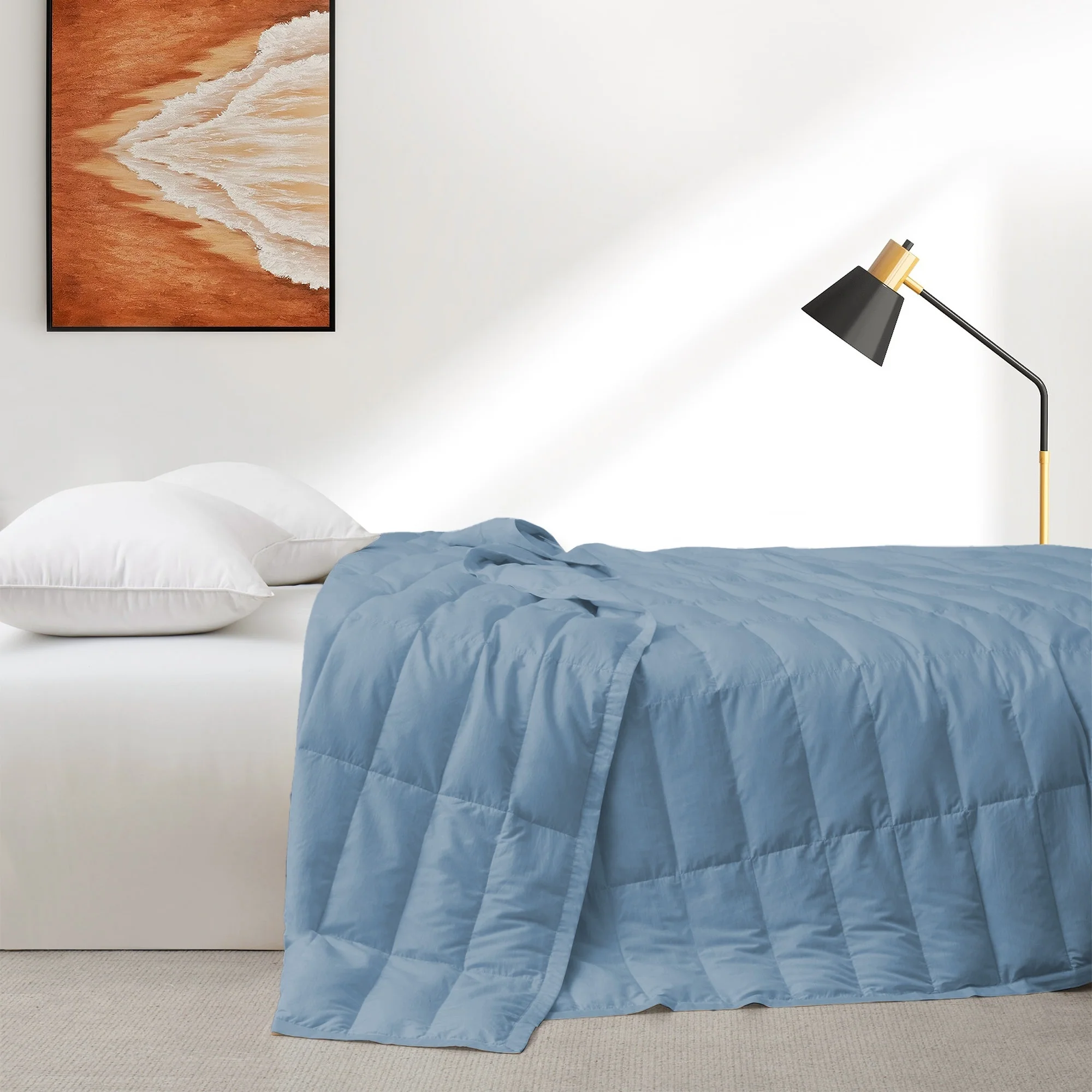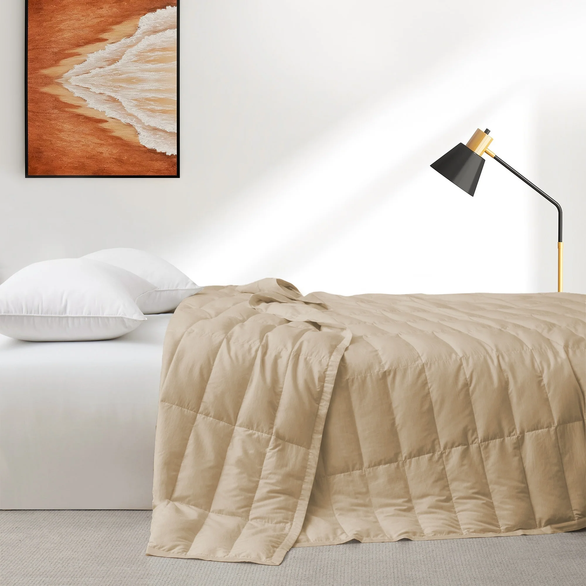 Filled with premium white down (75% down, 25% feather), this blanket offers a plush yet breathable layer of warmth, making it perfect for cooler months. The natural down fill retains heat while allowing for airflow, keeping you comfortably warm without overheating. This down blanket is ideal for year-round use, providing warmth during colder months while maintaining the breathability needed for transitional seasons.