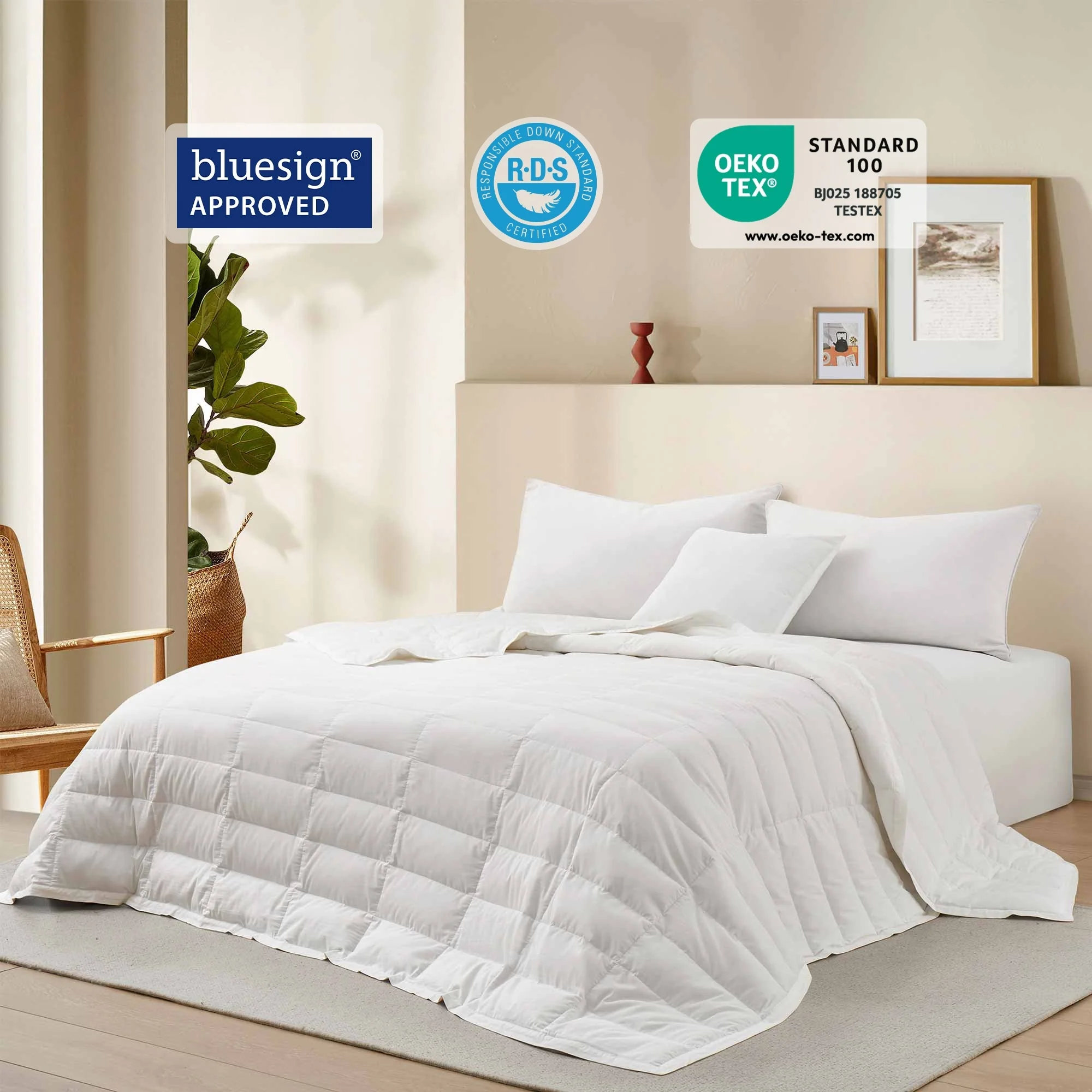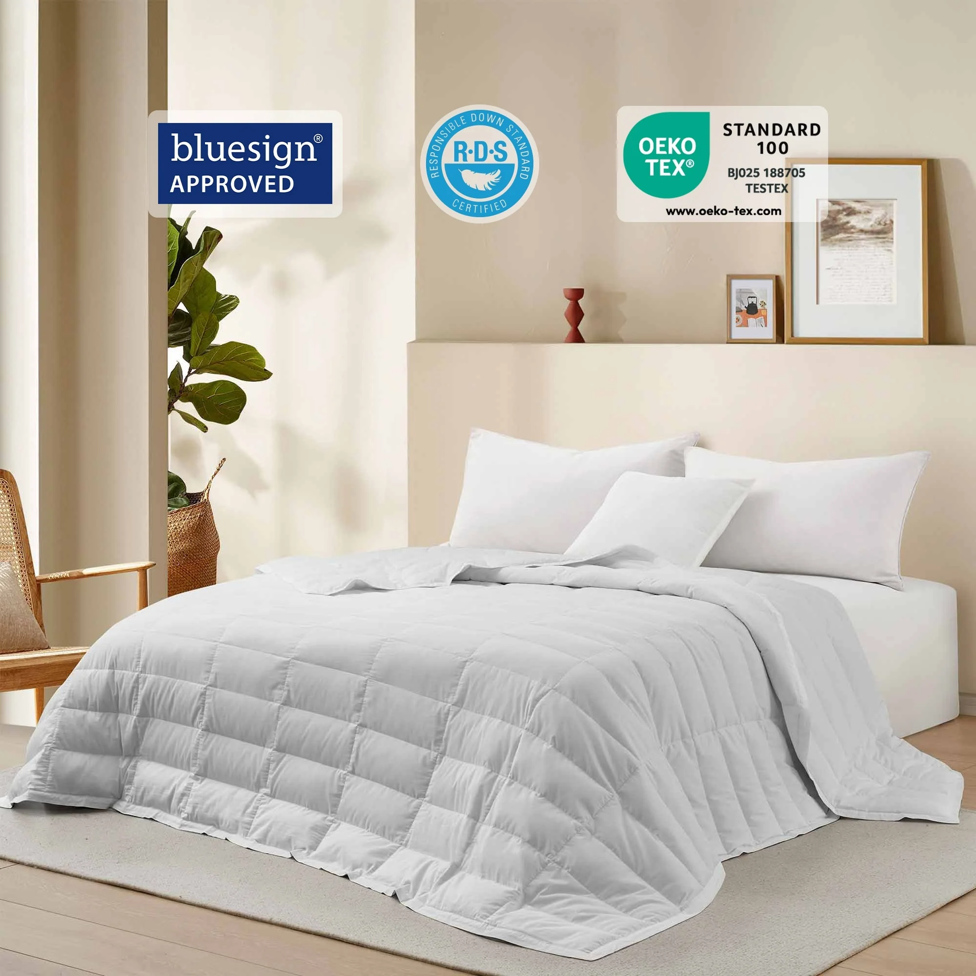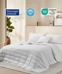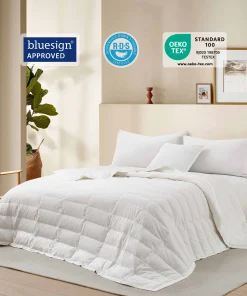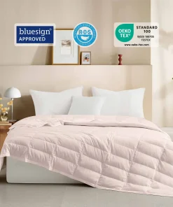- Premium Down & Feather Fill: Filled with 75% white down and 25% white feather, this blanket strikes the perfect balance between warmth and breathability, offering cozy comfort for cooler nights. Bluesign certified for eco-friendly production.
