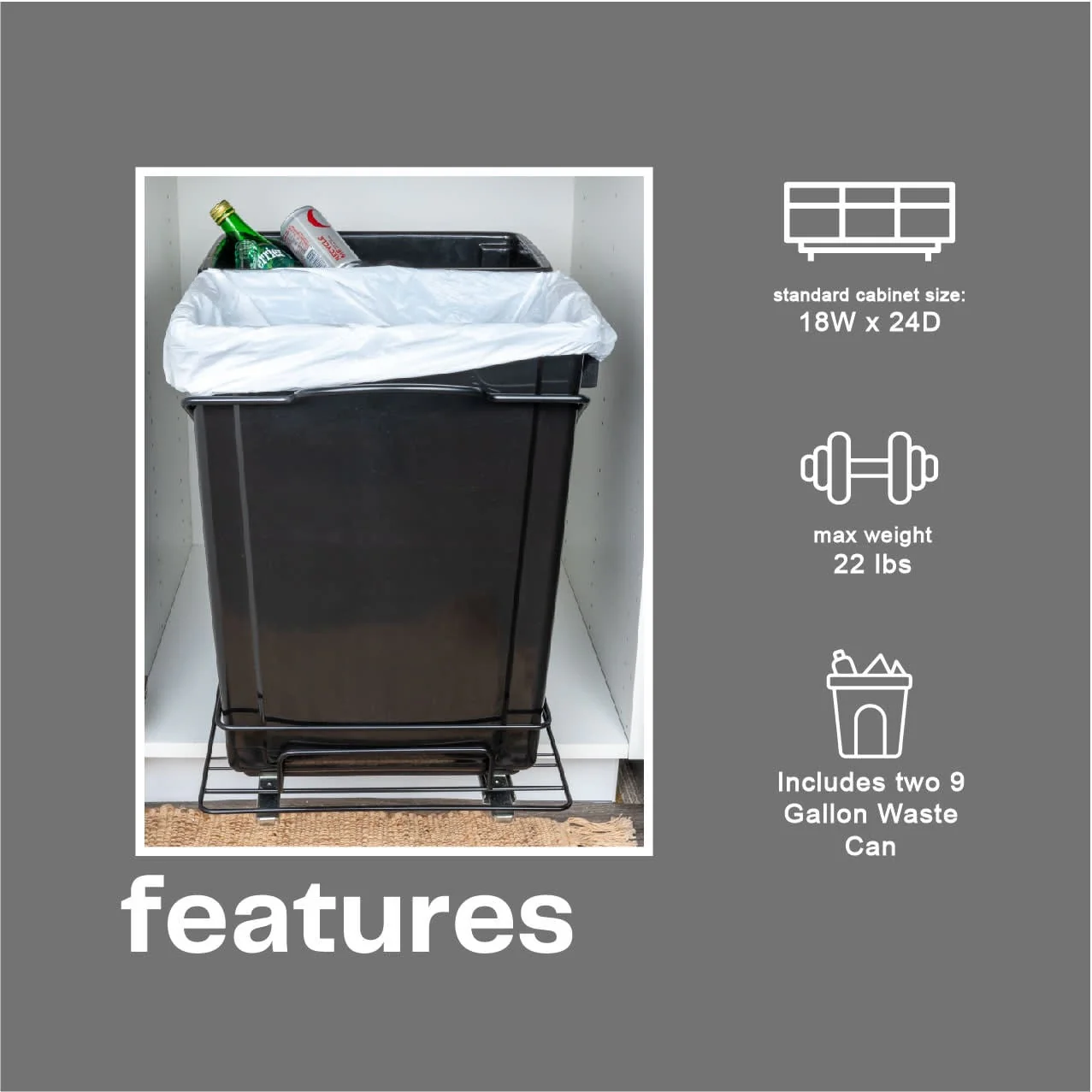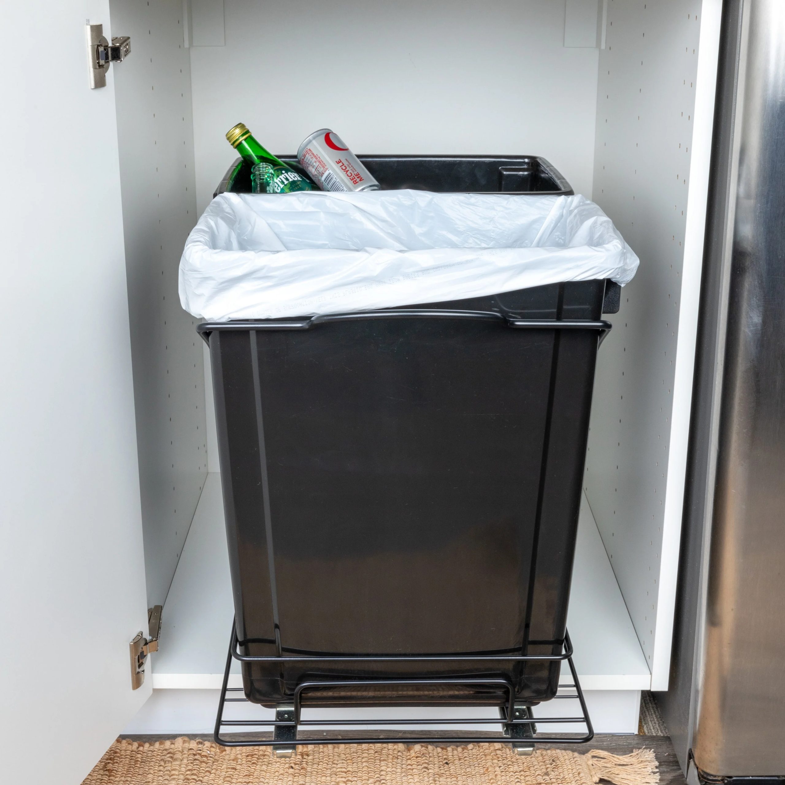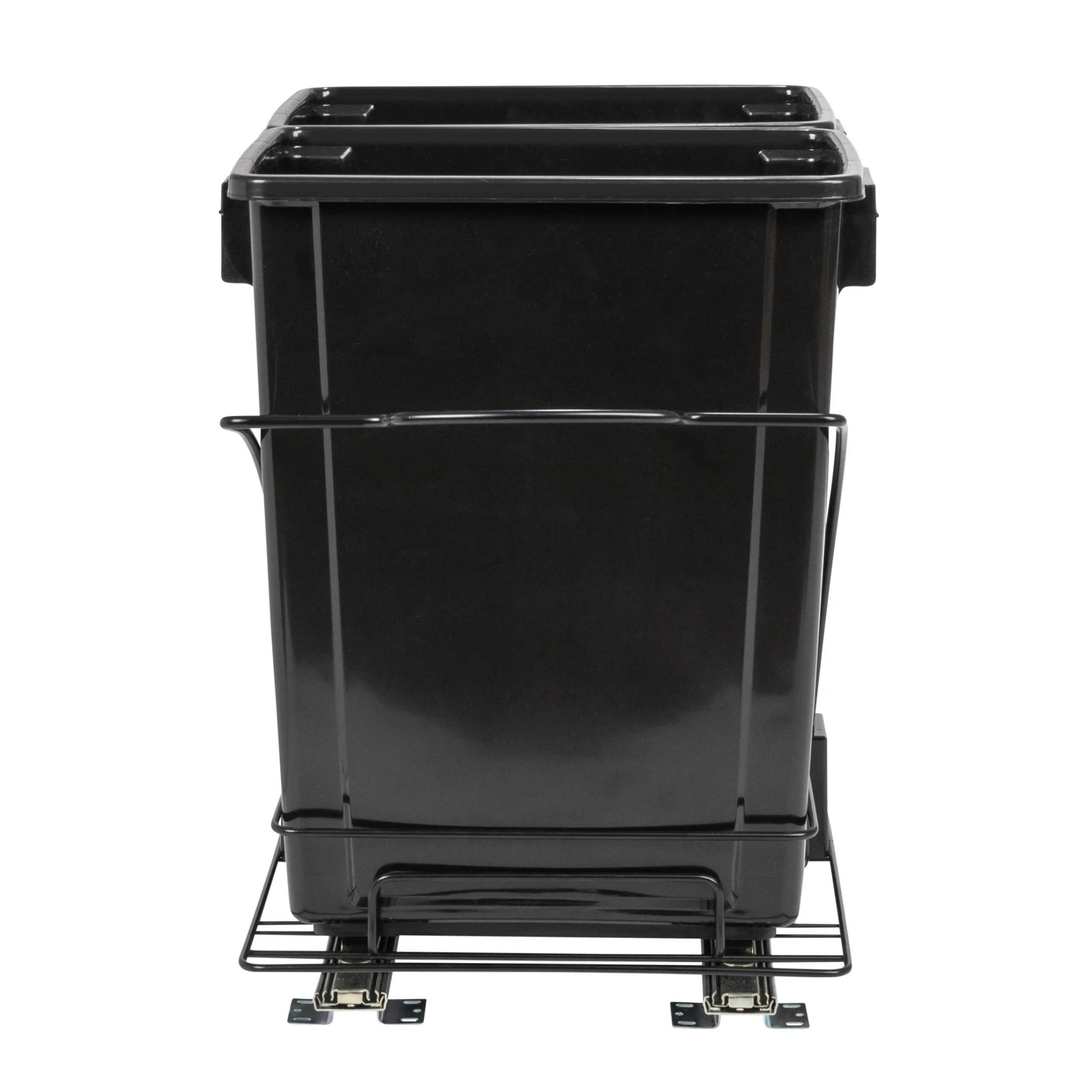 This innovative set of trash cans is designed to provide a discreet and convenient garbage and recycling solution for any kitchen. With its chrome-plated steel base and easy-mount, full-extension, ball-bearing sliding mechanism, it combines functionality with a sleek design. This set of plastic waste bins is cleverly designed to keep garbage out of sight. With a chrome-plated steel base and a full-extension, ball-bearing sliding mechanism, it allows the trash cans to easily slide out for convenient disposal, while keeping them discreetly hidden under cabinets. Designed to fit most standard kitchen cabinetry, the steel framework can be mounted directly onto hard surfaces. Installing it is a simple process, as all the necessary mounting hardware is included. Follow the provided instructions, and the trash cans will be ready for use in no time.
