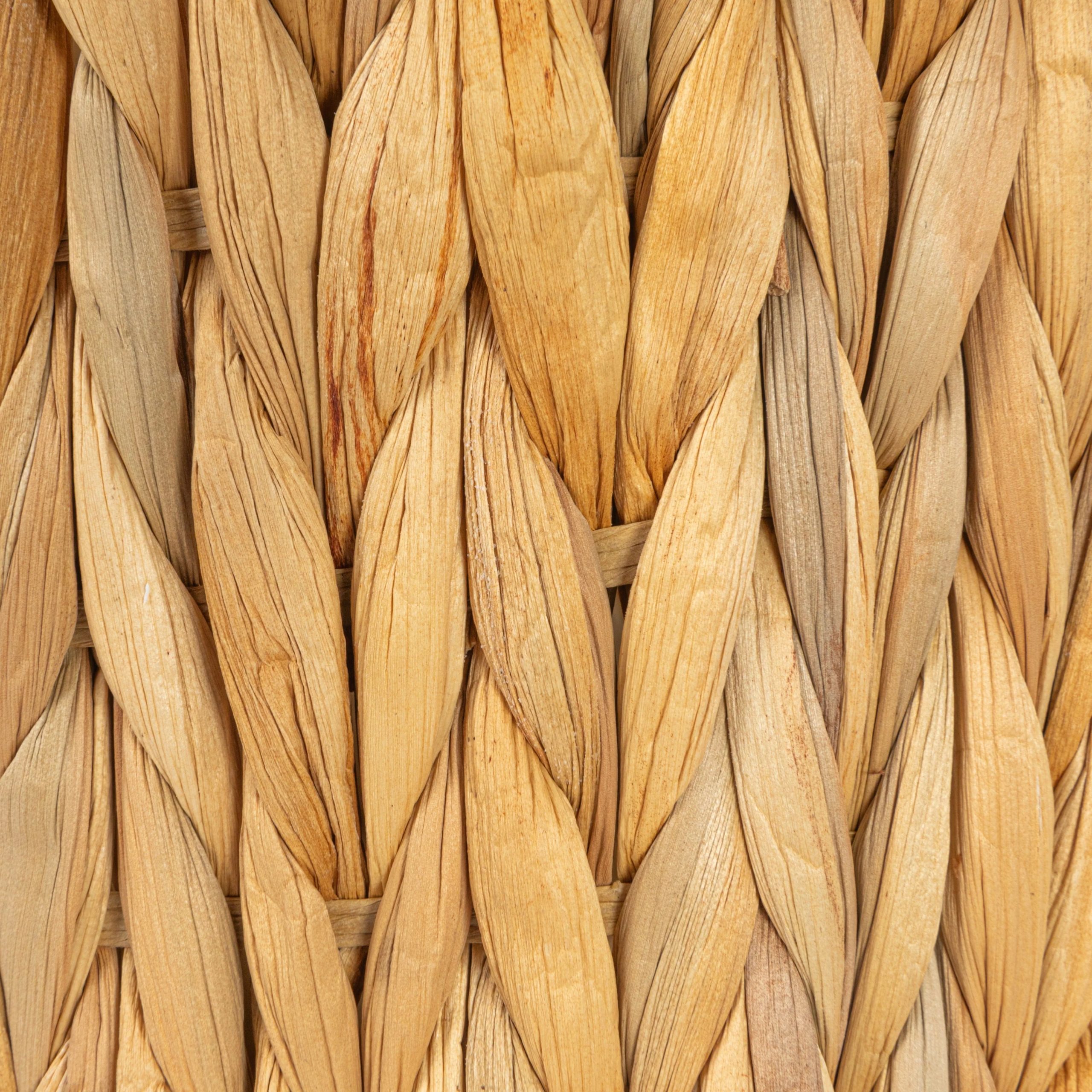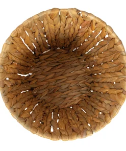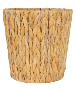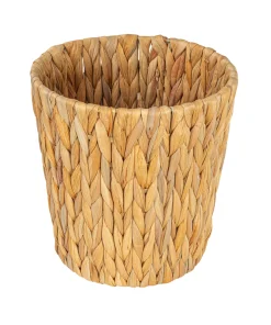 - A natural water hyacinth waste basket with a round, tapered shape and a plastic liner included