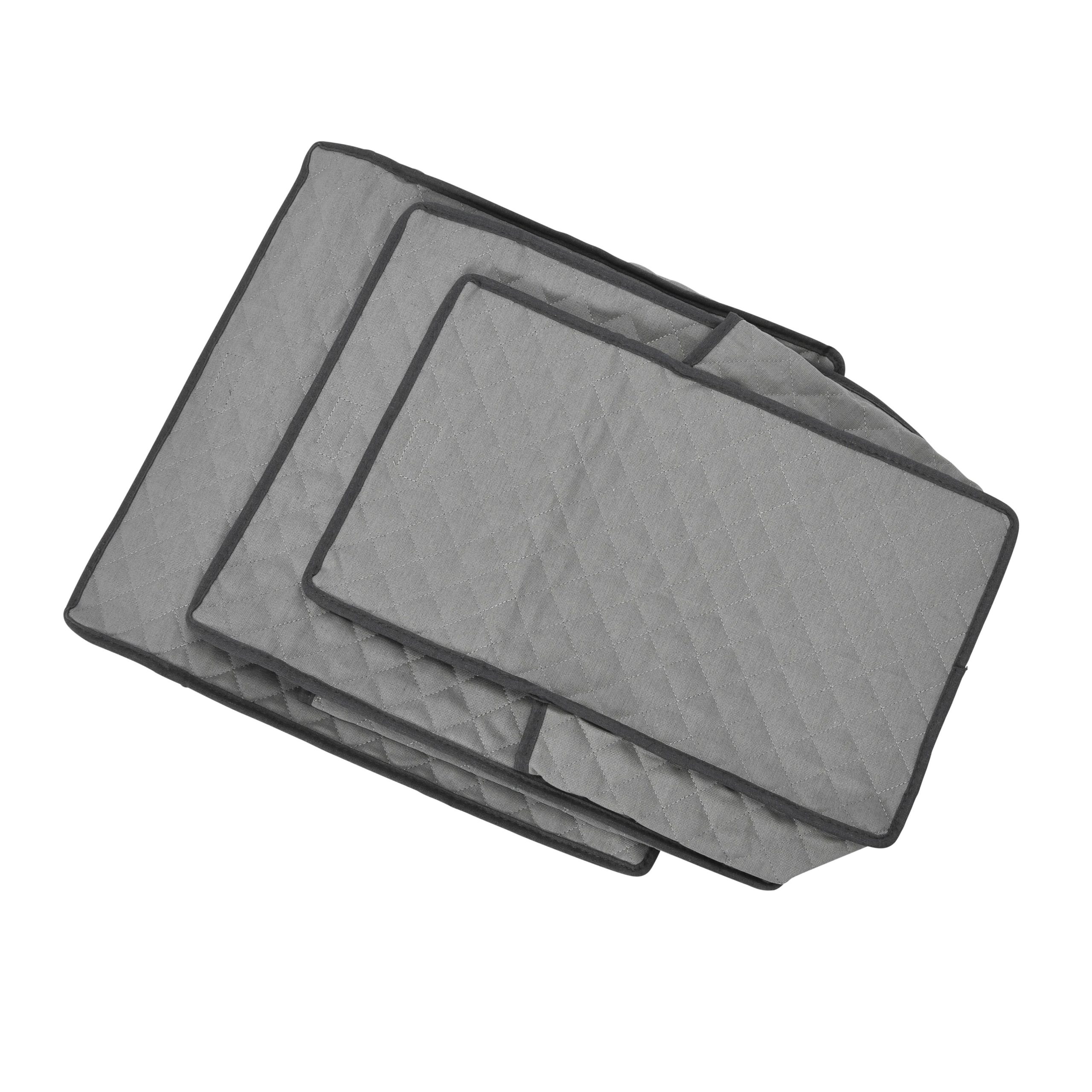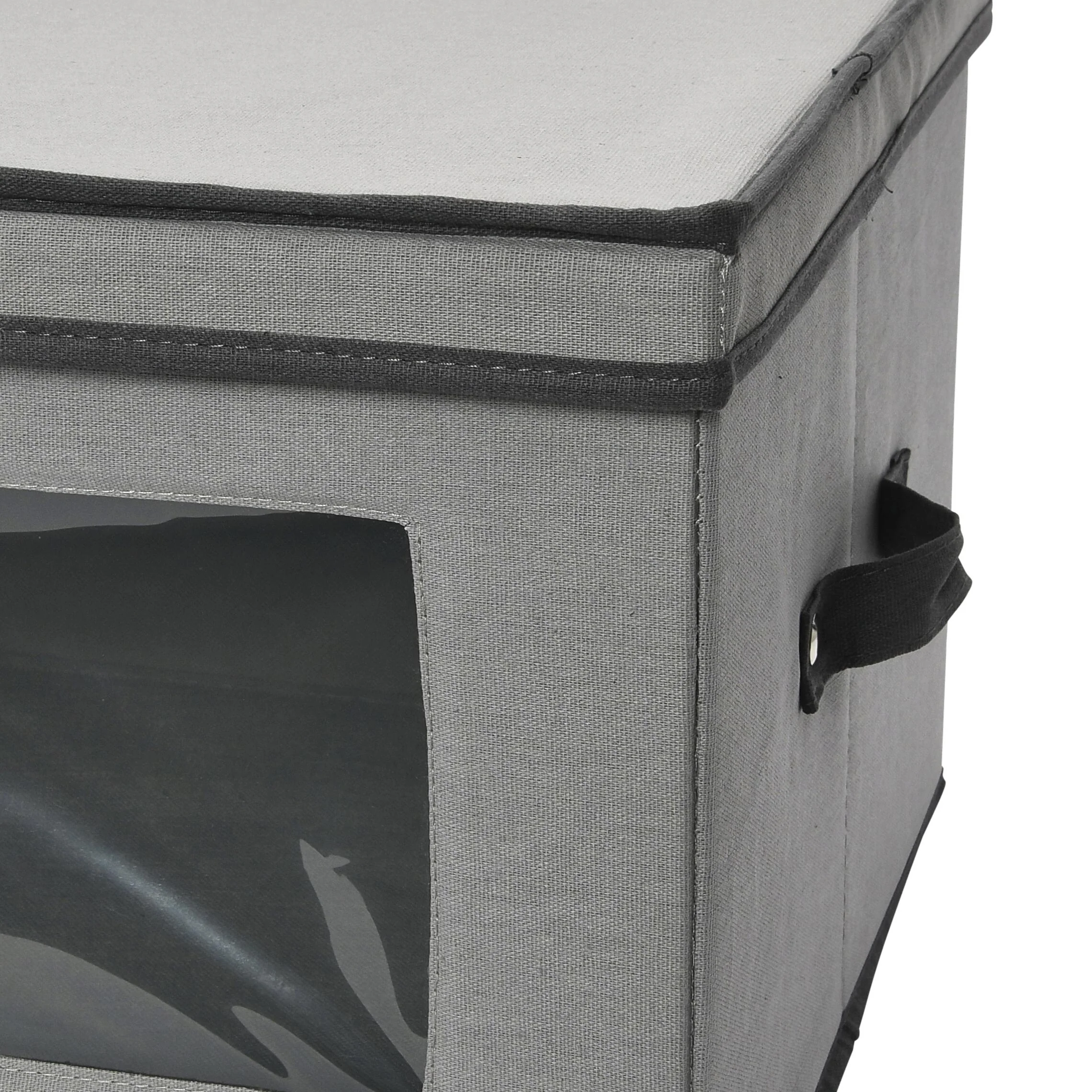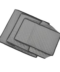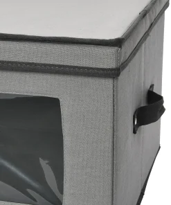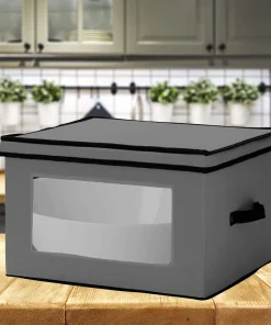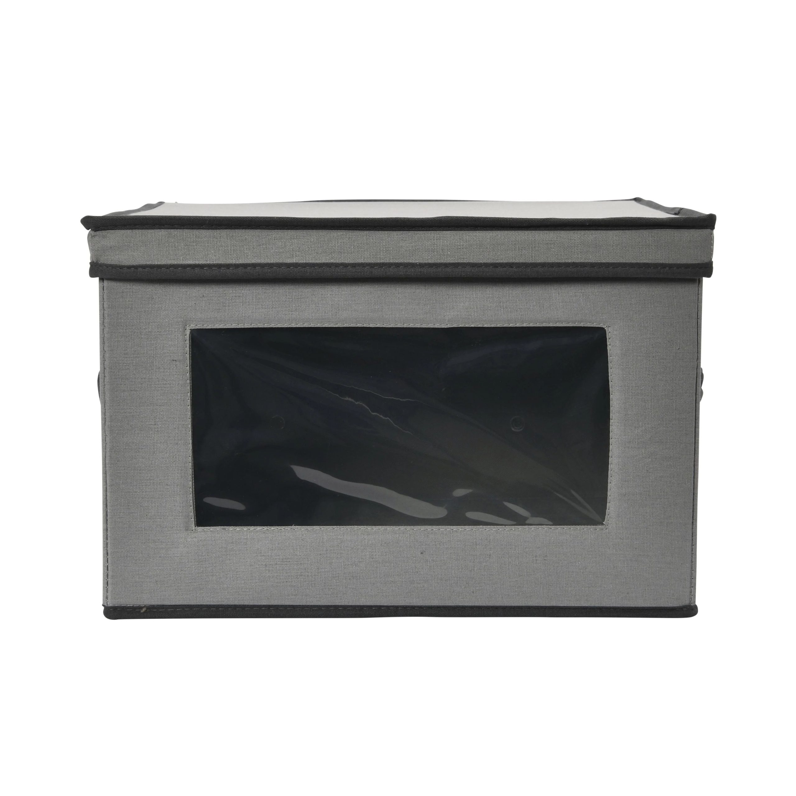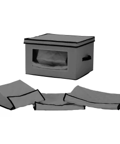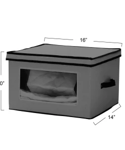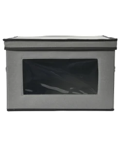 Chipped soup bowls and cracked plates will no longer be a worry with the use of this large serveware storage box. Its attractive but minimalist style makes it perfect for leaving out on display or tucked away in a storage closet. This storage box is made of a durable polyester canvas lining over sturdy fiberboard sides. This provides the necessary structure to protect items inside from becoming crushed and allows multiple to be stacked on top of each other. A pair of reinforced handles make for comfortable carrying to and from storage. With this box comes 3 padded pouches for protecting various serveware. These pouches come in 3 different sizes to accommodate for rectangular trays, square or circular trays and serving bowls. Storing rectangular tray (16.75"W x 15"D x 2"H), square or round tray (15.75"W and D x 2"H), and bowl (10.75"DIA x 5.5"H) The fully removable lid will make loading and unloading items from this box hassle-free. Meanwhile, the see-through front panel provides a look into the box’s contents without needing to remove the lid. This will make sifting through boxes of dishware, holiday ornaments and other items in storage quick and easy. With a much longer lifespan than a traditional cardboard box with indecipherable labeling, this canvas serveware storage box is the perfect way to preserve your holiday or specialty dinnerware. No assembly is required, and the box folds flat for compact storage when not in use.