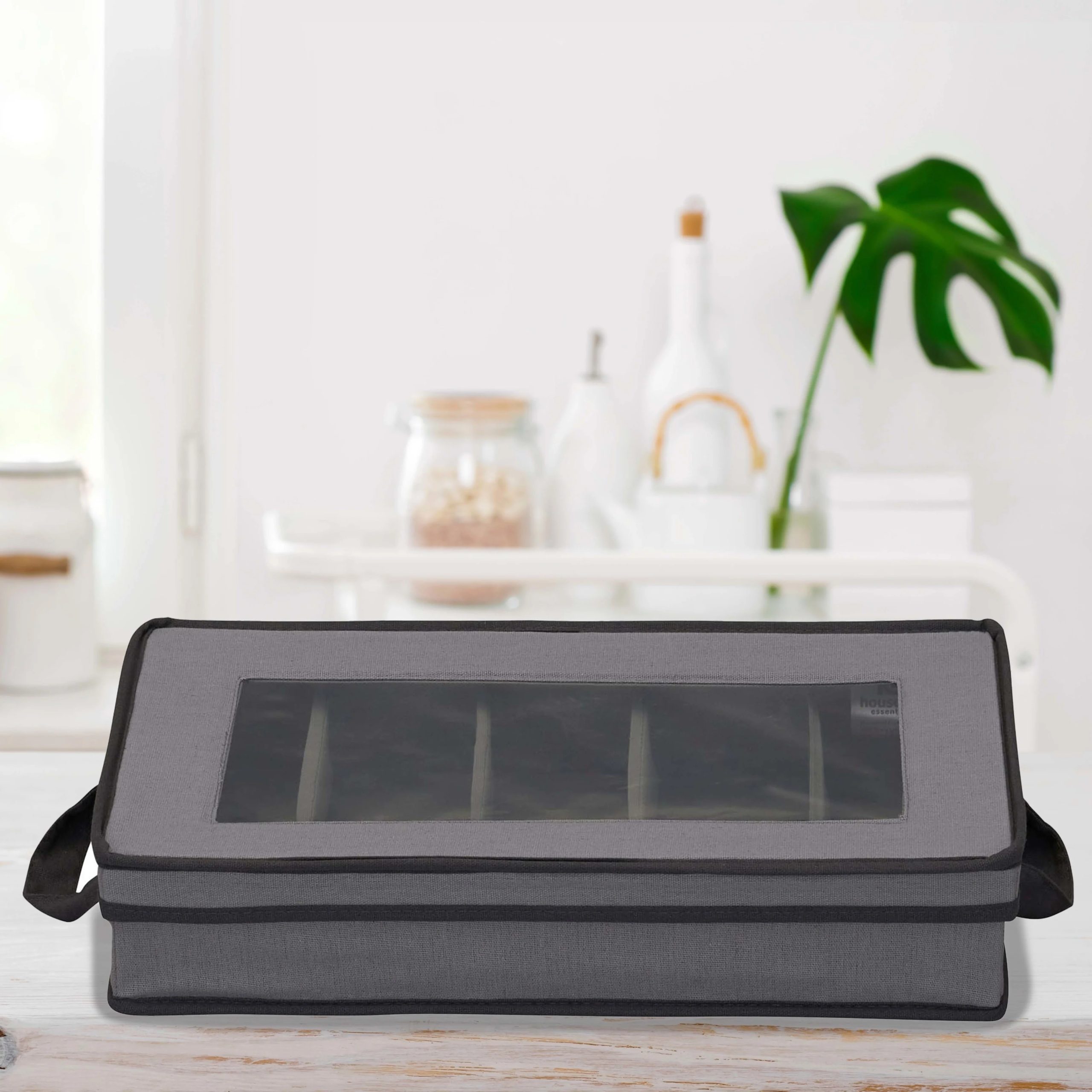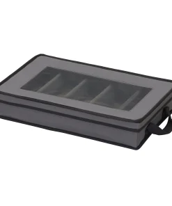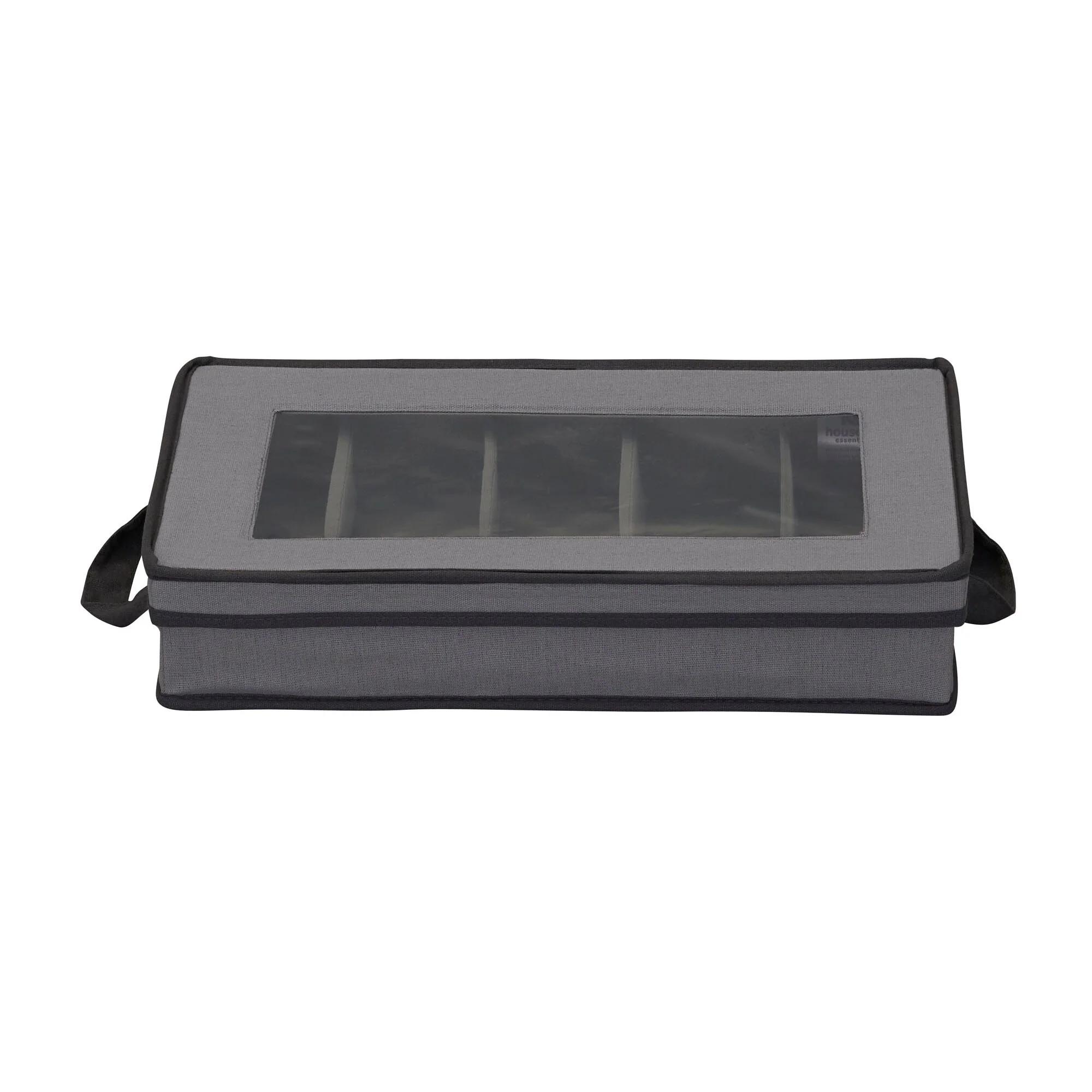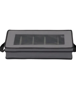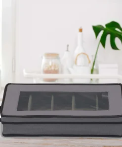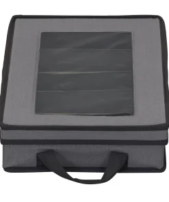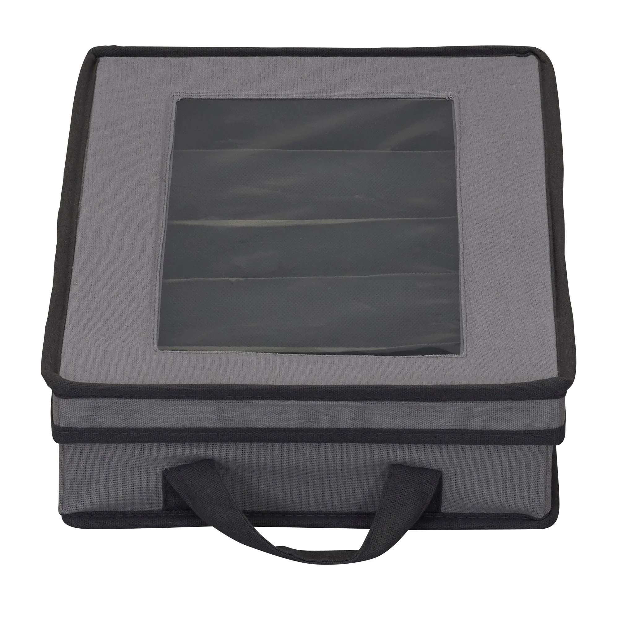 Chipped soup bowls and cracked plates will no longer be a worry with the use of this large serveware storage box. Its attractive but minimalist style makes it perfect for leaving out on display or tucked away in a storage closet. This storage box is made of a durable polyester canvas lining over sturdy fiberboard sides. This provides the necessary structure to protect items inside from becoming crushed and allows multiple to be stacked on top of each other. A pair of reinforced handles make for comfortable carrying to and from storage. With this box comes 3 padded pouches for protecting various serveware. These pouches come in 3 different sizes to accommodate for rectangular trays, square or circular trays and serving bowls. Storing rectangular tray (16.75"W x 15"D x 2"H), square or round tray (15.75"W and D x 2"H), and bowl (10.75"DIA x 5.5"H) The fully removable lid will make loading and unloading items from this box hassle-free. Meanwhile, the see-through front panel provides a look into the box’s contents without needing to remove the lid. This will make sifting through boxes of dishware, holiday ornaments and other items in storage quick and easy. With a much longer lifespan than a traditional cardboard box with indecipherable labeling, this canvas serveware storage box is the perfect way to preserve your holiday or specialty dinnerware. No assembly is required, and the box folds flat for compact storage when not in use.