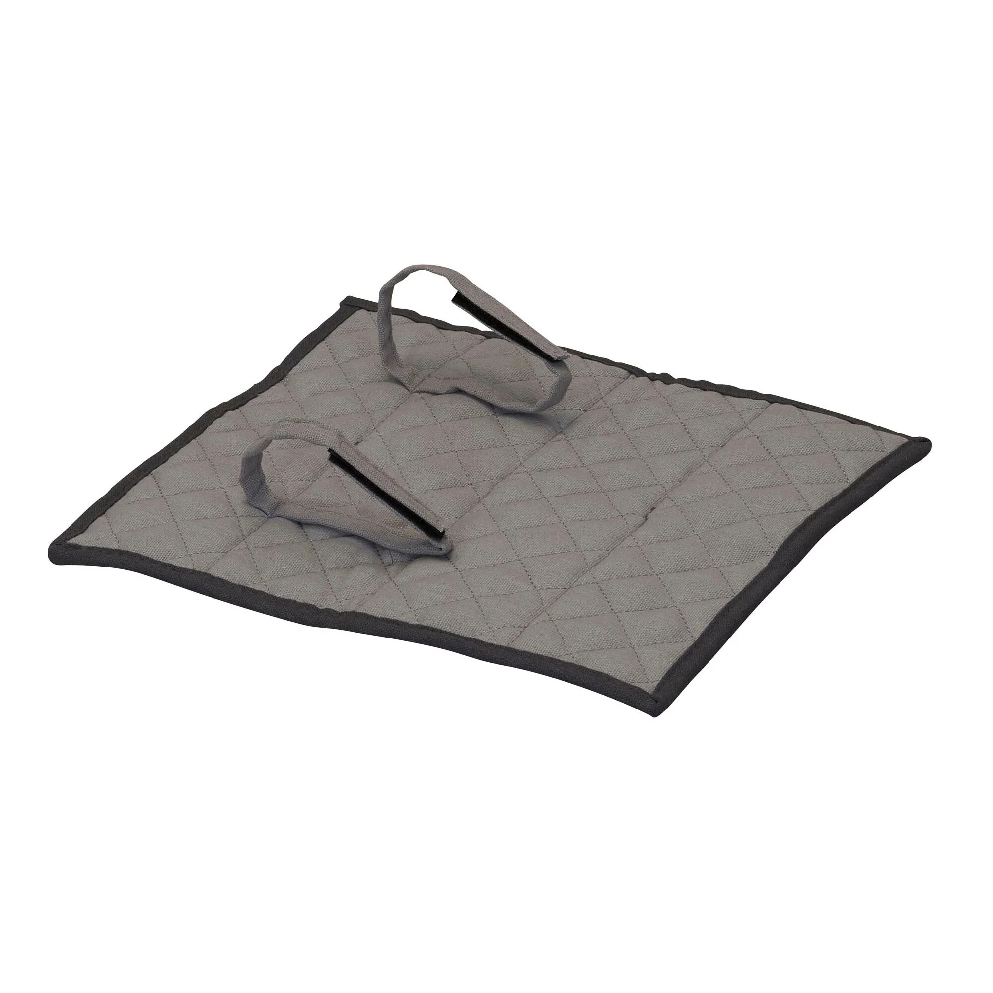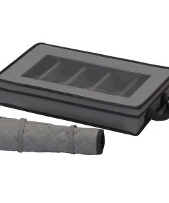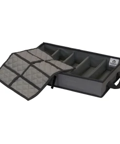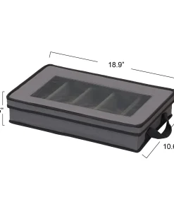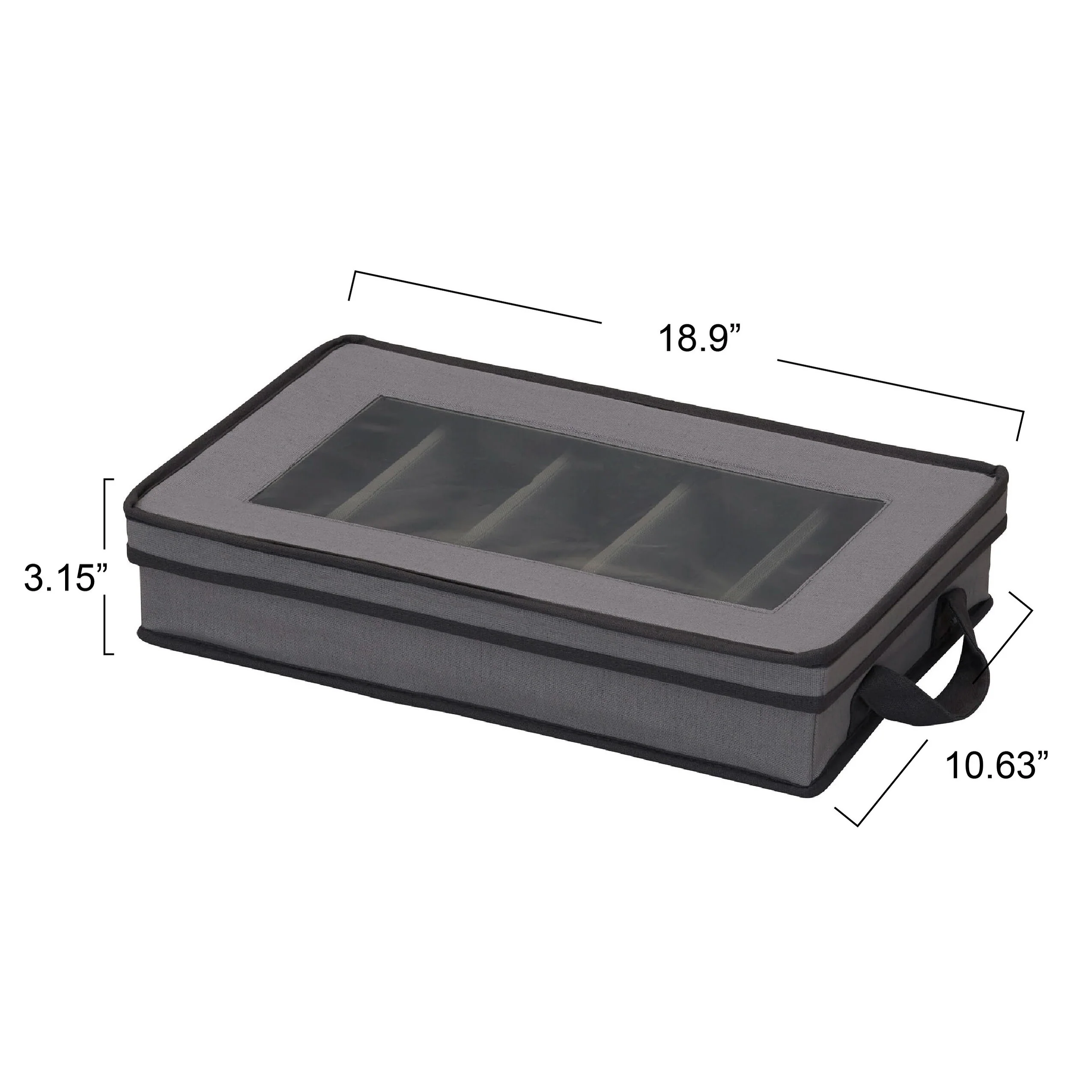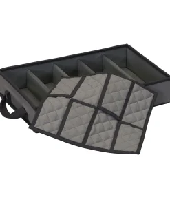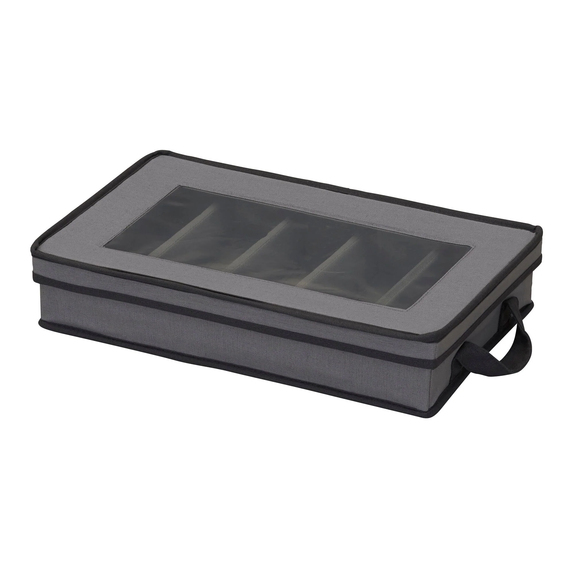 Chipped soup bowls and cracked plates will no longer be a worry with the use of this large serveware storage box. Its attractive but minimalist style makes it perfect for leaving out on display or tucked away in a storage closet. This storage box is made of a durable polyester canvas lining over sturdy fiberboard sides. This provides the necessary structure to protect items inside from becoming crushed and allows multiple to be stacked on top of each other. A pair of reinforced handles make for comfortable carrying to and from storage. With this box comes 3 padded pouches for protecting various serveware. These pouches come in 3 different sizes to accommodate for rectangular trays, square or circular trays and serving bowls. Storing rectangular tray (16.75"W x 15"D x 2"H), square or round tray (15.75"W and D x 2"H), and bowl (10.75"DIA x 5.5"H) The fully removable lid will make loading and unloading items from this box hassle-free. Meanwhile, the see-through front panel provides a look into the box’s contents without needing to remove the lid. This will make sifting through boxes of dishware, holiday ornaments and other items in storage quick and easy. With a much longer lifespan than a traditional cardboard box with indecipherable labeling, this canvas serveware storage box is the perfect way to preserve your holiday or specialty dinnerware. No assembly is required, and the box folds flat for compact storage when not in use.