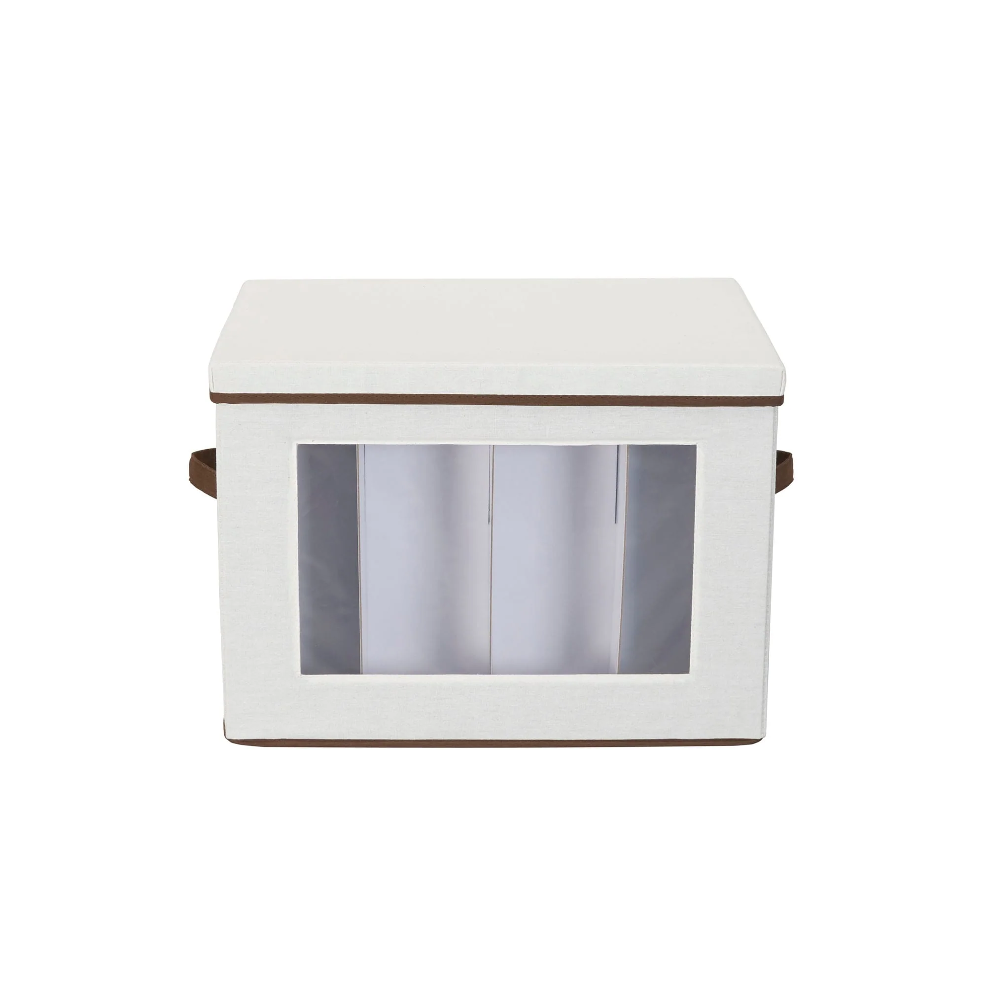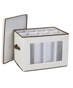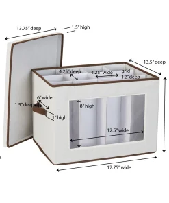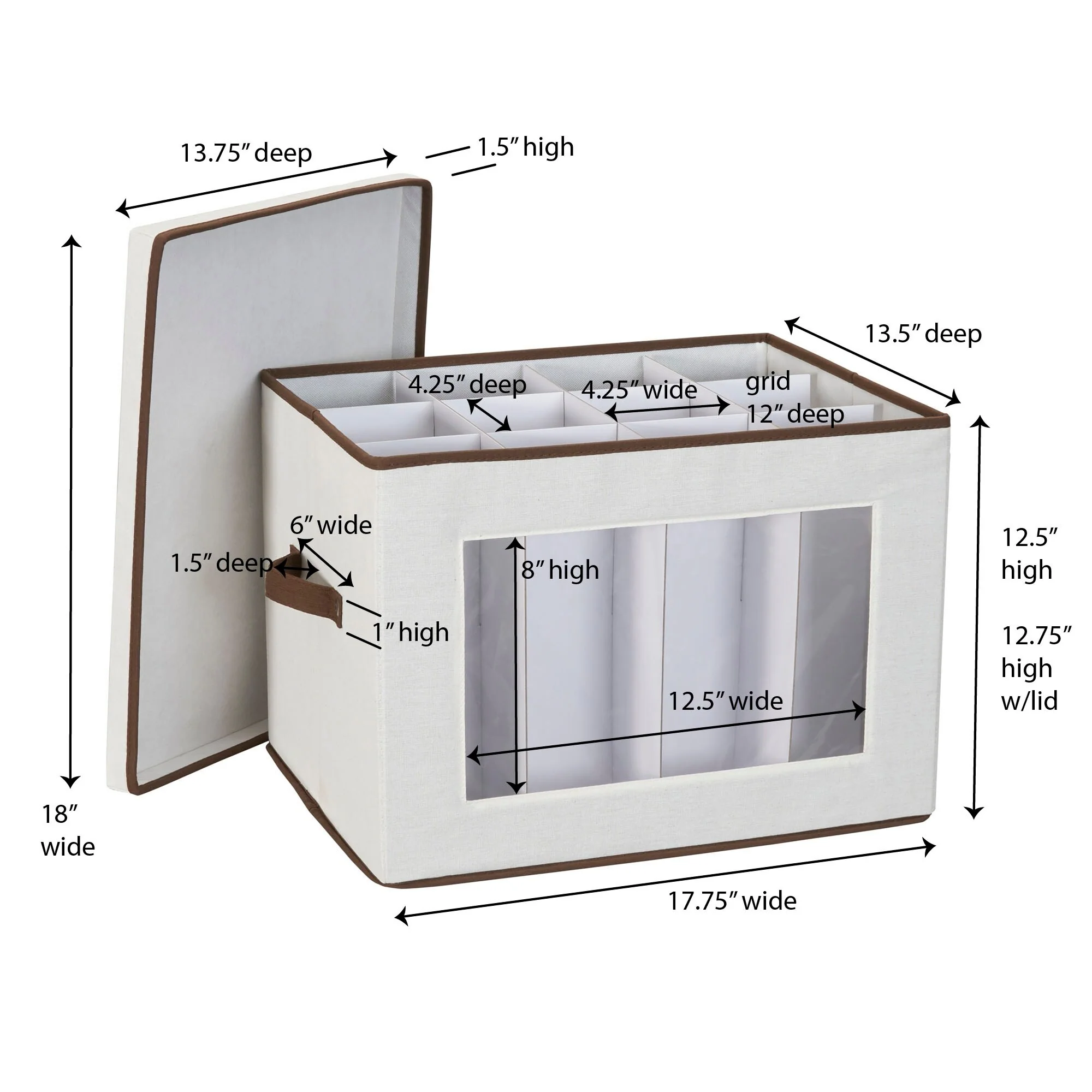 This stylishly versatile wine storage chest will transform a cluttered pantry or home bar by discreetly corralling bottles, while maintaining easy access to its contents; Holds wine glasses up to 12 inches tall; Equipped with 12 slots, a fully removable lid, strong riveted handles, and a window-vision panel, this storage chest is perfect for protecting your favorite libations, or transporting bottles to a dinner party; Each chest measures 14" L x 18" W x 13" HÂ