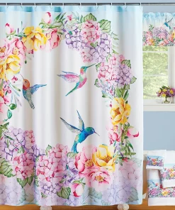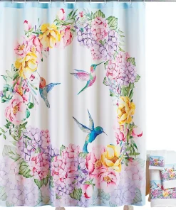 With beautiful colors and a lovely design, this printed curtain features bright hummingbirds surrounded by a wreath of pink, purple and yellow flowers. The curtain has a sky blue background and hooks are included. Machine wash. Plastic hooks and polyester curtain; imported. 72"L x 70"W.