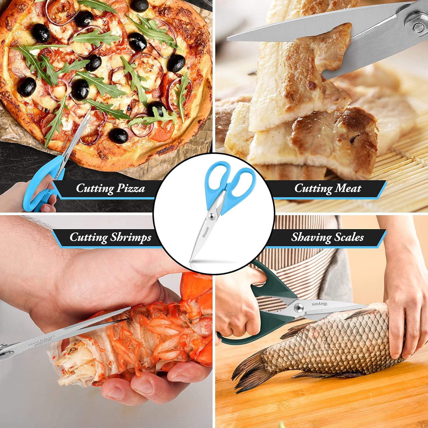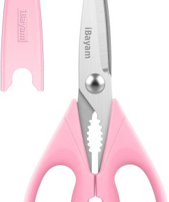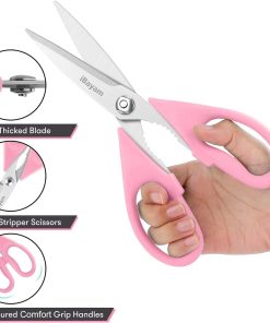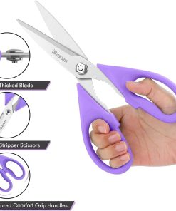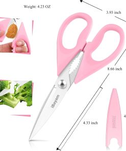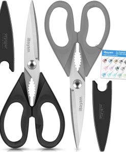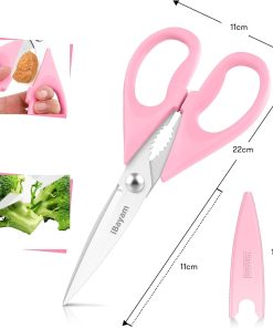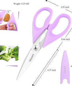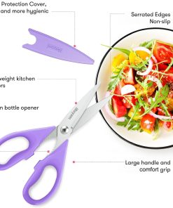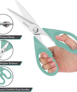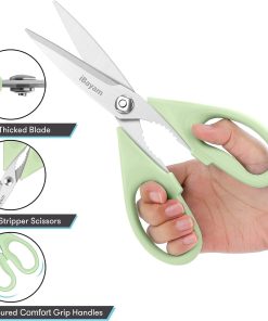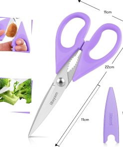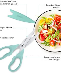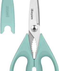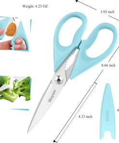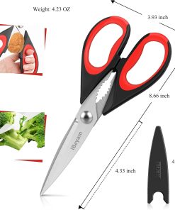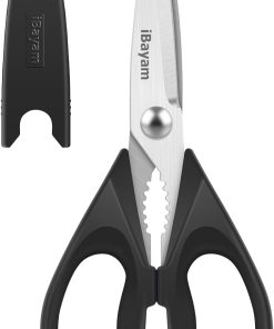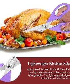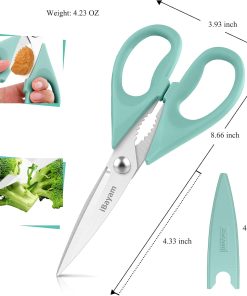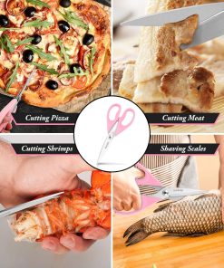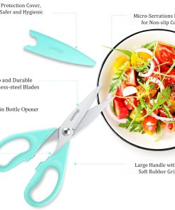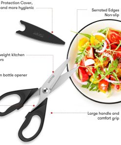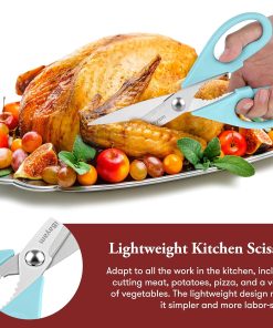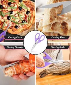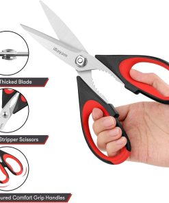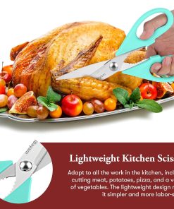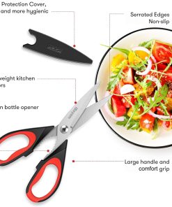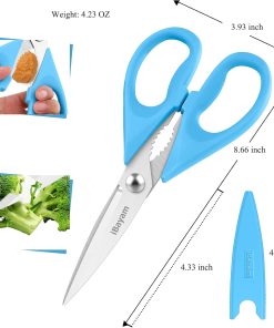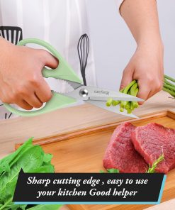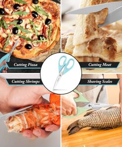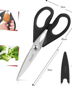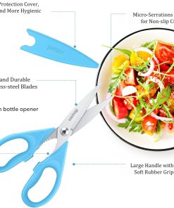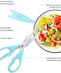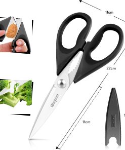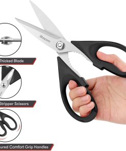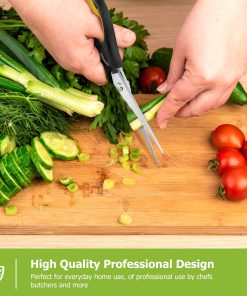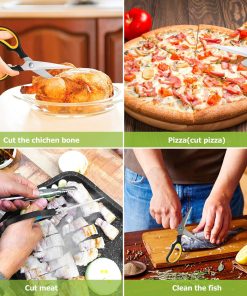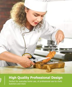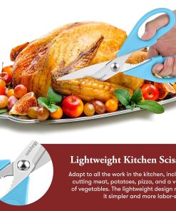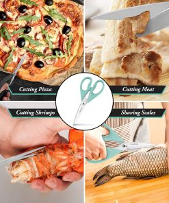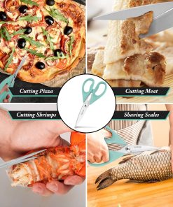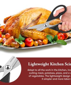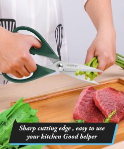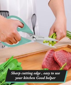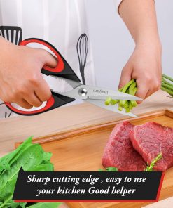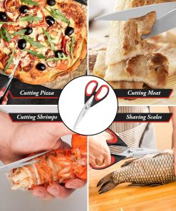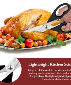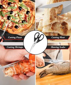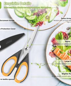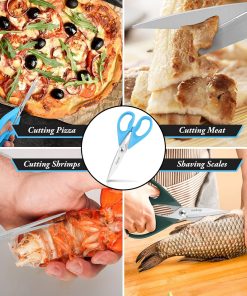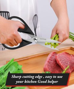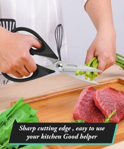 - STAINLESS STEEL SHARP BLADES: Quality hardened stainless steel blades easily cut through cardboard, twine, food, meat, vegetables, chicken, poultry, fish, herbs, seafood, BBQ, food packing bags, and more. Great as Food Scissors, Meat Scissors, Cooking Scissors, Scissors Kitchen, Cooking Shears, Poultry Scissors, Utility Scissors, Meat Cutting Scissors.