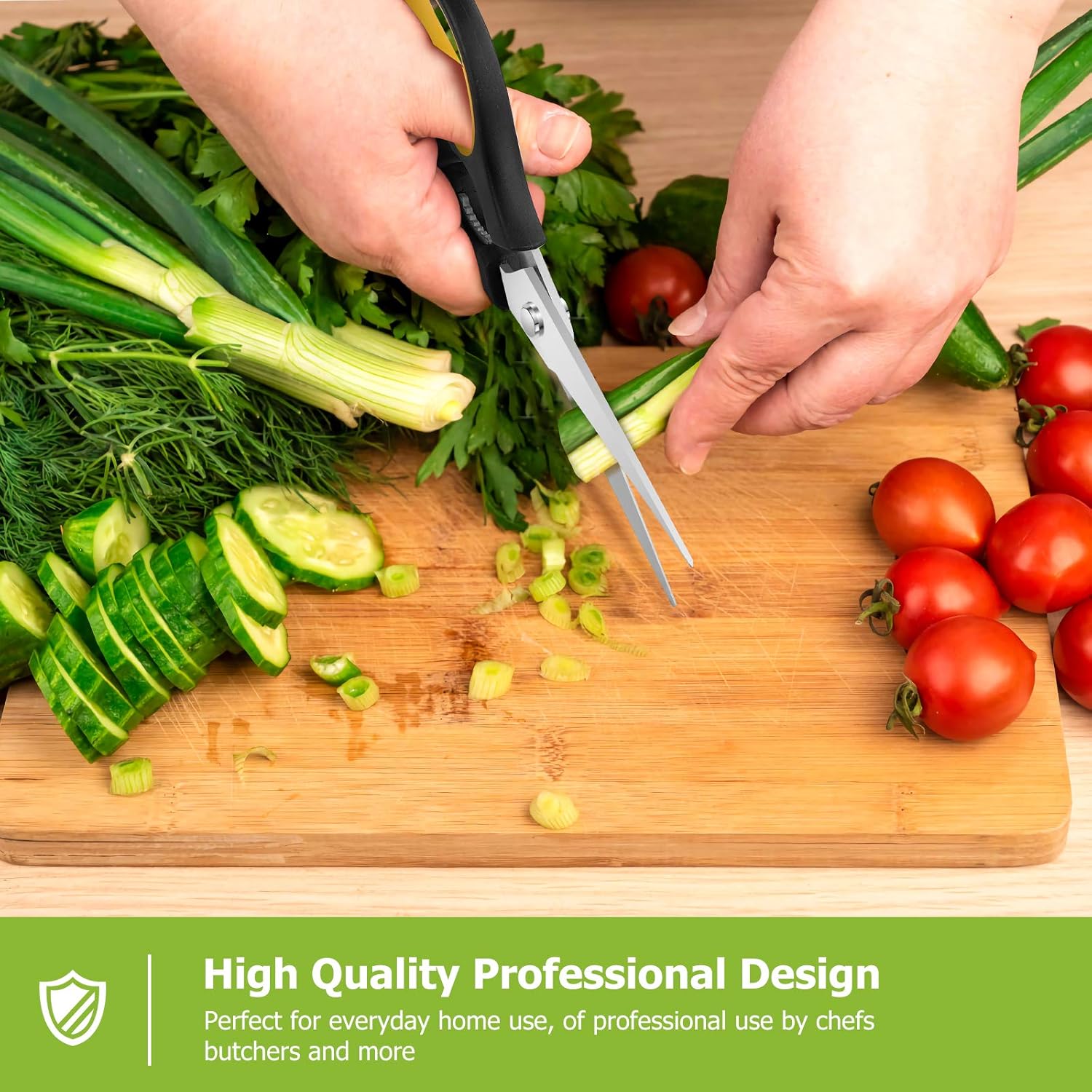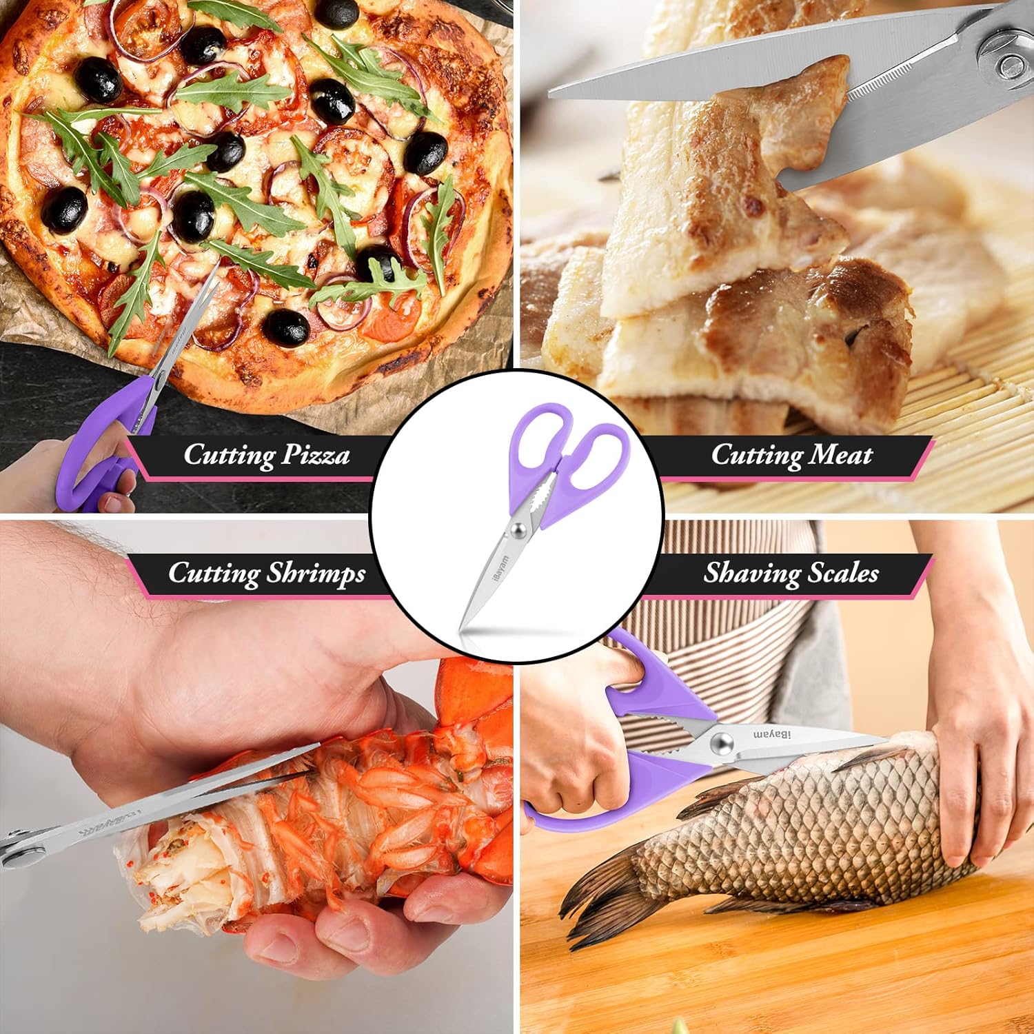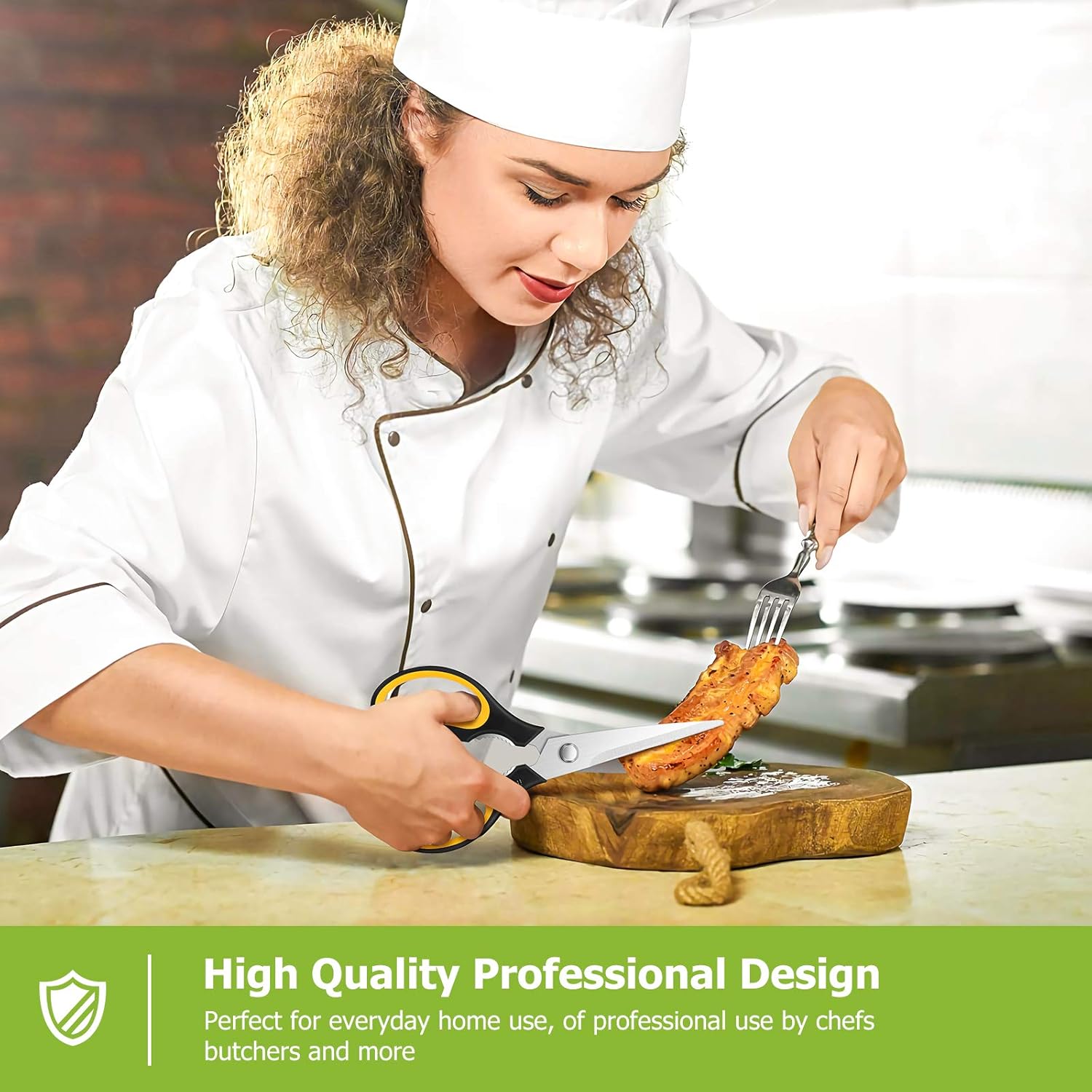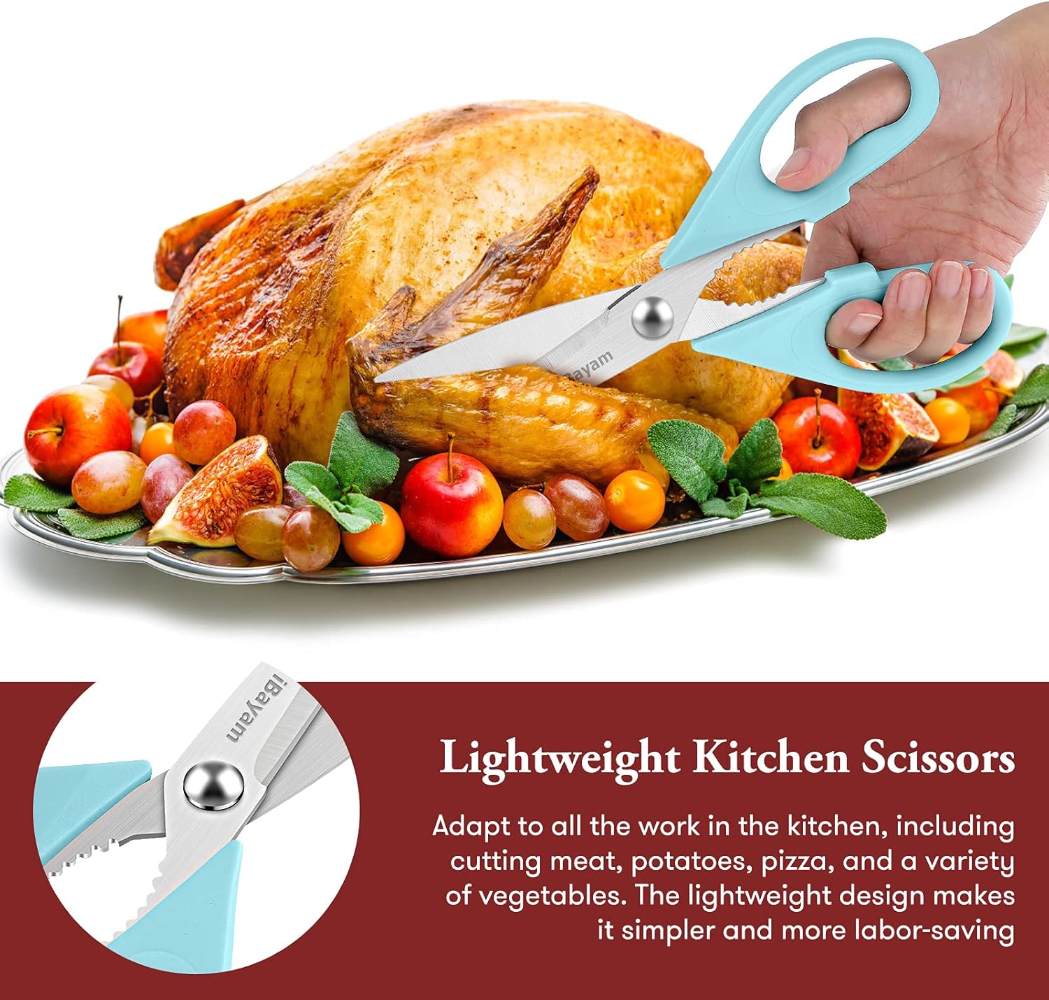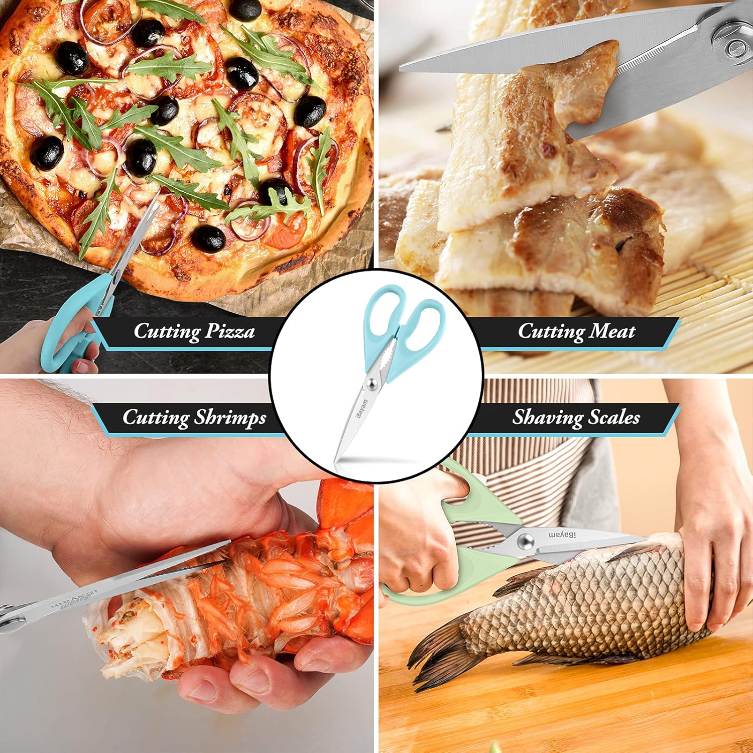 - STAINLESS STEEL SHARP BLADES: Quality hardened stainless steel blades easily cut through cardboard, twine, food, meat, vegetables, chicken, poultry, fish, herbs, seafood, BBQ, food packing bags, and more. Great as Food Scissors, Meat Scissors, Cooking Scissors, Scissors Kitchen, Cooking Shears, Poultry Scissors, Utility Scissors, Meat Cutting Scissors.