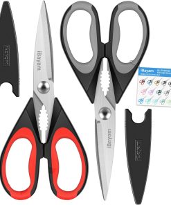 - VERSATILE COLORFUL kitchen scissors, black red, black grey. Different color handles can be used in different places, 2 special scissors are suitable for most items that need to be cut, worth looking forward to multiple uses around the home. It can also be used as a household scissors for all kinds of fruit, noodles and pizza.