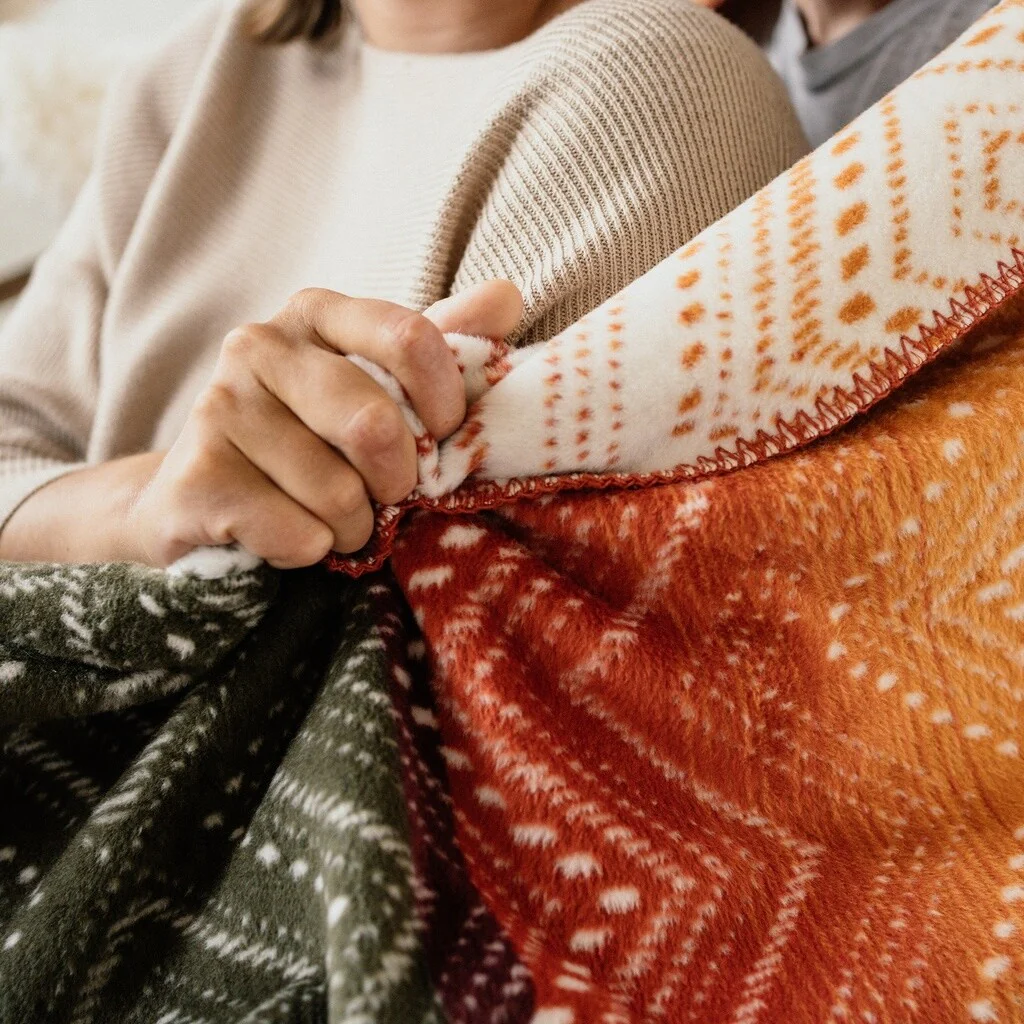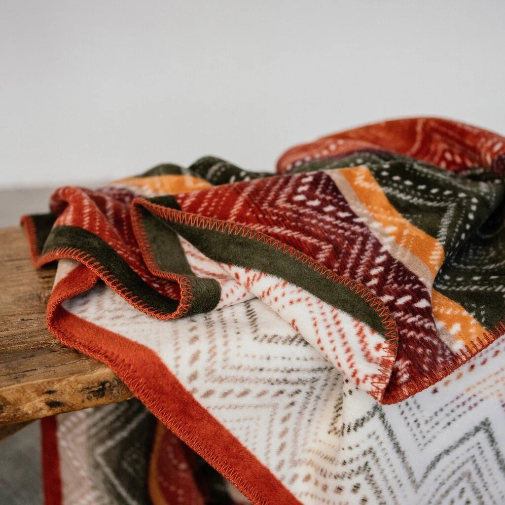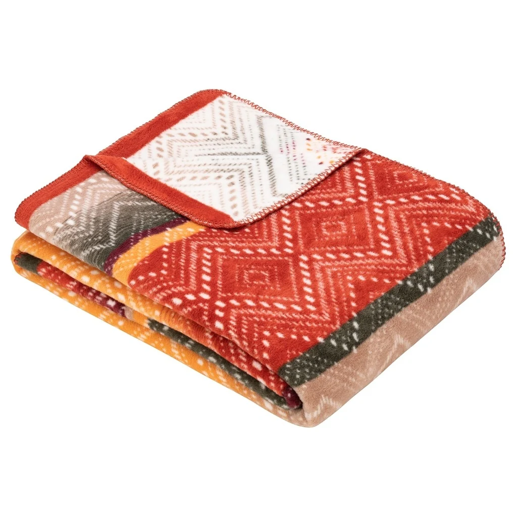 This lovely throw offers a fun, tribal pattern that reminds us to find our connection with external resources. With its ethnic charm, the pattern dances along playfully like the flames in a fire pit. Enjoy early mornings with a warm beverage, and take the freedom of the outdoors into your interior decor. The vibrant colors serve as a fun and exotic reminder of something larger than ourselves. This blanket is also reversible with inverted colors for the choice of a bold statement or just a sprinkle of color. It is made with the highest quality dyed yarns so that the colors won’t fade during the wash. Its woven surface has been raised and sheared to a high pile velour to resist pilling.  Incredibly soft and fun, this blanket is sure to draw attention and last for years to come. Â