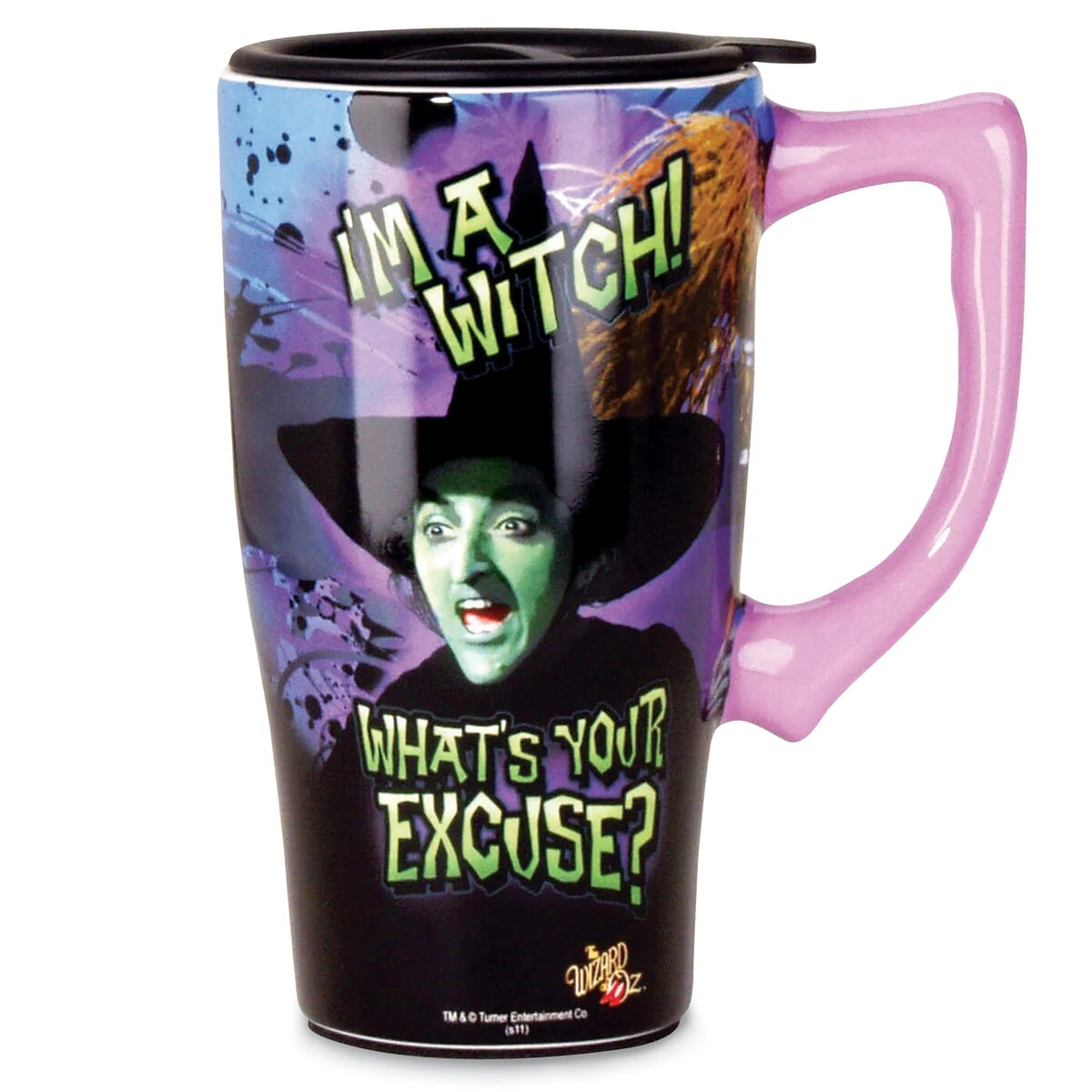 Are you a little crabby before your morning coffee? A great gift for any fan of the classic film, The Wizard of Oz, this insulated ceramic travel mug features a colorful image of The Wicked Witch and reads, "I’m a Witch! What’s your excuse?" The mug fits inside most vehicle cup holders, has a locking lid and skid-resistant bottom. Measures approx. 6 1/2"H and holds 18 oz. of your favorite hot or cold beverage. Microwave and dishwasher safe. Ceramic.