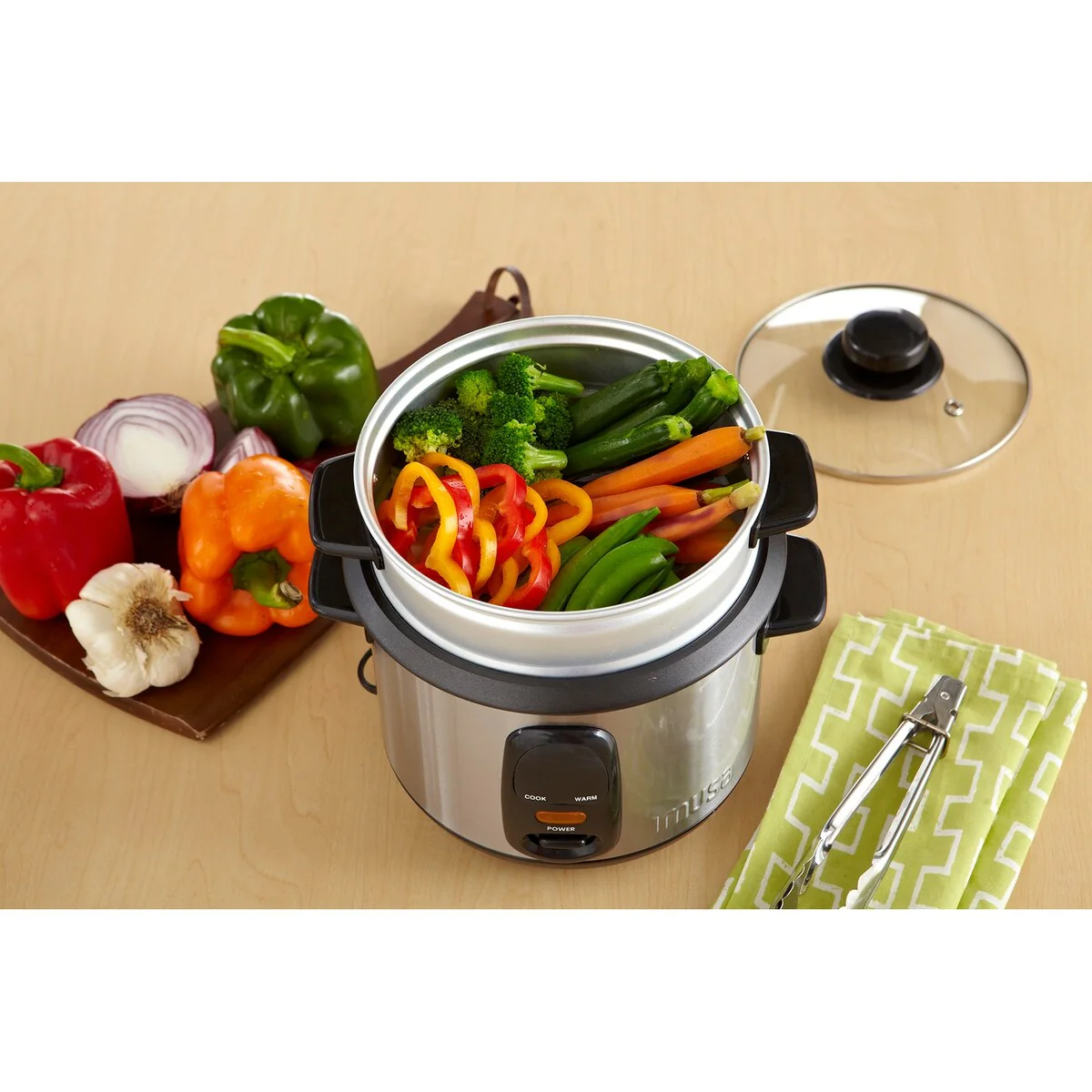 The IMUSA Stainless Steel Rice Cooker will make the perfect rice dish at the touch of a switch. The steam tray will allow you to steam your foods while your rice cooks in the pot below! Cleaning is easy with the removable nonstick coated pot, which prevents your rice and other foods from sticking. Make your favorite rice dishes, vegetables, oatmeal, and more with your IMUSA Stainless Steel Rice Cooker.Â