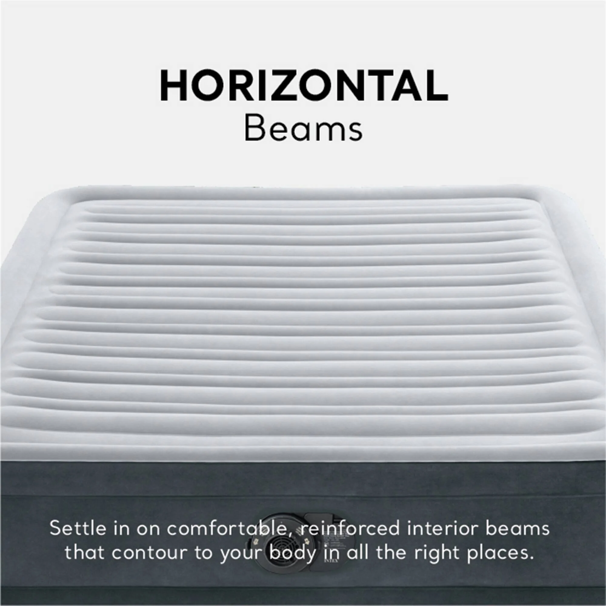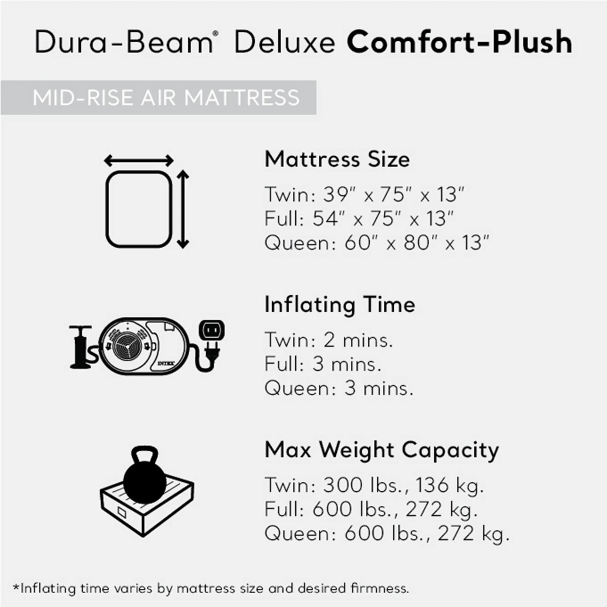 Cozy, compact, and too comfortable for words, this Intex Dura-Beam Plush Queen Air mattress is there to help you drift off into dreamland peacefully wherever you lay your head down.This airbed provides dreamy nights of shut-eye camping, on vacation, in dorm rooms, or for the guests in your home. With a built-in air pump, it inflates and deflates with the switch of a button and can be adjusted to your desired level of firmness using the dial.The air mattress makes it simple to get in and out of and the Dura-Beam technology construction has high-strength polyester fibers that won’t stretch over time. It’s ultra-lightweight, can hold up to 300 pounds, and comes with a carry bag for your convenience.Catch a good night of Zzz’s with this Intex Dura-Beam Plush Queen Air mattress and feel at home every time you inflate it.