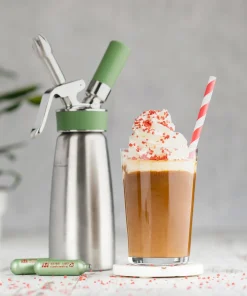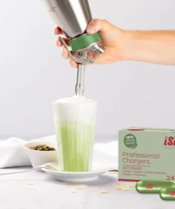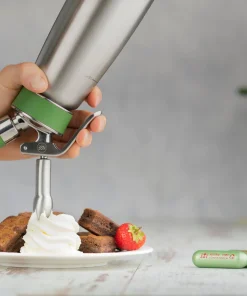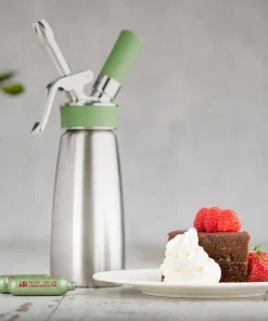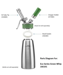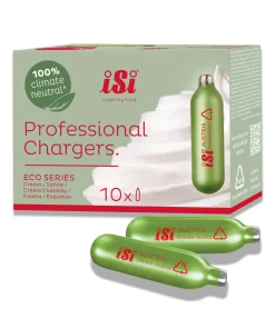 Elevate your culinary creations with the iSi North America Eco Series Professional Green Whip Cream Dispensers and Cream Chargers. This innovative system is designed for professionals who value sustainability, efficiency, and flavor versatility. The 1-pint stainless steel dispenser is perfect for crafting everything from fresh whipped cream to plant-based vegan toppings, making it a must-have for coffee shops, ice cream parlors, bakeries, and beyond. Engineered to save you time and resources, this high-yield whipper provides up to 15% more servings, lowering food costs while meeting the demands of busy kitchens. The Eco Series chargers, made from recyclable steel, deliver 8.4g of nitrous oxide, ensuring consistent performance while reducing your environmental impact.  The sealed storage system preserves the freshness of your whipped creations for up to 10 days in the refrigerator, maintaining quality without the need for artificial preservatives. The stainless steel dispenser boasts a durable, hygienic design with dishwasher-safe components for effortless cleaning. Every set includes essential accessories: a stainless steel tulip tip, head valve, silicone gasket, and a cleaning brush, making setup and maintenance straightforward. For best results, pair the whipper exclusively with iSi Eco Series chargers, which are optimized for this system. Experience the benefits of a professional-grade tool that prioritizes sustainability, creativity, and operational efficiency. With the iSi Eco Series Green Whip and Professional Cream Chargers, you’ll transform your kitchen’s potential while supporting a sustainable future.  DISCLAIMER: By ordering iSi chargers, you confirm you are at least 18 or meet the legal age requirement and will not misuse the product or supply it to minors. If purchasing for a third party, you agree to inform them of applicable terms. You must comply with all relevant laws. Neither the marketplace nor the seller assumes liability for product use.