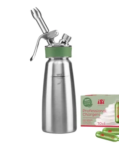 Elevate your culinary creations with the iSi North America Eco Series Professional Green Whip Cream Dispensers and Cream Chargers. This innovative system is designed for professionals who value sustainability, efficiency, and flavor versatility. The 1-pint stainless steel dispenser is perfect for crafting everything from fresh whipped cream to plant-based vegan toppings, making it a must-have for coffee shops, ice cream parlors, bakeries, and beyond. Engineered to save you time and resources, this high-yield whipper provides up to 15% more servings, lowering food costs while meeting the demands of busy kitchens. The Eco Series chargers, made from recyclable steel, deliver 8.4g of nitrous oxide, ensuring consistent performance while reducing your environmental impact.  The sealed storage system preserves the freshness of your whipped creations for up to 10 days in the refrigerator, maintaining quality without the need for artificial preservatives. The stainless steel dispenser boasts a durable, hygienic design with dishwasher-safe components for effortless cleaning. Every set includes essential accessories: a stainless steel tulip tip, head valve, silicone gasket, and a cleaning brush, making setup and maintenance straightforward. For best results, pair the whipper exclusively with iSi Eco Series chargers, which are optimized for this system. Experience the benefits of a professional-grade tool that prioritizes sustainability, creativity, and operational efficiency. With the iSi Eco Series Green Whip and Professional Cream Chargers, you’ll transform your kitchen’s potential while supporting a sustainable future.  DISCLAIMER: By ordering iSi chargers, you confirm you are at least 18 or meet the legal age requirement and will not misuse the product or supply it to minors. If purchasing for a third party, you agree to inform them of applicable terms. You must comply with all relevant laws. Neither the marketplace nor the seller assumes liability for product use.